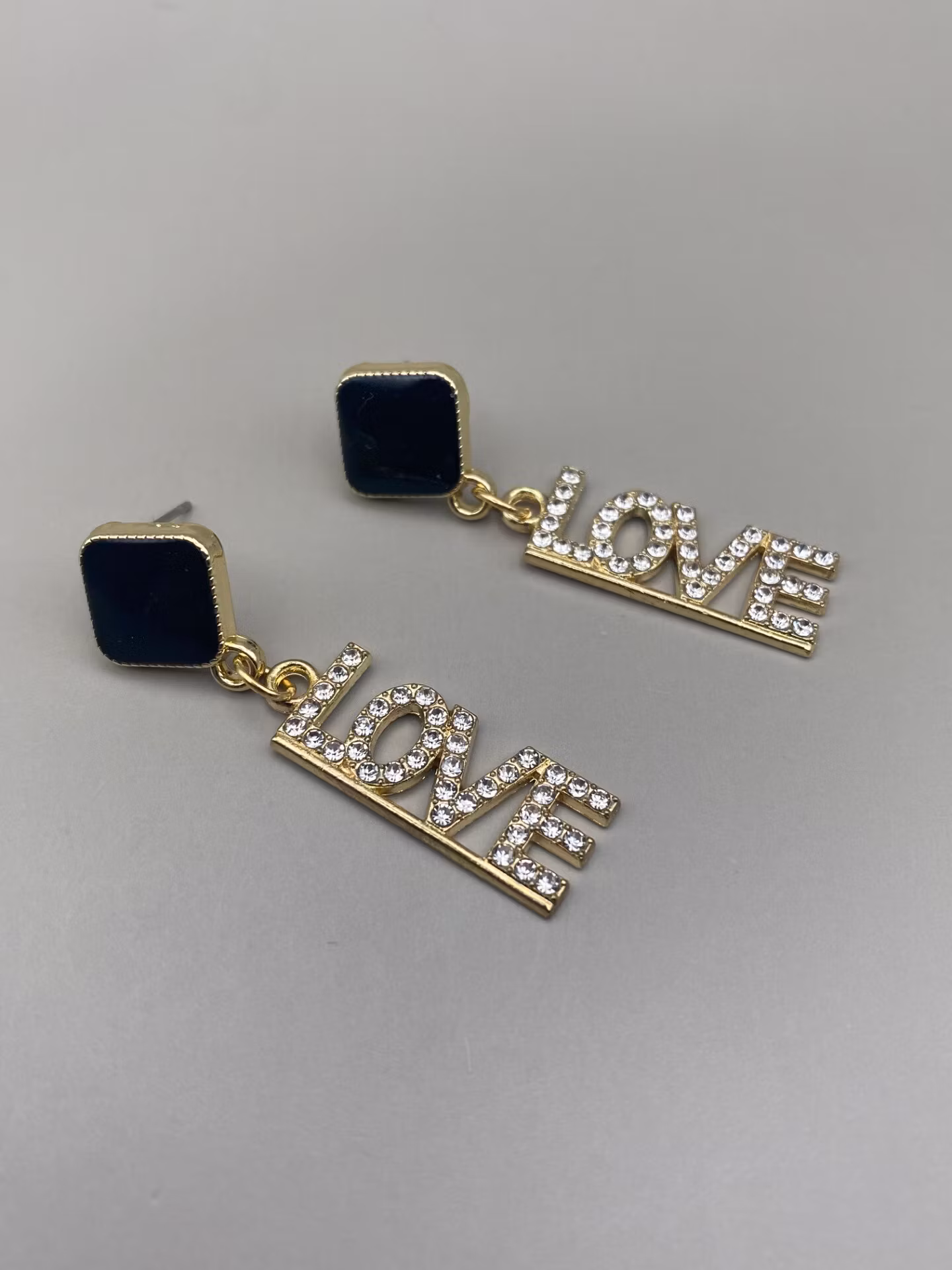 Tuffa svarta fyrkantiga örhängen med guldfärgad kristallprydd berlock med texten LOVE