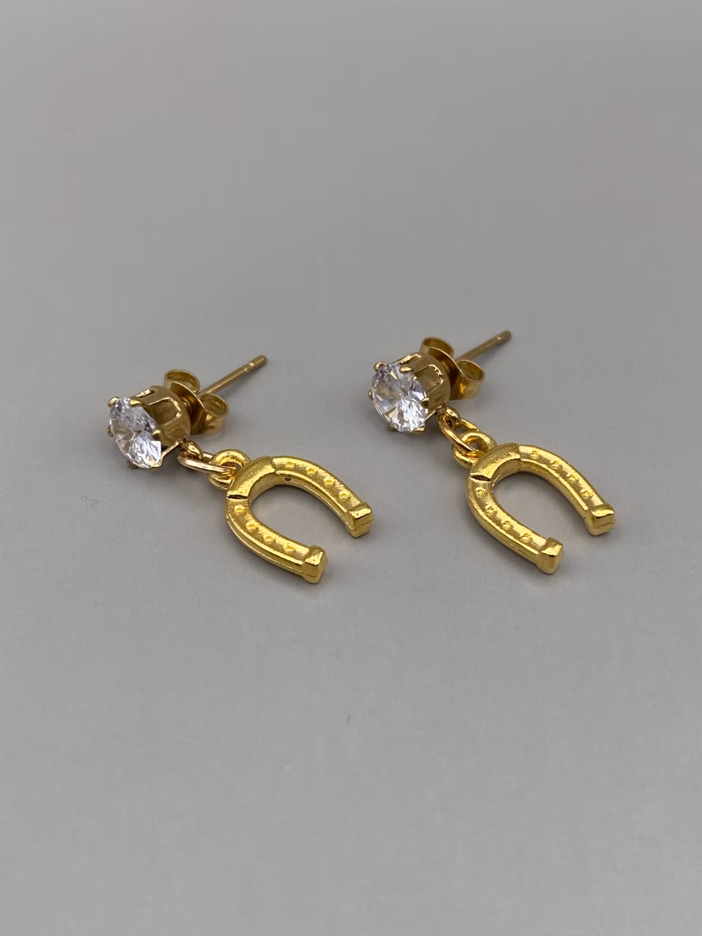 Örhängen med skimrande cubic zircona och hängande guldfärgad hästsko.