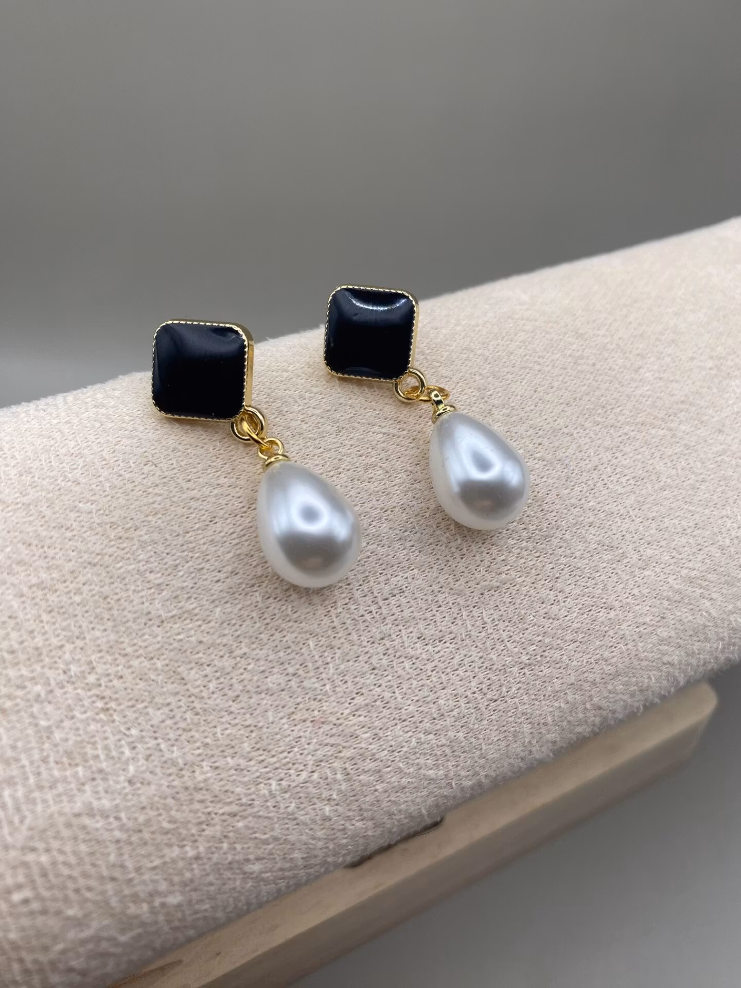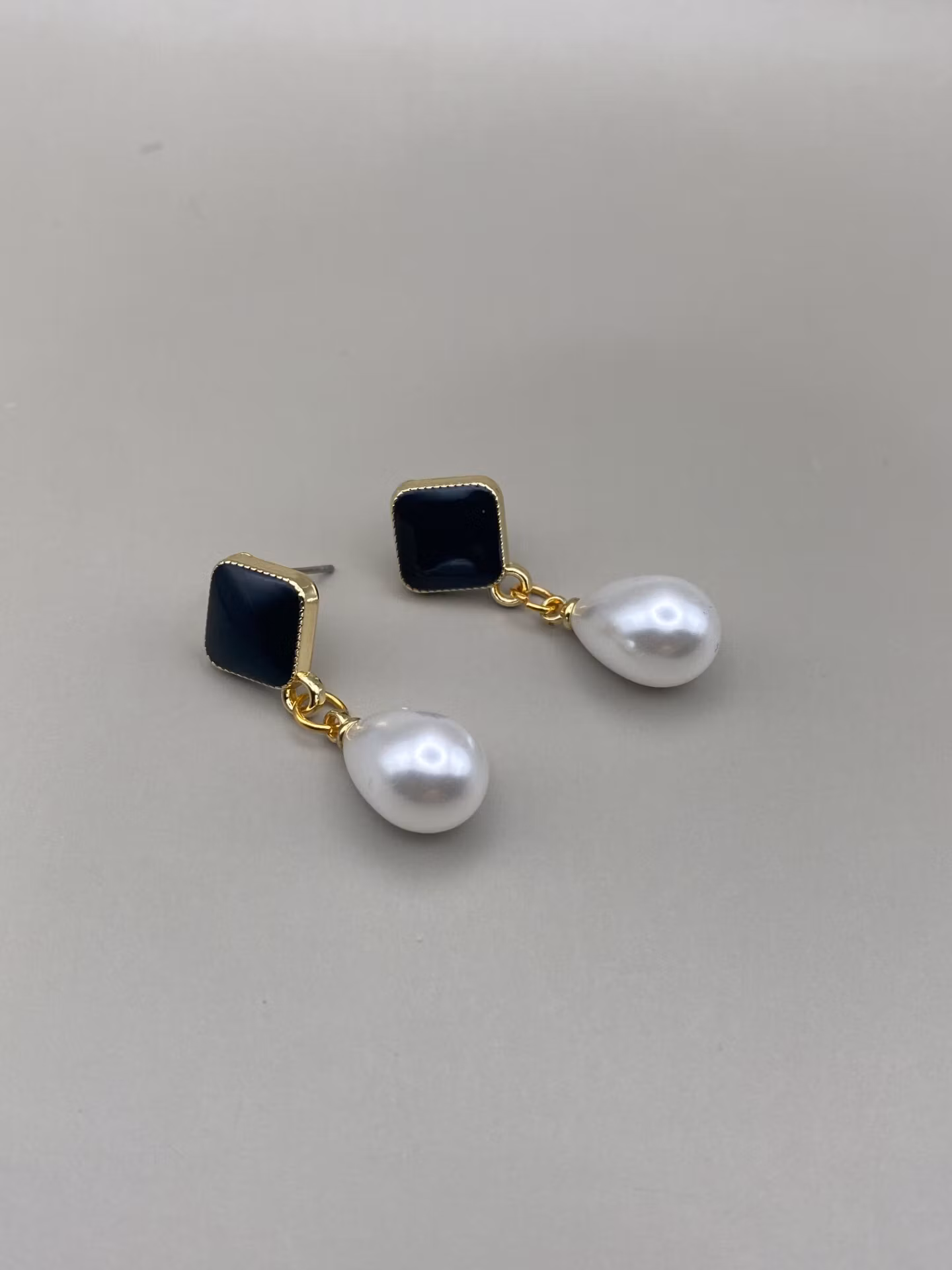 Eleganta örhängen med svart fyrkantig platta och vacker större droppformad elefenbensvit pärla.