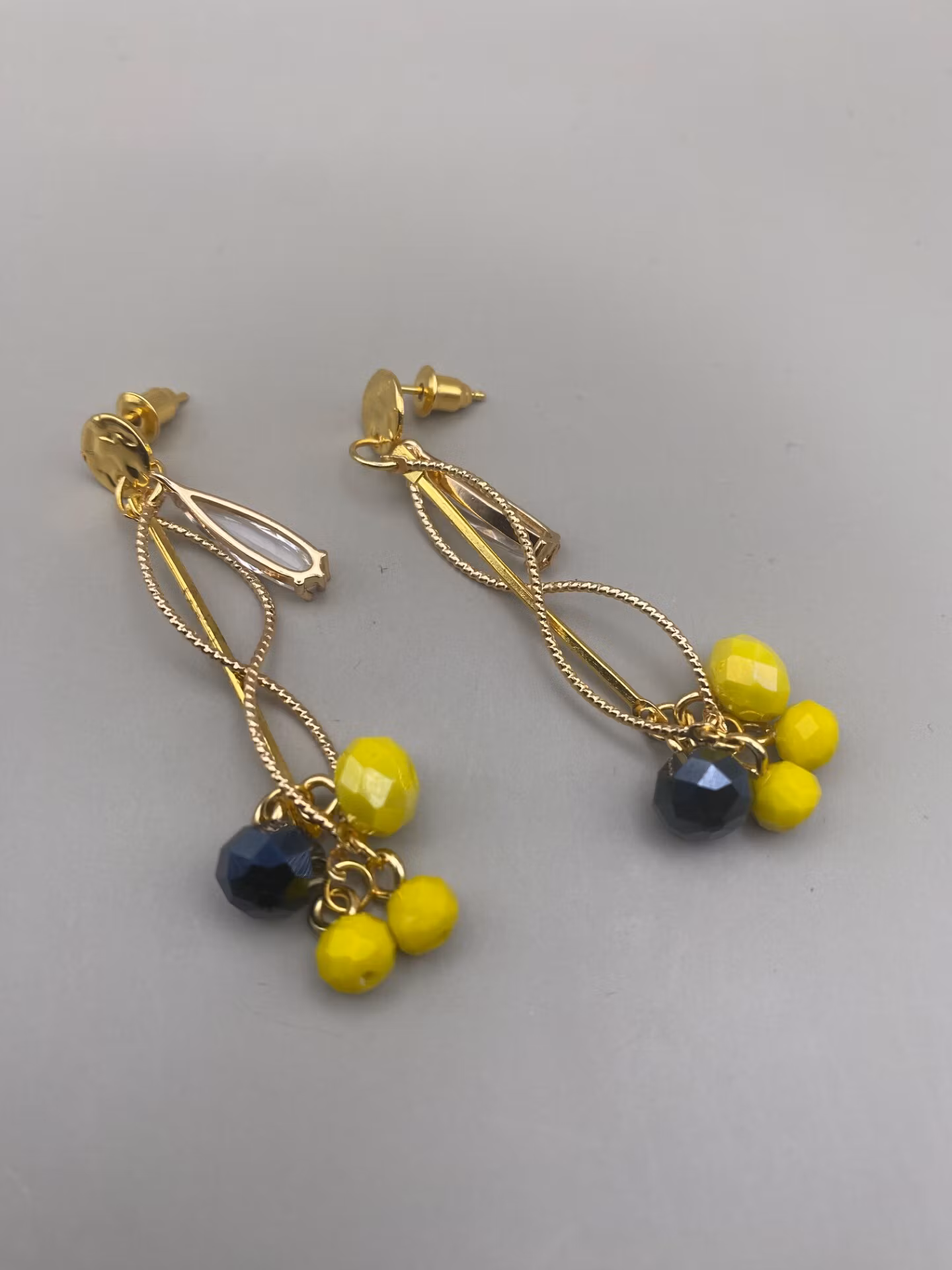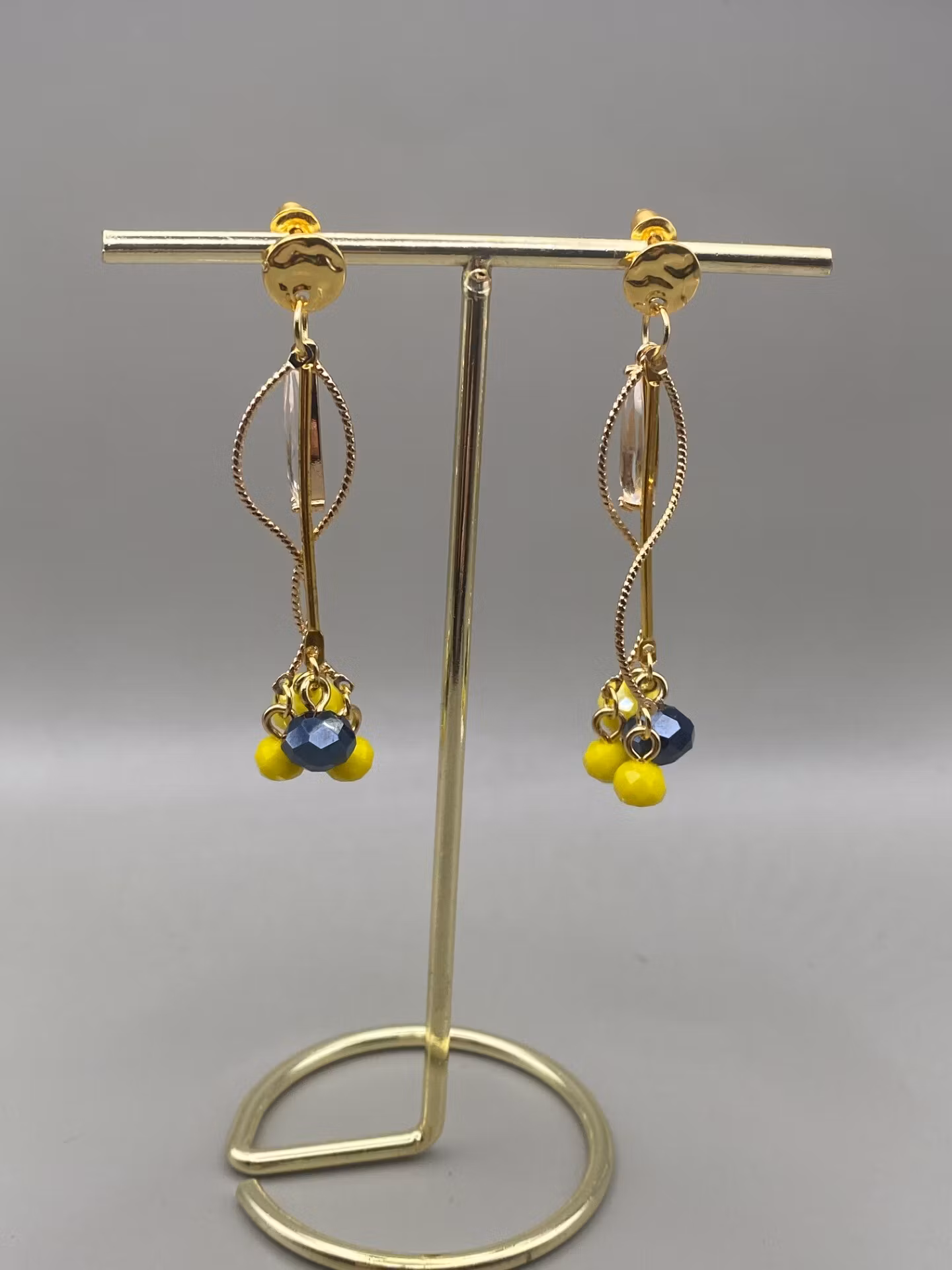 Guldfärgade örhängen med ”bankad” bricka med vackra dekorativa kurviga stänger med hängande citrongula och midnattsblå facetterade glaspärlor, samt ett hänge i form av avlång glaspärla.