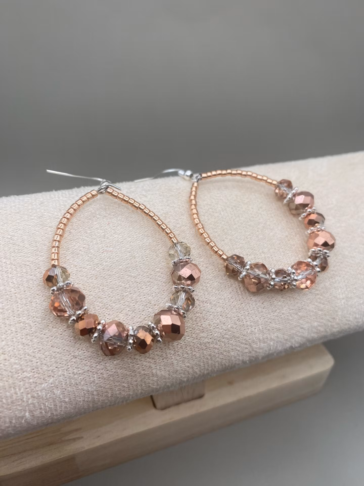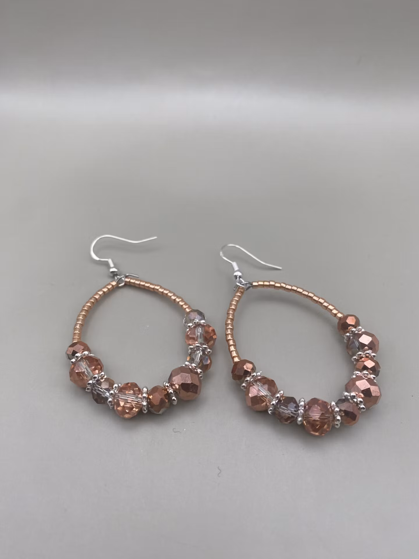 Vackert skimrande droppformade örhängen i roséfärgade små glaspärlor runt om, varvat stora och något mindre aprikos- och silvermellerade facetterade glaspärlor i blickfånget, varvat med silverfärgade distanser.