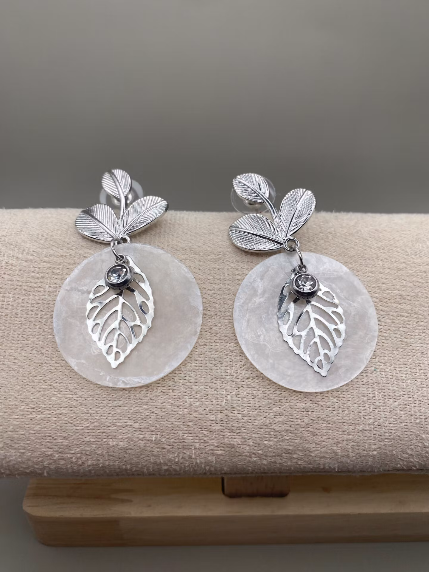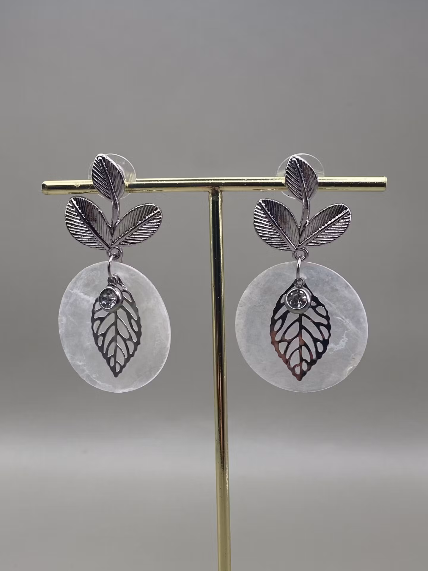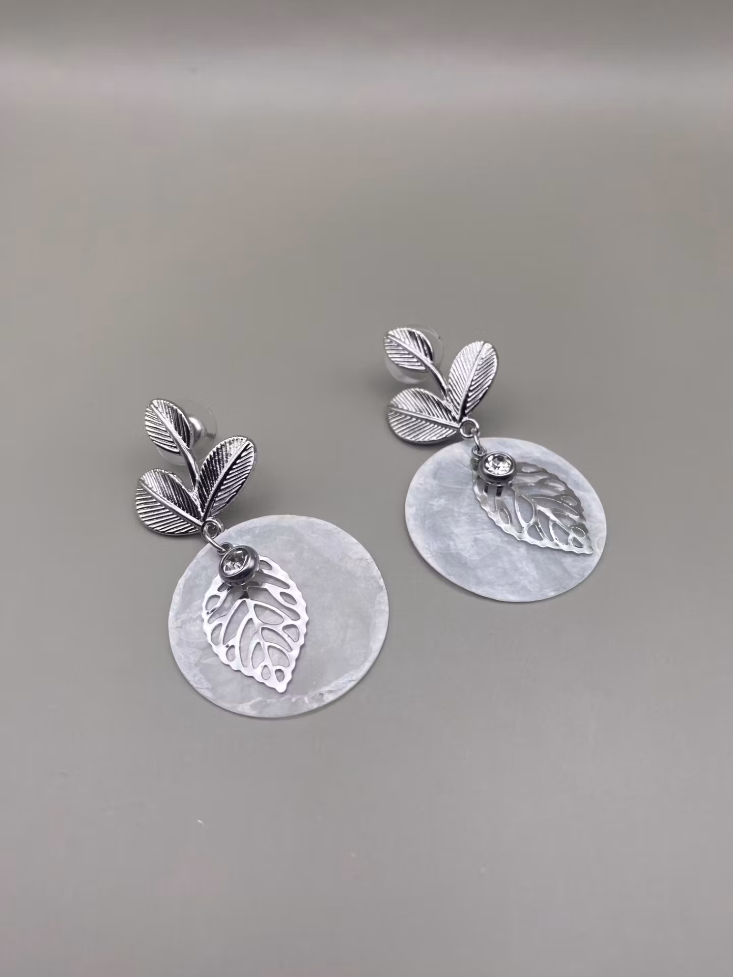 Silverfärgade vackra örhängen i form tre små blad med hänge av ett runt vitt lövtunt snäckskal, dekorerad med silverfärgat löv och silverfärgat mindre hänge med vit glassten.