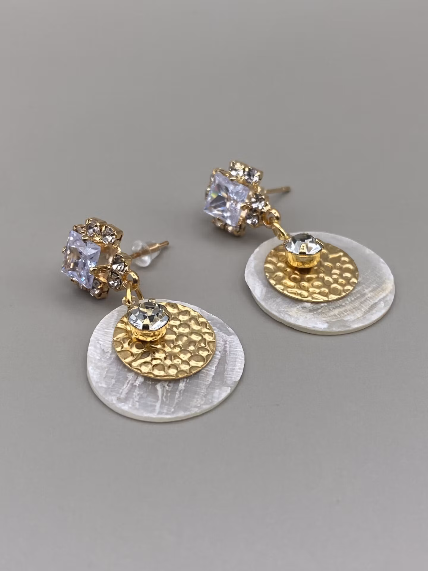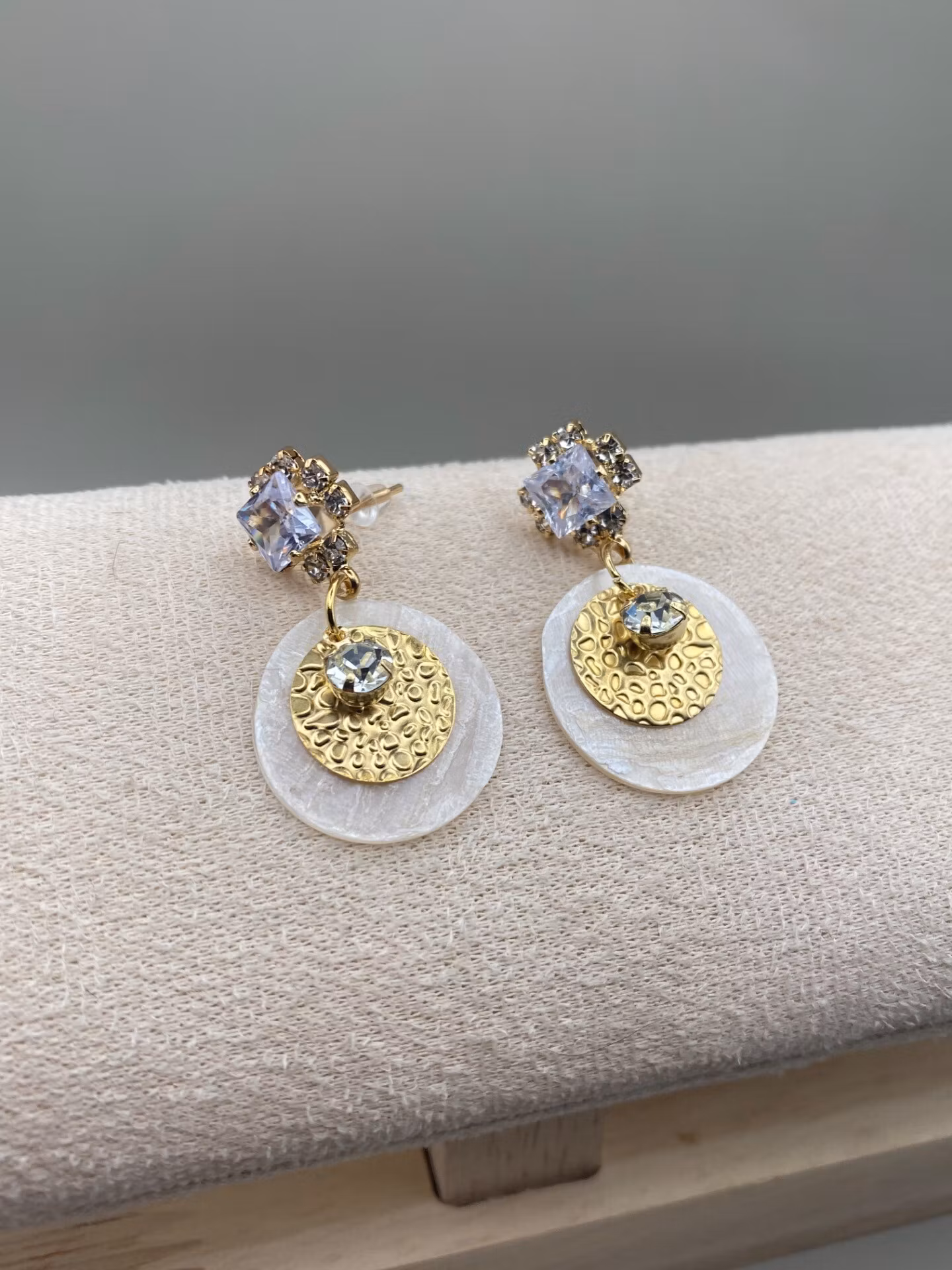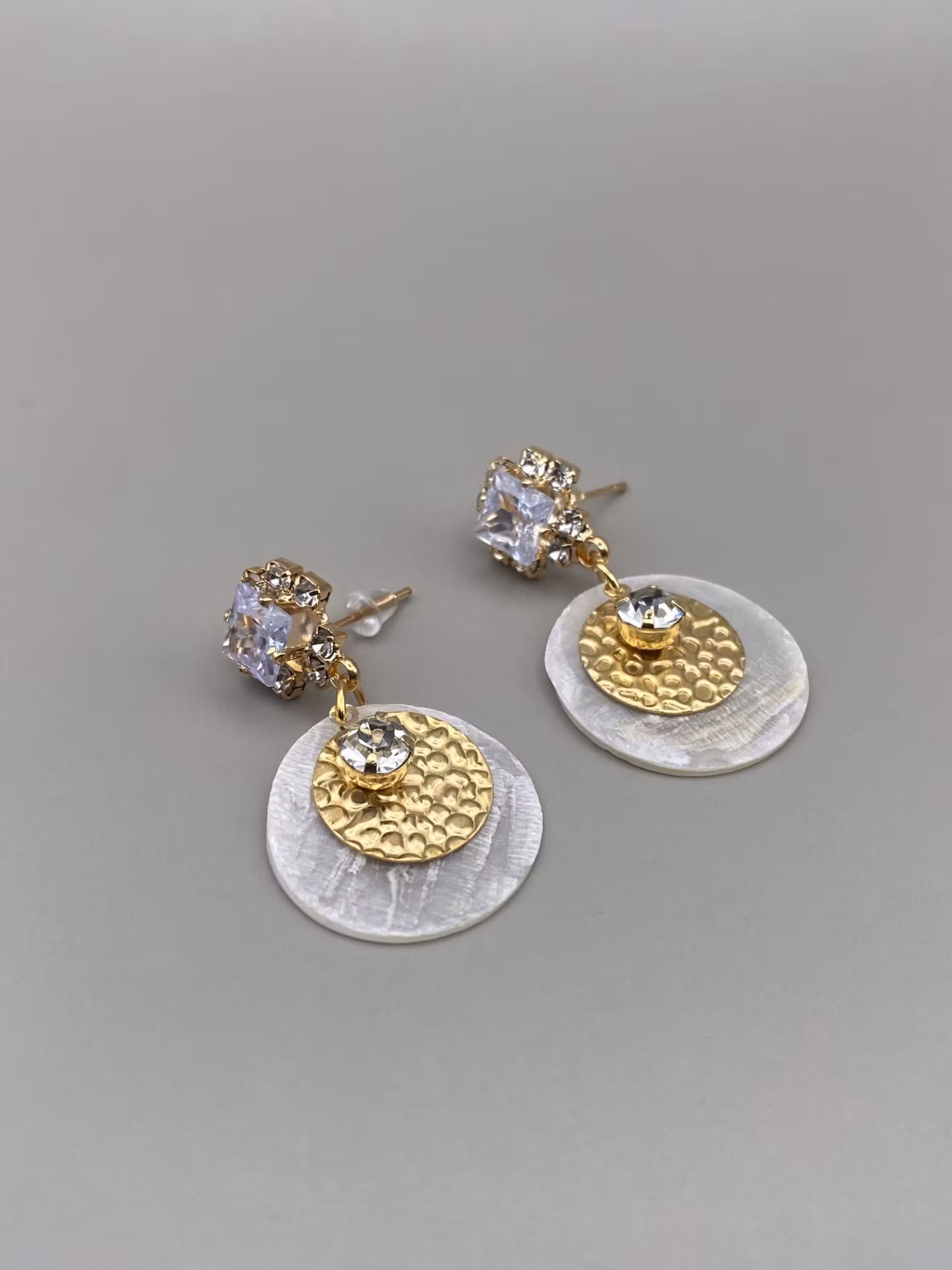 Guldfärgade vackra örhängen med strass och cubic zirconia, hänge av ett runt vitt lövtunt snäckskal,, dekorerad med guldfärgad ”bankad” rund bricka och en hängande cubic zirconia.