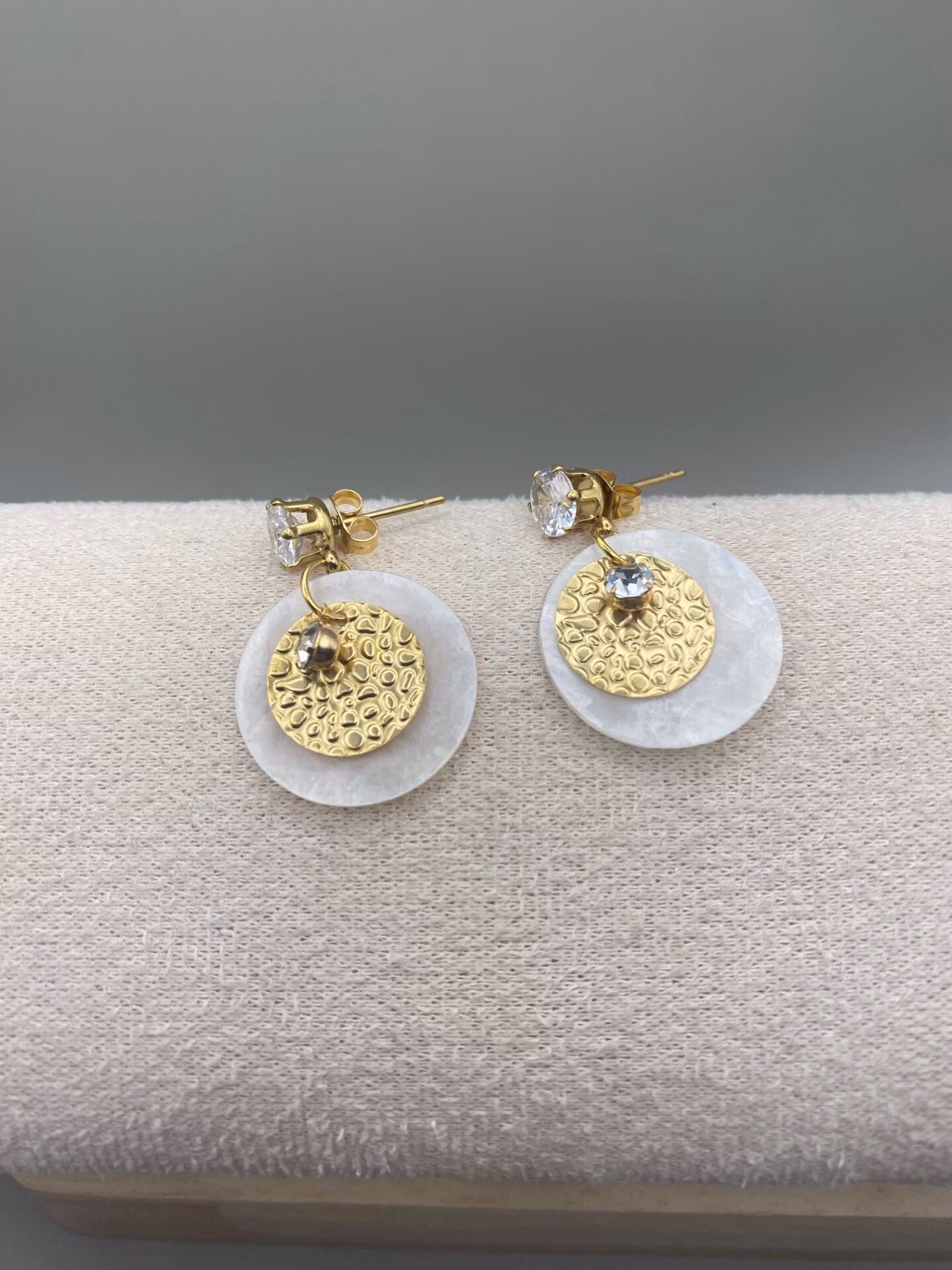 Guldfärgade vackra örhängen med cubic zirconia och hängande guldfärgad bankad bricka på en aningen större bricka av snäckskal samt med en skimrande cubic zirconia.