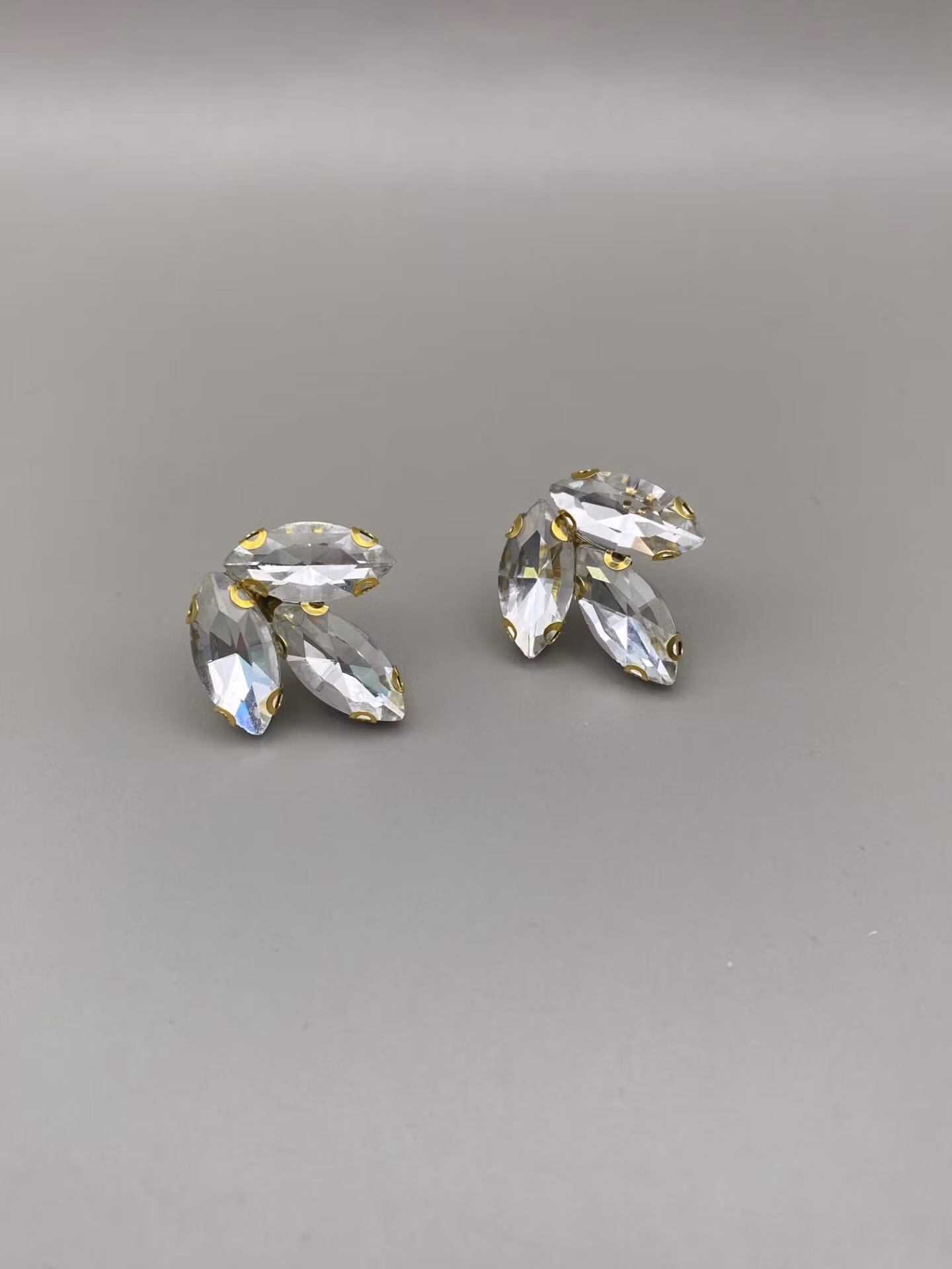 Tjusiga örhängen format som tre blad av vit klarglasfärgad glaskristall på guldfärgad stomme.