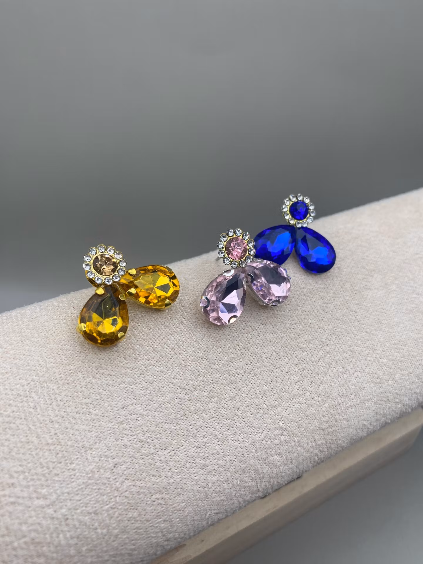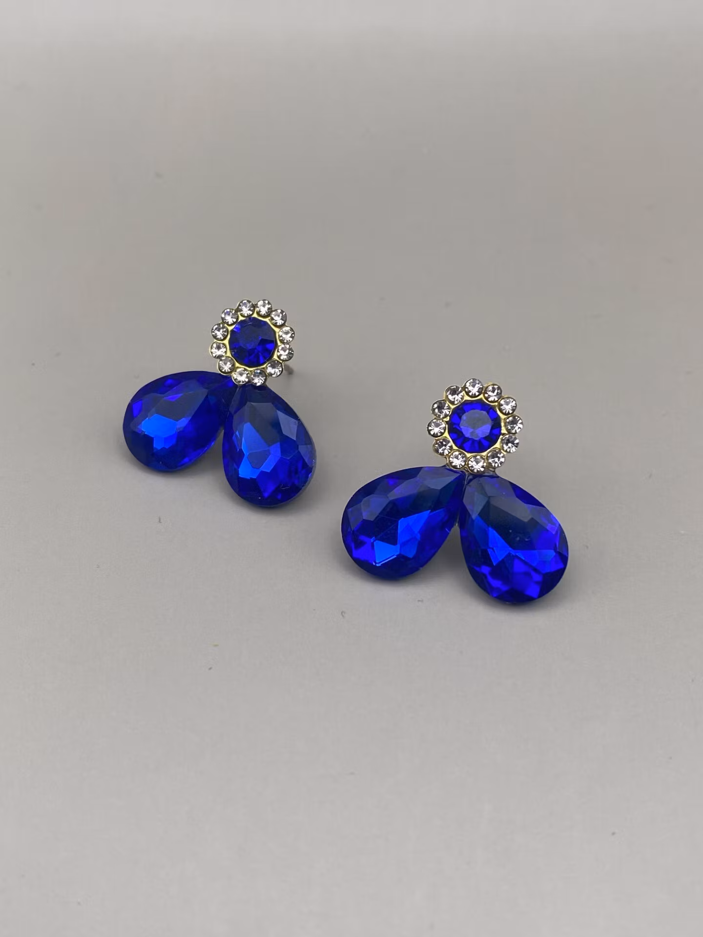 Tjusiga örhängen i blå droppformad färgad glassten och en liten rund dekorativ blå glassten med strass runt om.