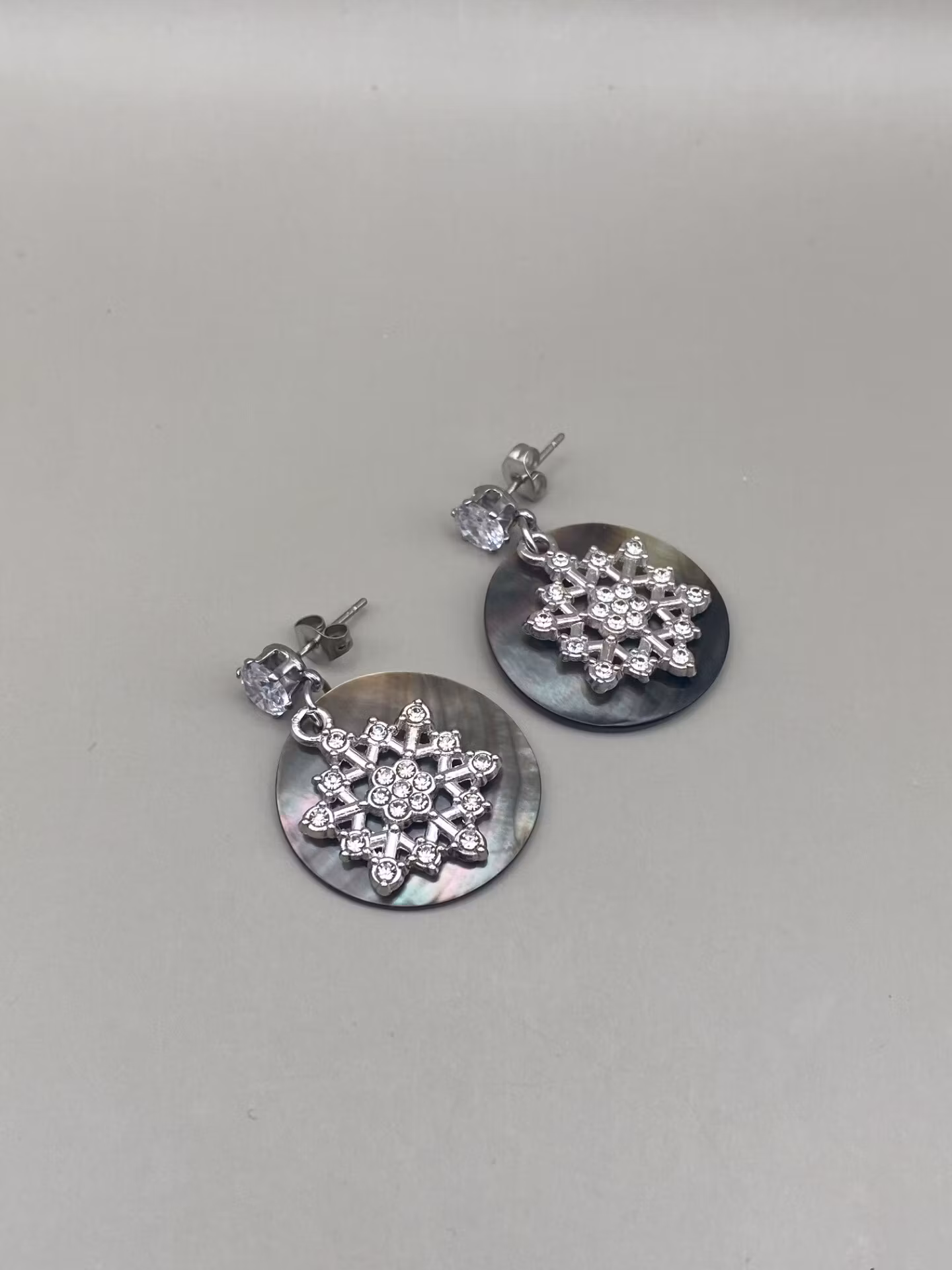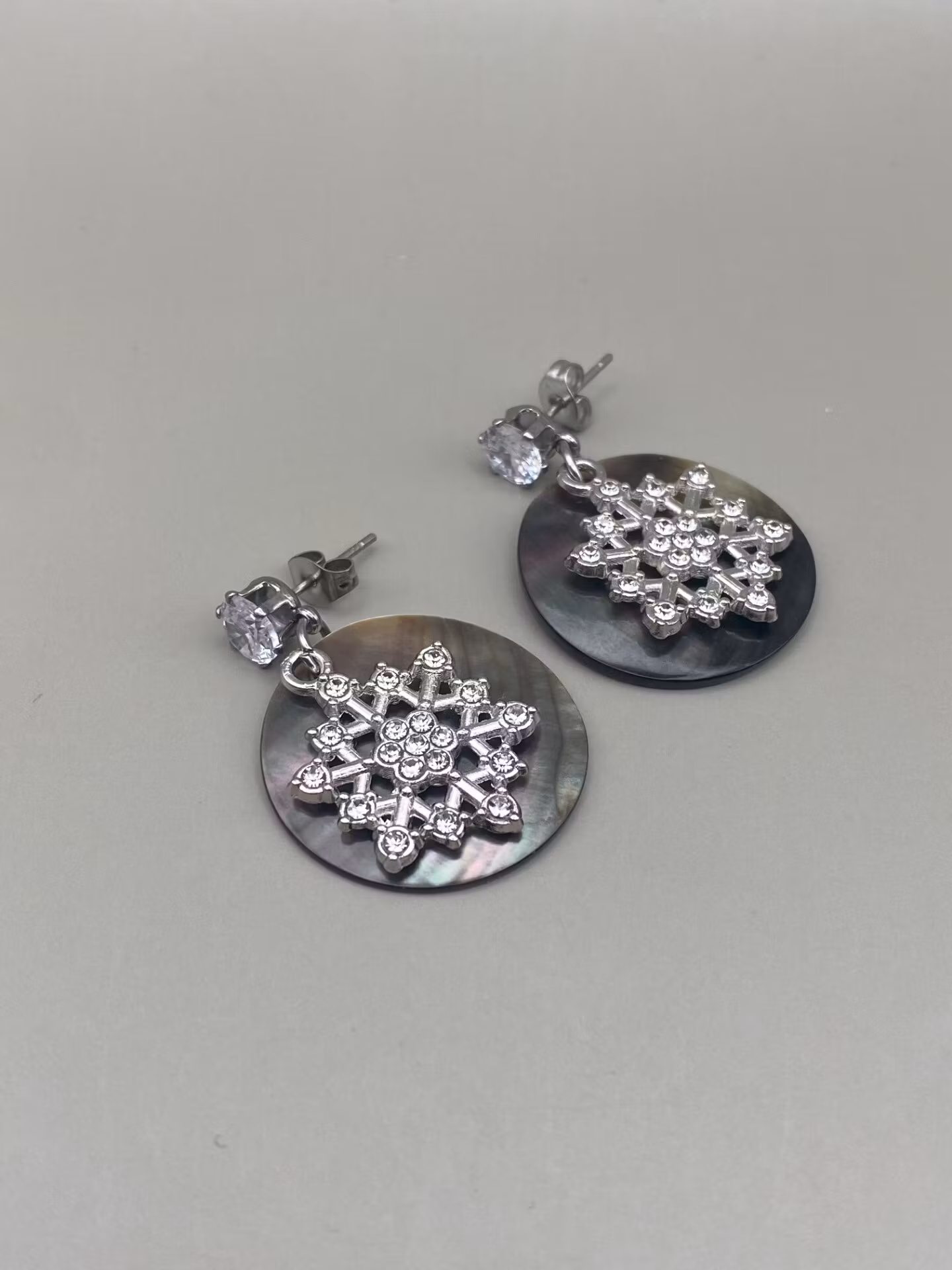 Vackra örhängen med stift och skimrande vacker cubic zirconia, hänge av vintage gråmellerad snäckskalsliknande berlock och silverfärgad snöflinga med rhinestones.