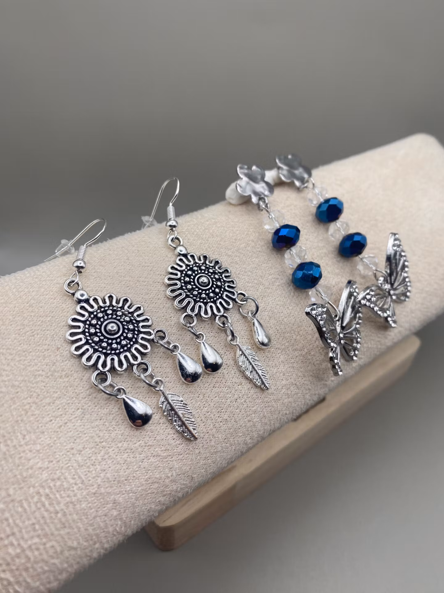 Örhängen i antiksilverfärgad mönstrad berlock och tre hängande små berlocker, två droppar och en fjäder