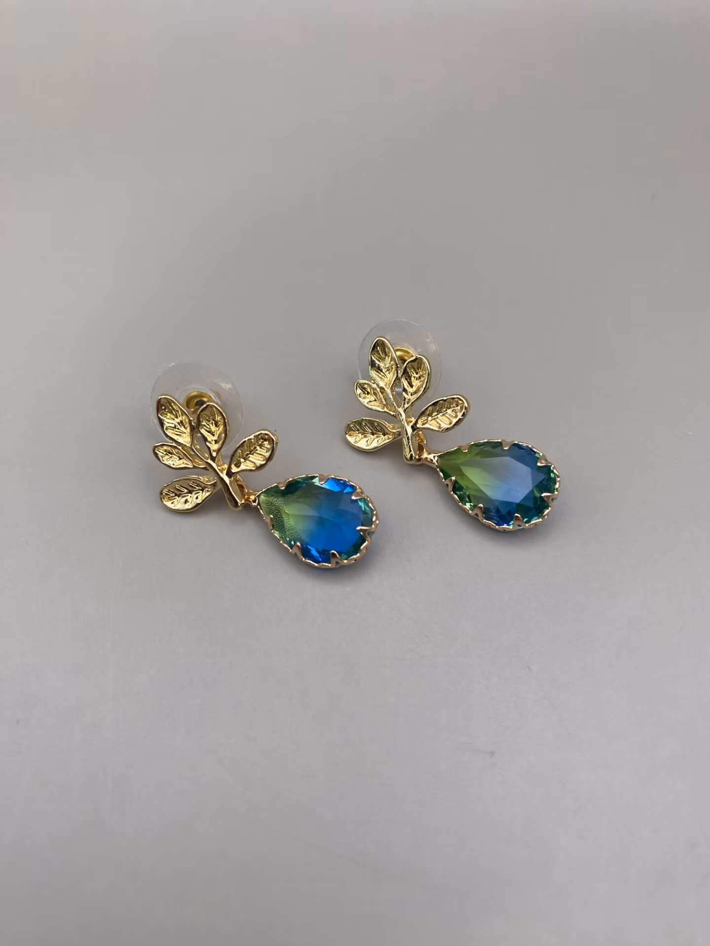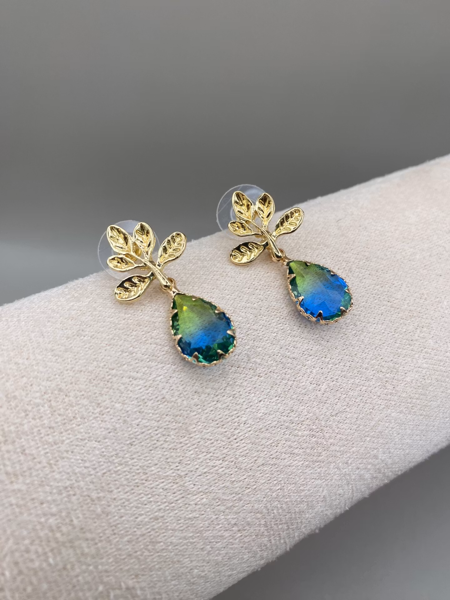 Lekfulla örhängen i form av guldfärgad gren med blad och en hängande vacker droppformad berlock av mellerad blå-grön glassten.