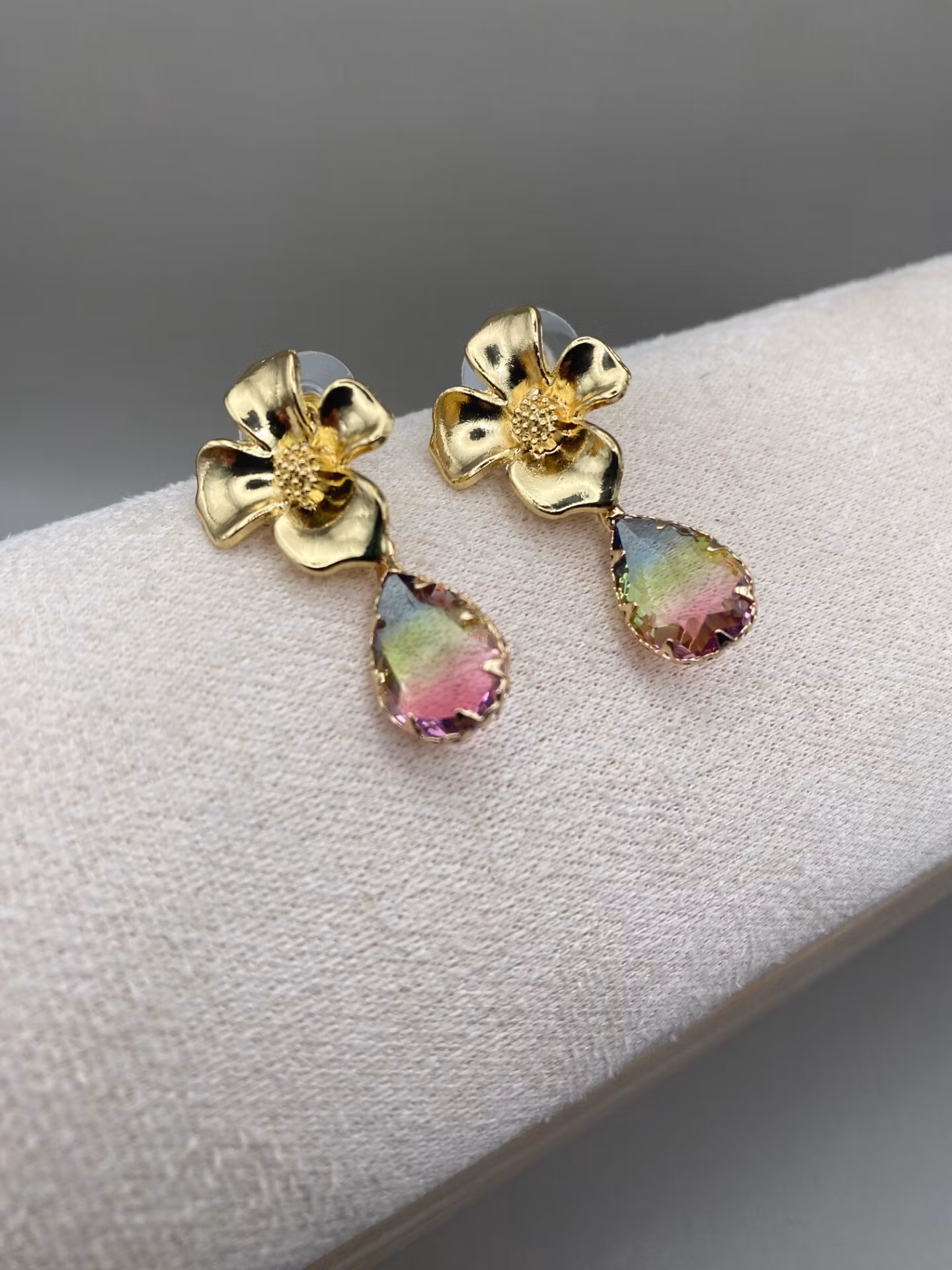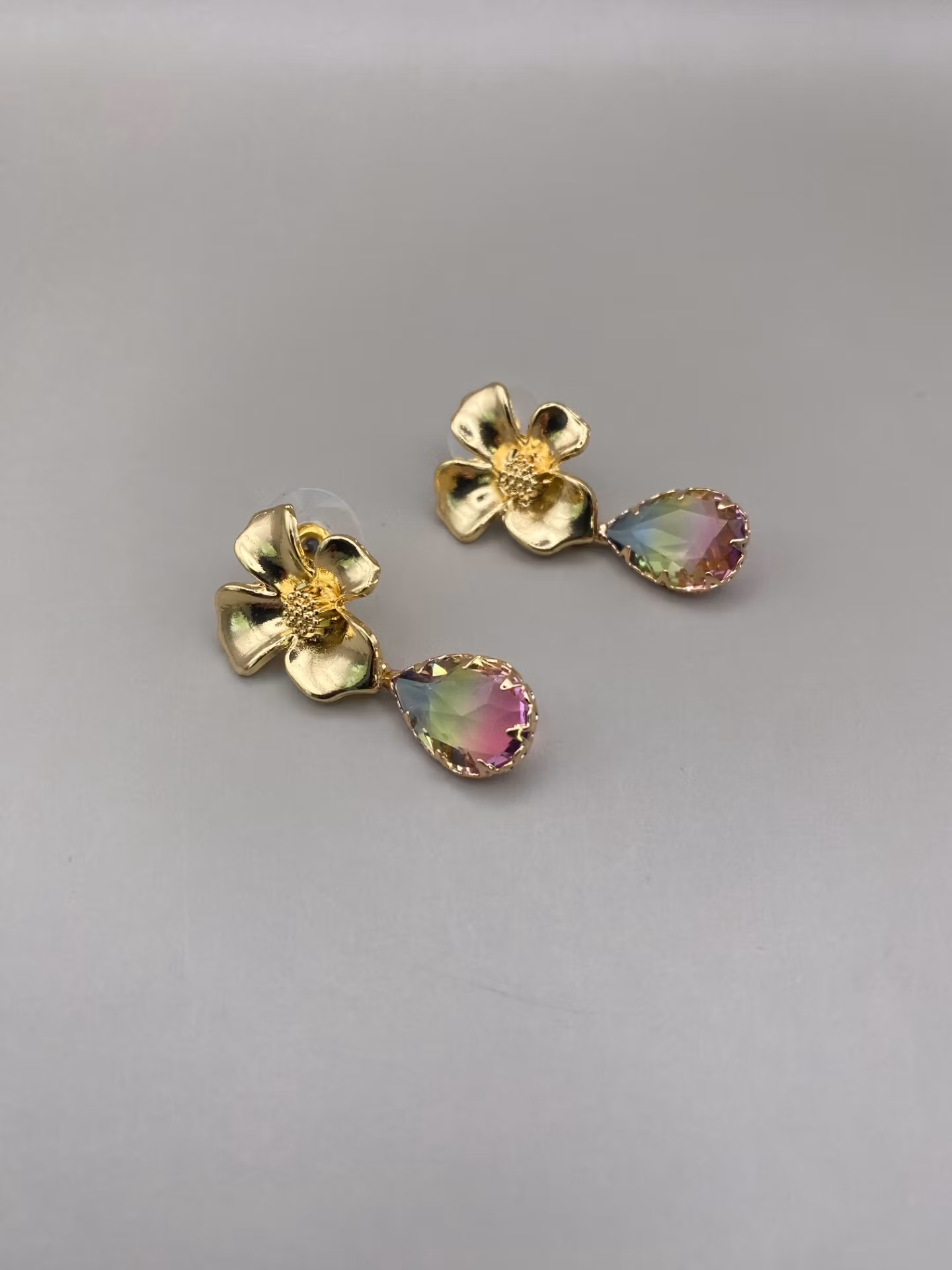 Lekfulla örhängen i form av guldfärgad blomma med en hängande vacker droppformad berlock av mellerad rosa-gul-blå glassten.