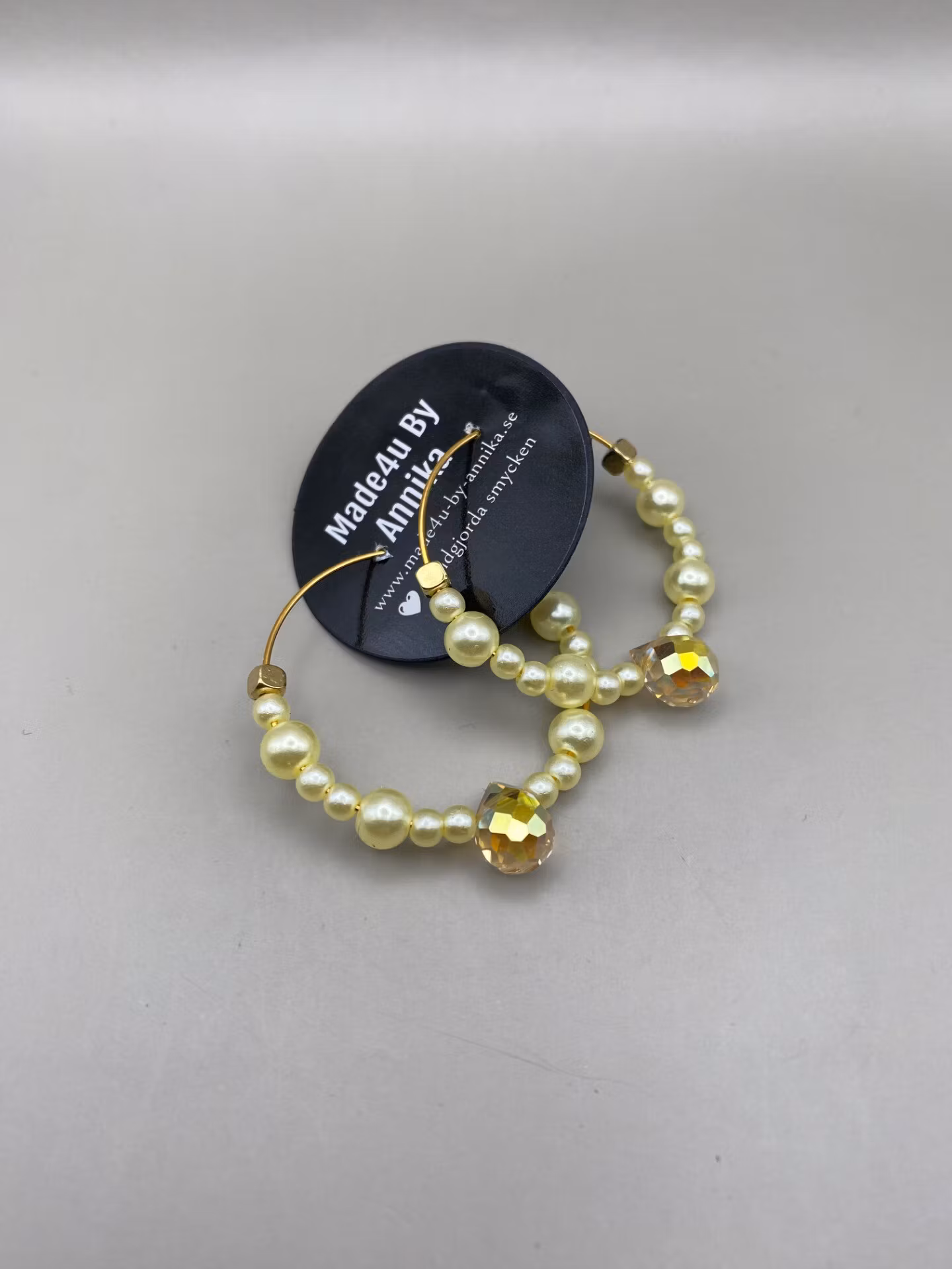 Lekfulla guldfärgade örhängen med ljusgula fauxpärlor, guldfärgade distanser och vacker droppformad ljusgul facetterad glaspärla i blickfånget