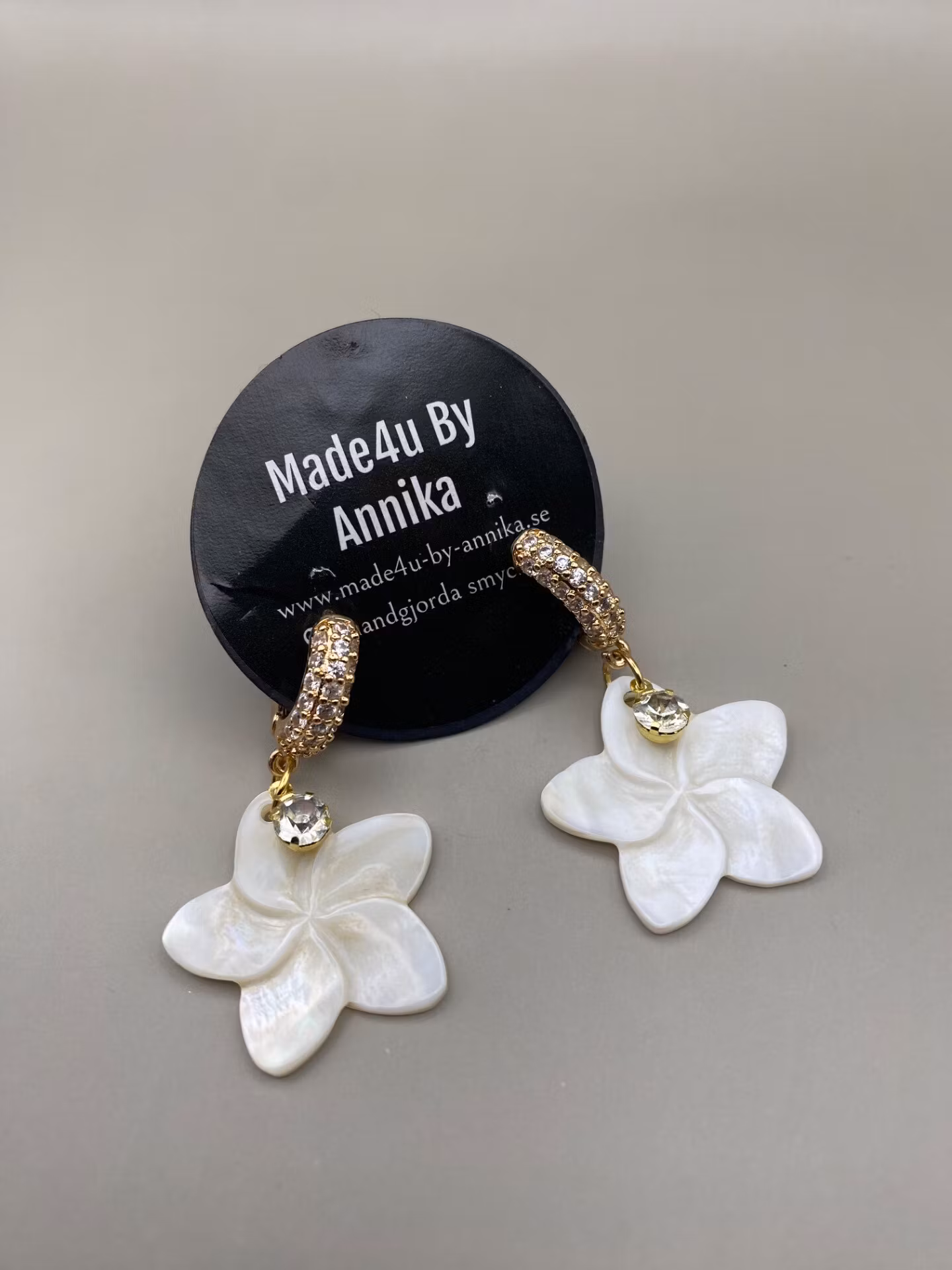 Vackra stilrena örhängen glimmande creolhänge av strass med vackert hänge av en vit blomma med liten hängande cubic zirconia sten.