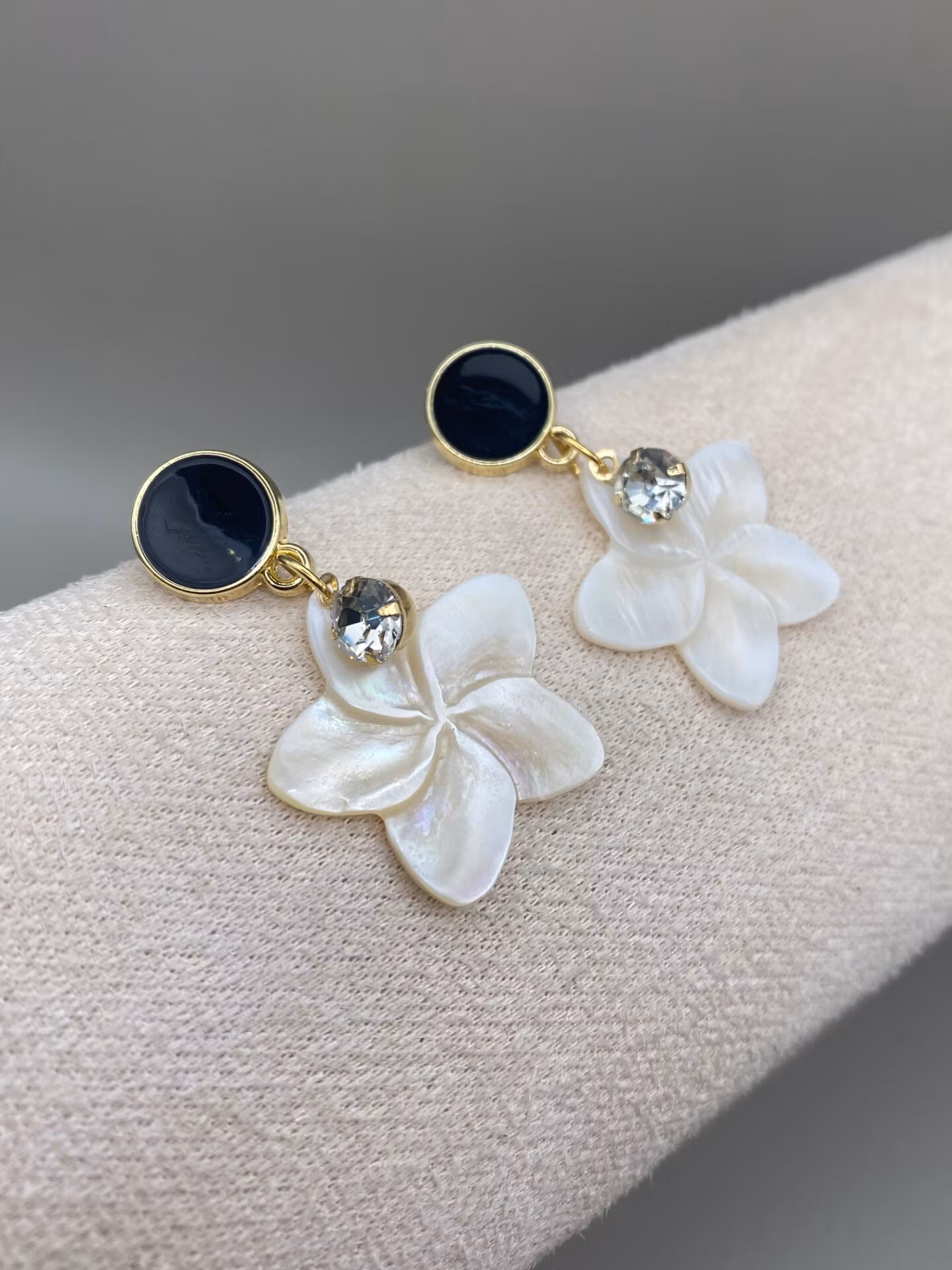 Vackra stilrena örhängen med svart stilren platta och vackert hänge av en vit blomma med liten hängande cubic zirconia sten.