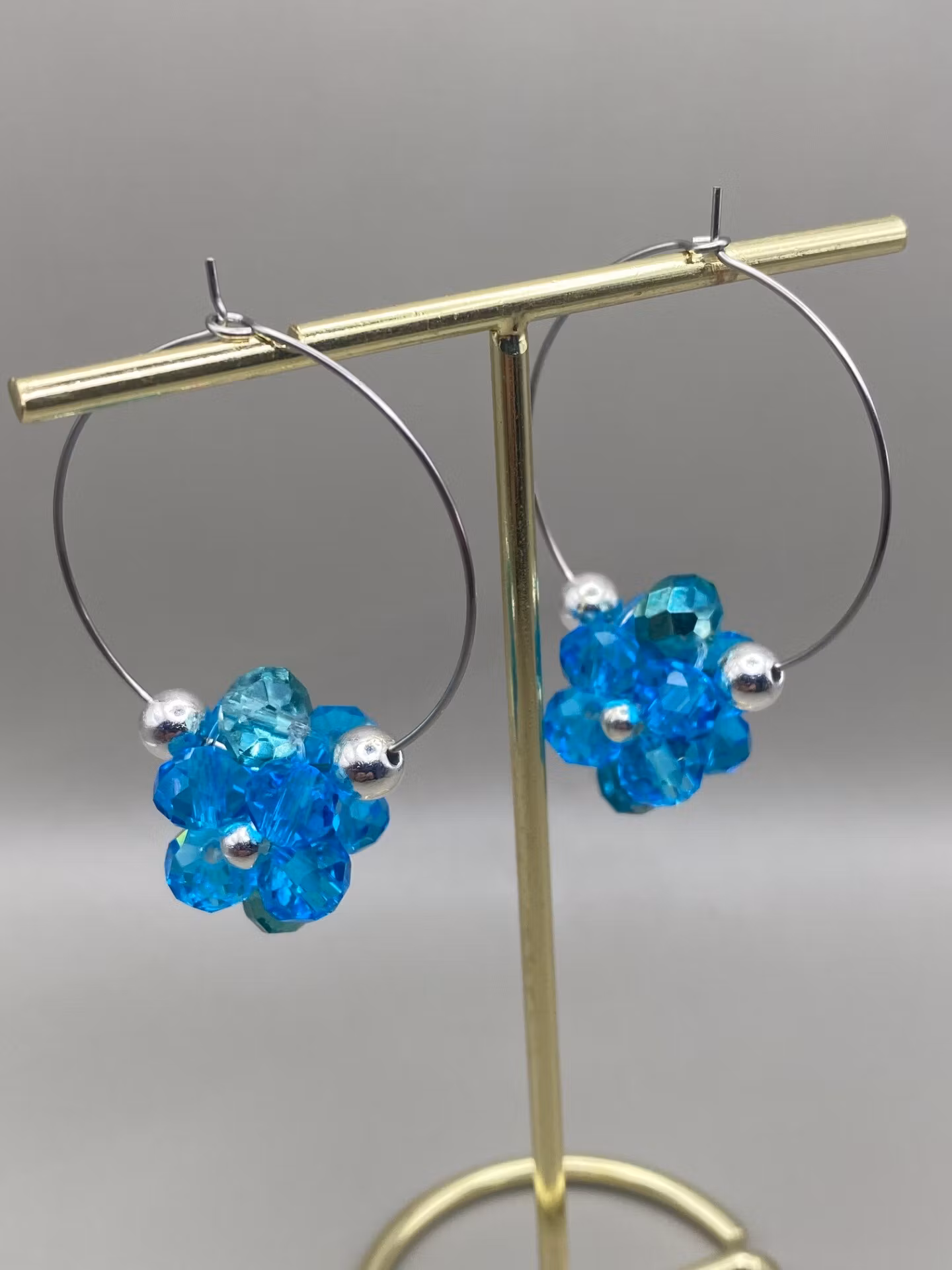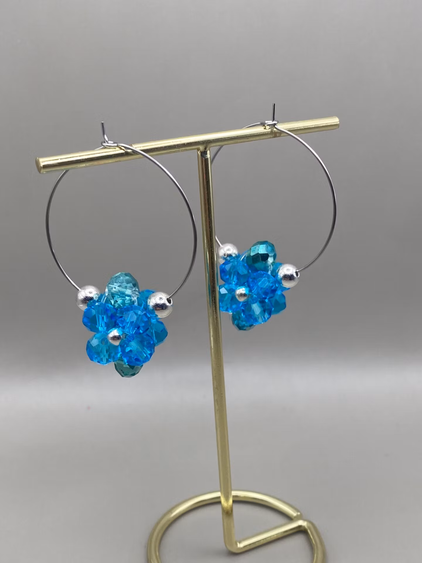 Vackra stora creolörhängen med formad blomma av glaskristallpärlor i turkost och svagt grönt och silverfärgade pärlor