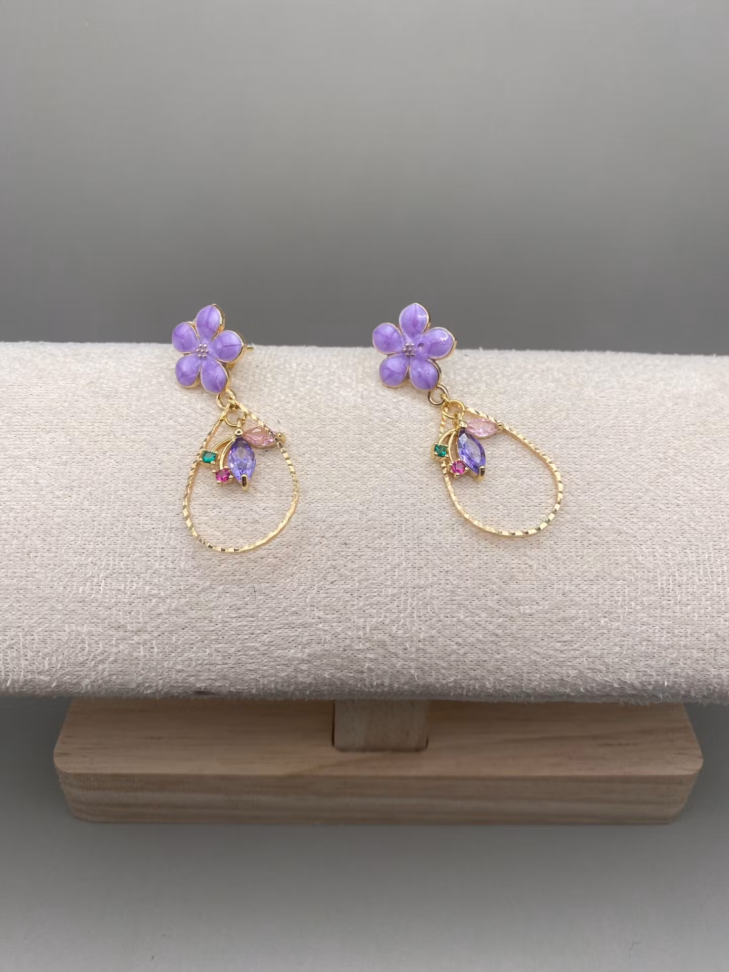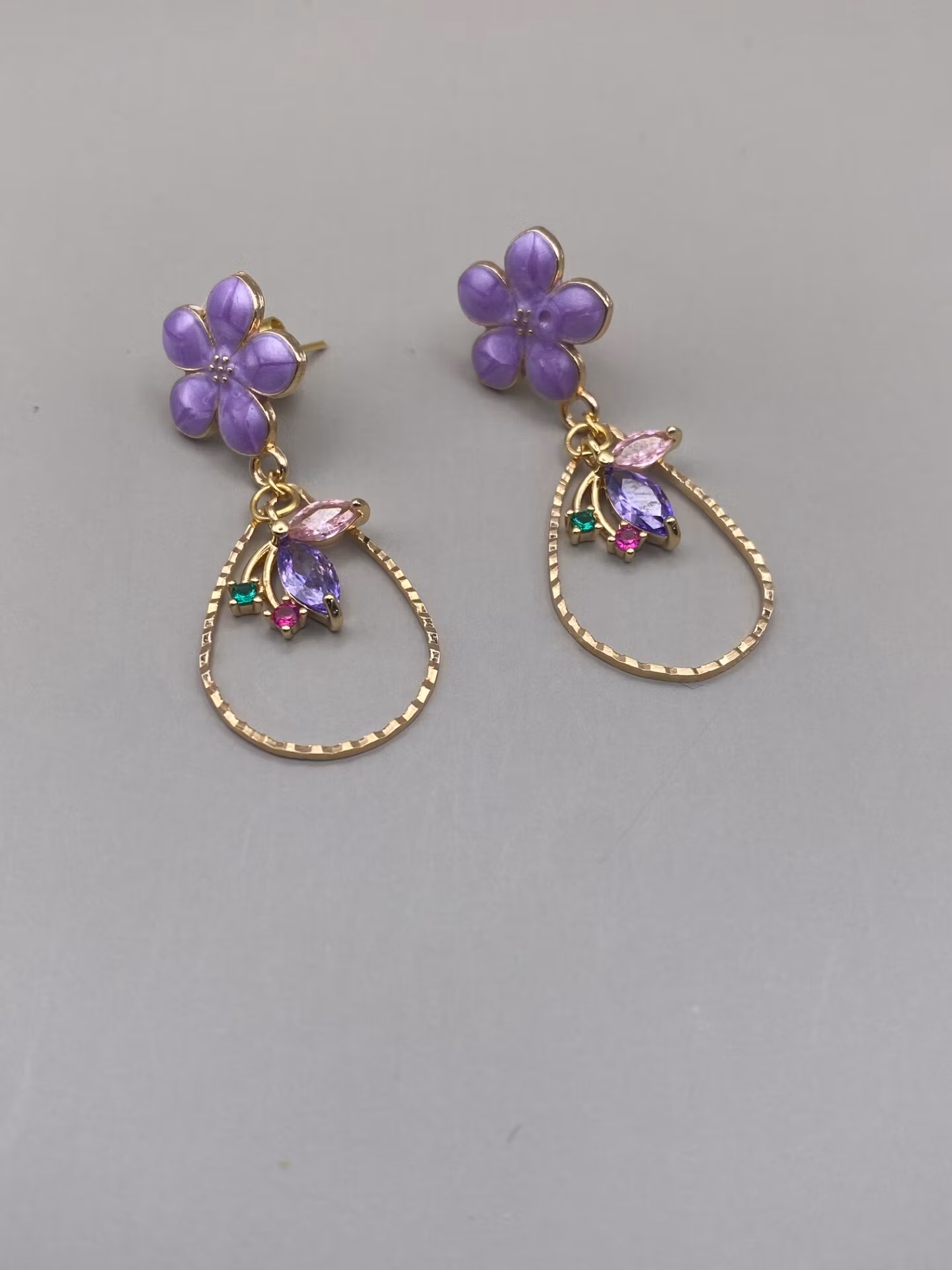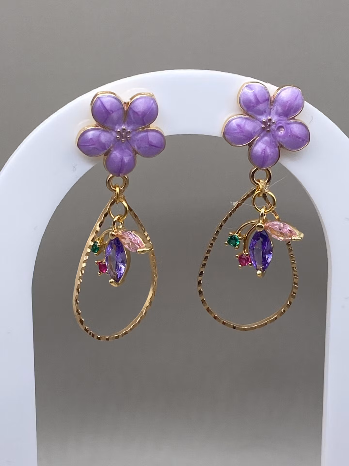 Söta örhängen i ljuslila blommor och hängande berlock av glimrande cubic zirconia stenar i olika färger och en oval form.
