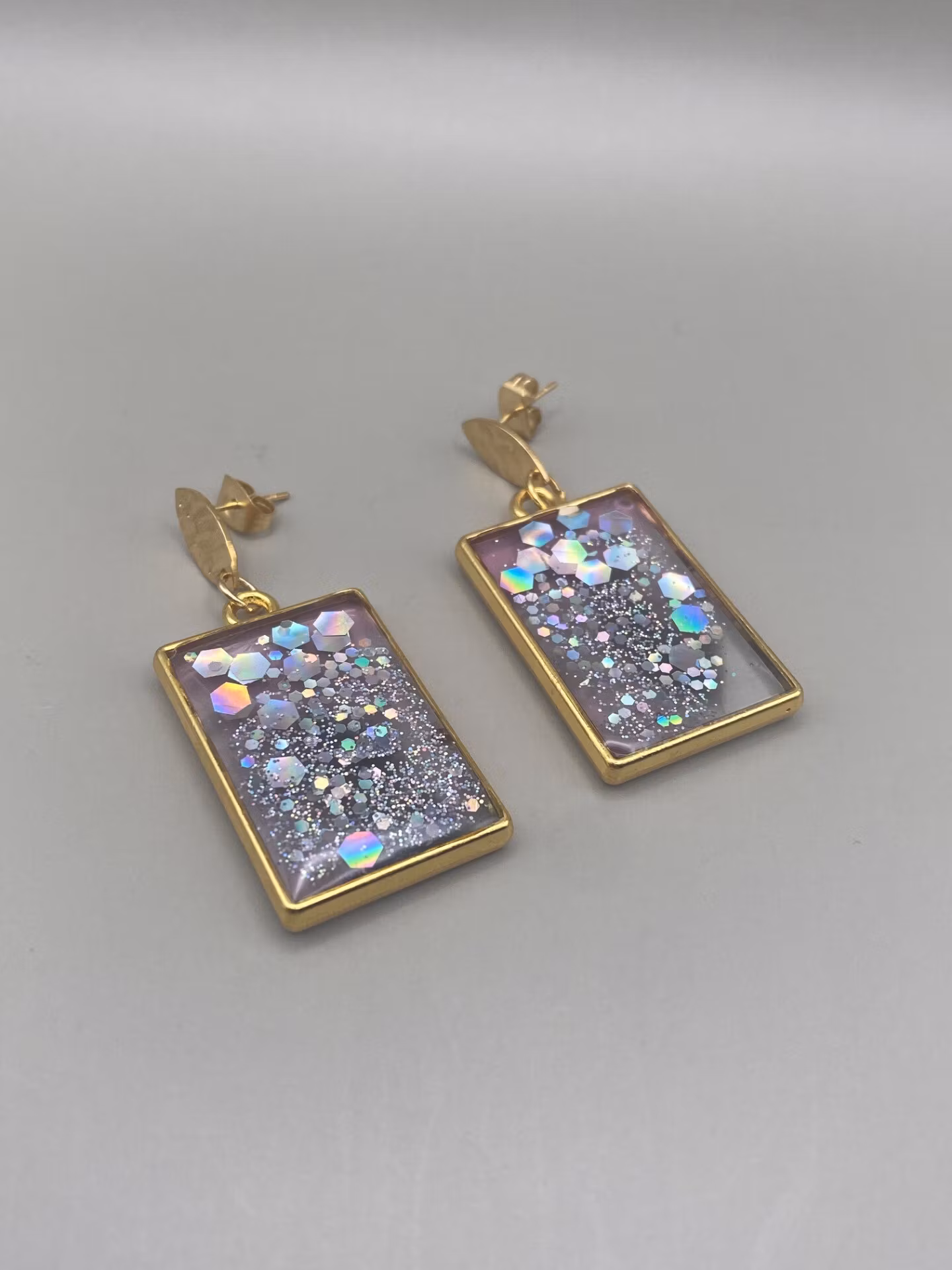 Stiliga men lekfulla örhängen i guldfärg, formad i oval knackad form. Det rektangulära hänget i klar och aningen rosa, glansig resin påminner om glas och skimrar vackert med silverfärgade glitterdetaljer inuti.