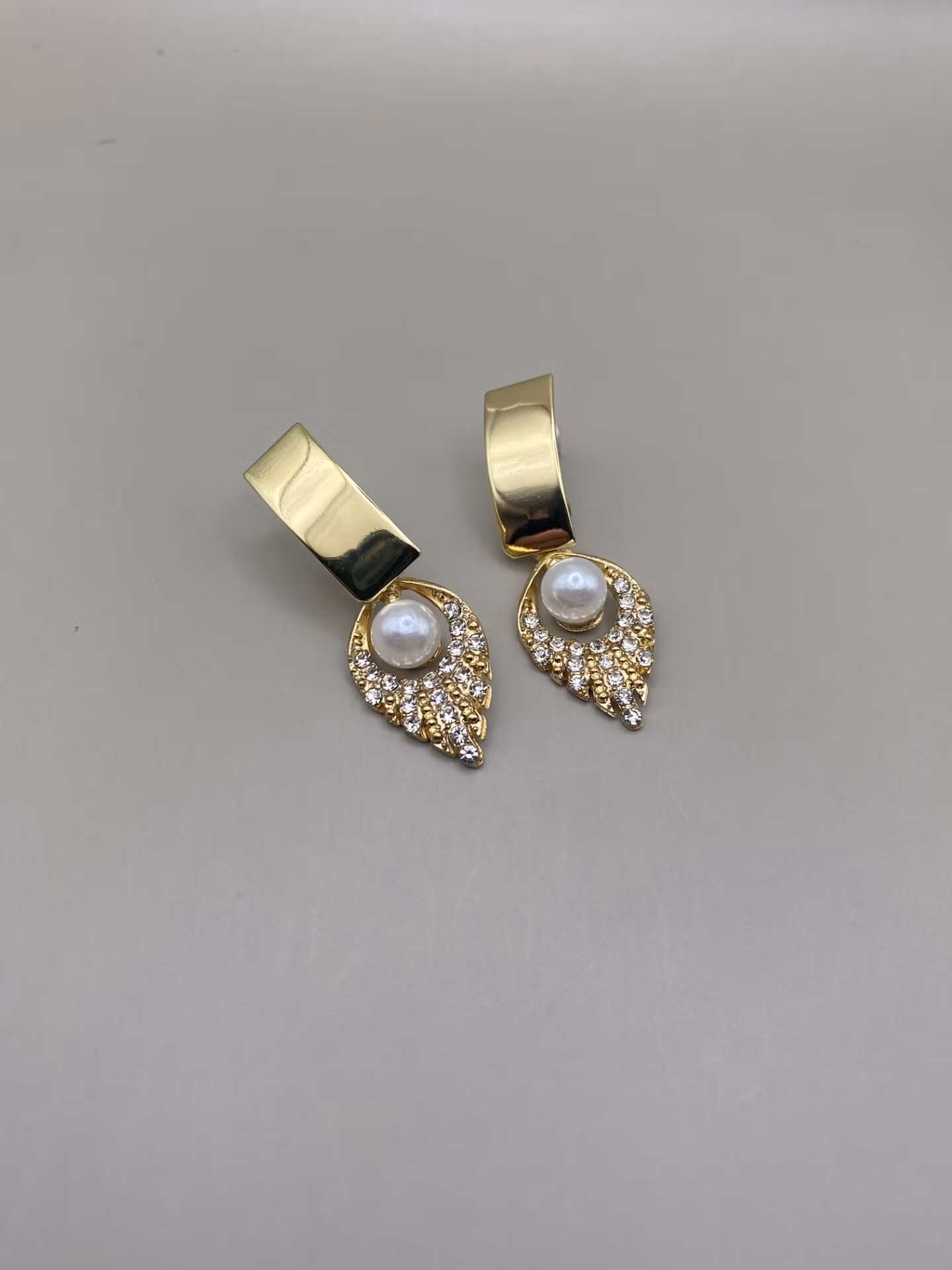 Festliga och dekorativa örhängen med stort guldfärgat stift och vacker hängande lövliknande berlock med strass och vit pärla.