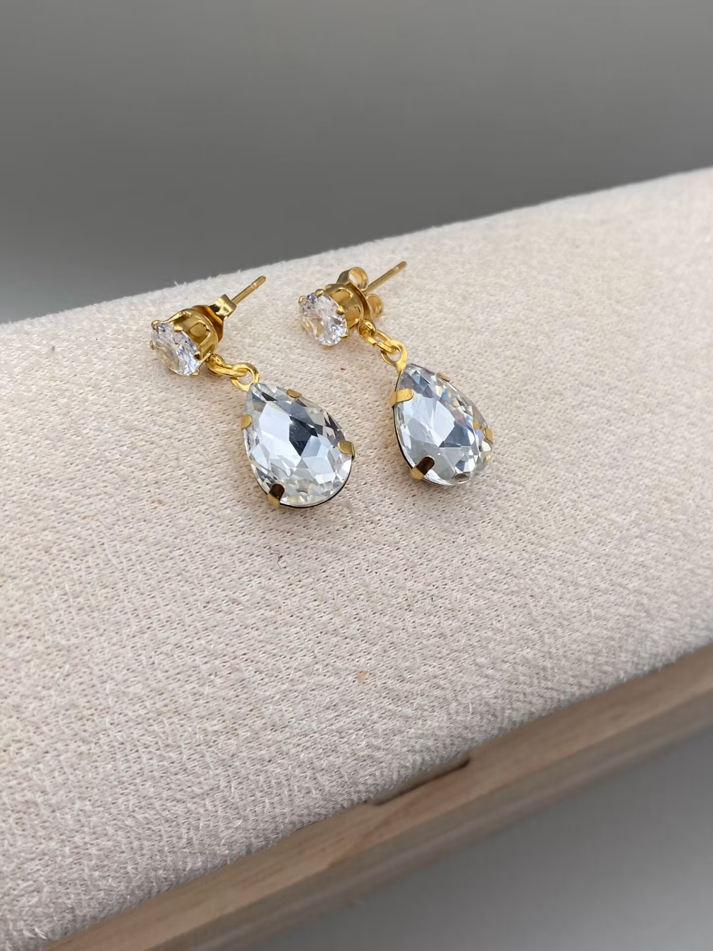 Vackra nätta örhängen med guldfärgad cubic zirconia och vacker droppformad berlock med glassten.