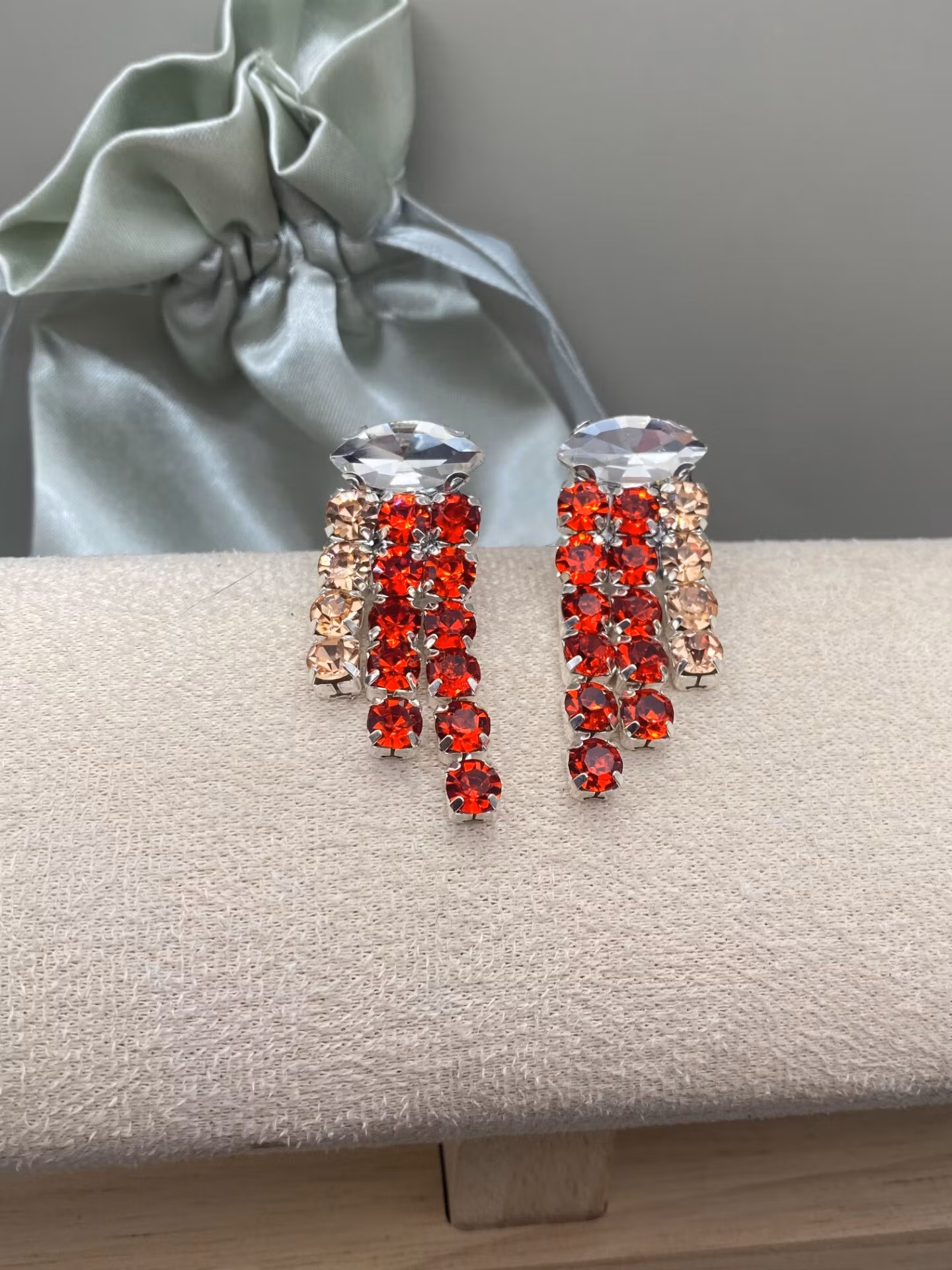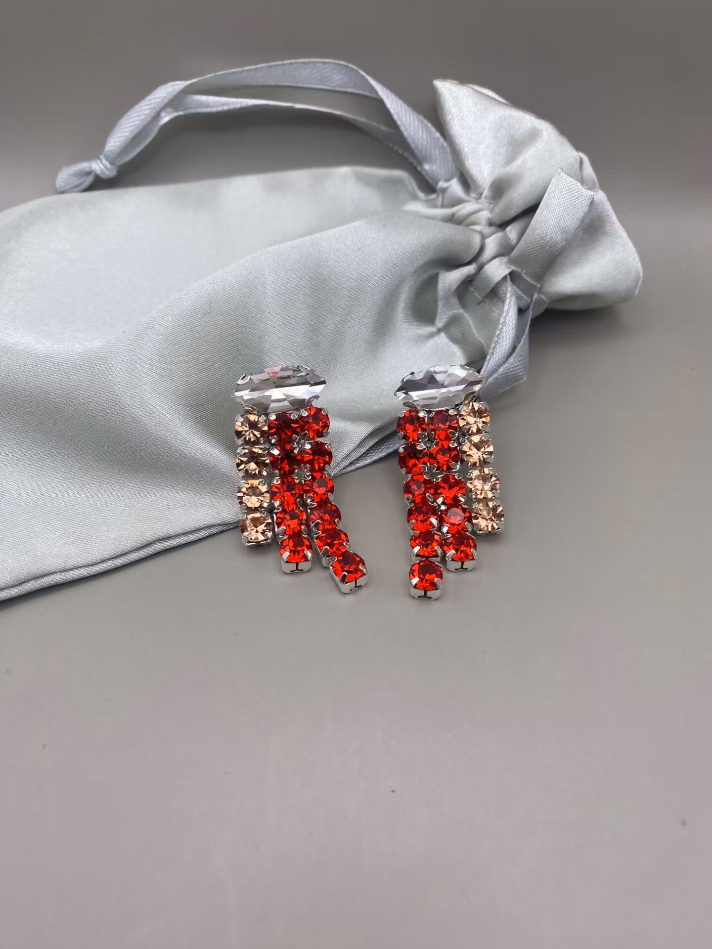Lekfulla strassörhängen med två rader röda större strass, en rad rosefärgad accent och en liggande oval klar strass.