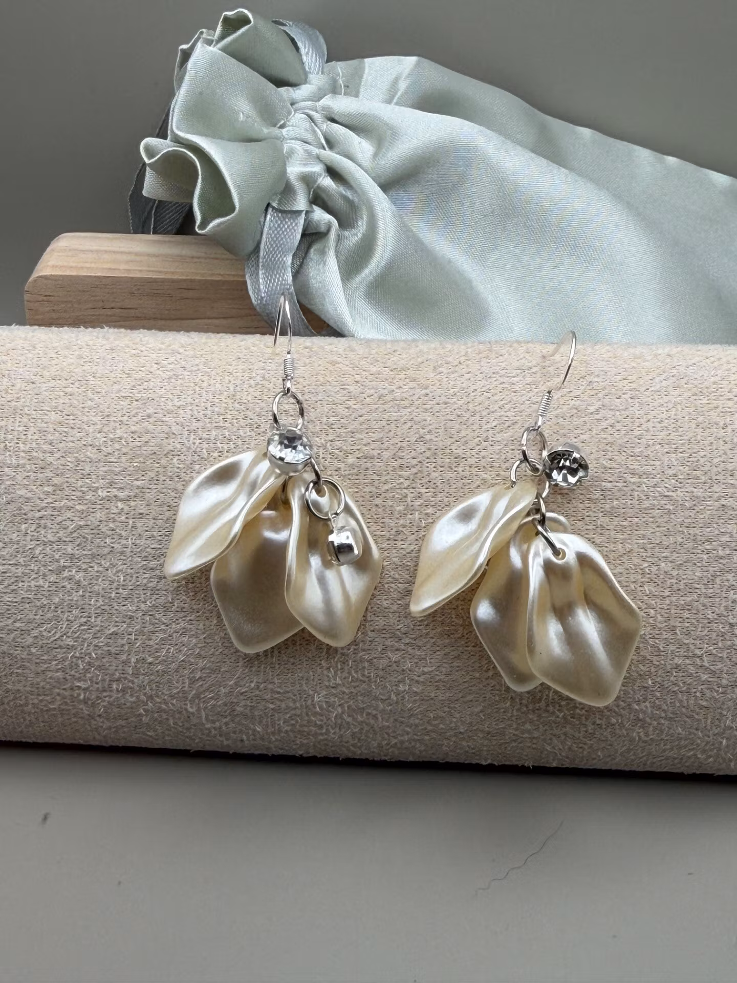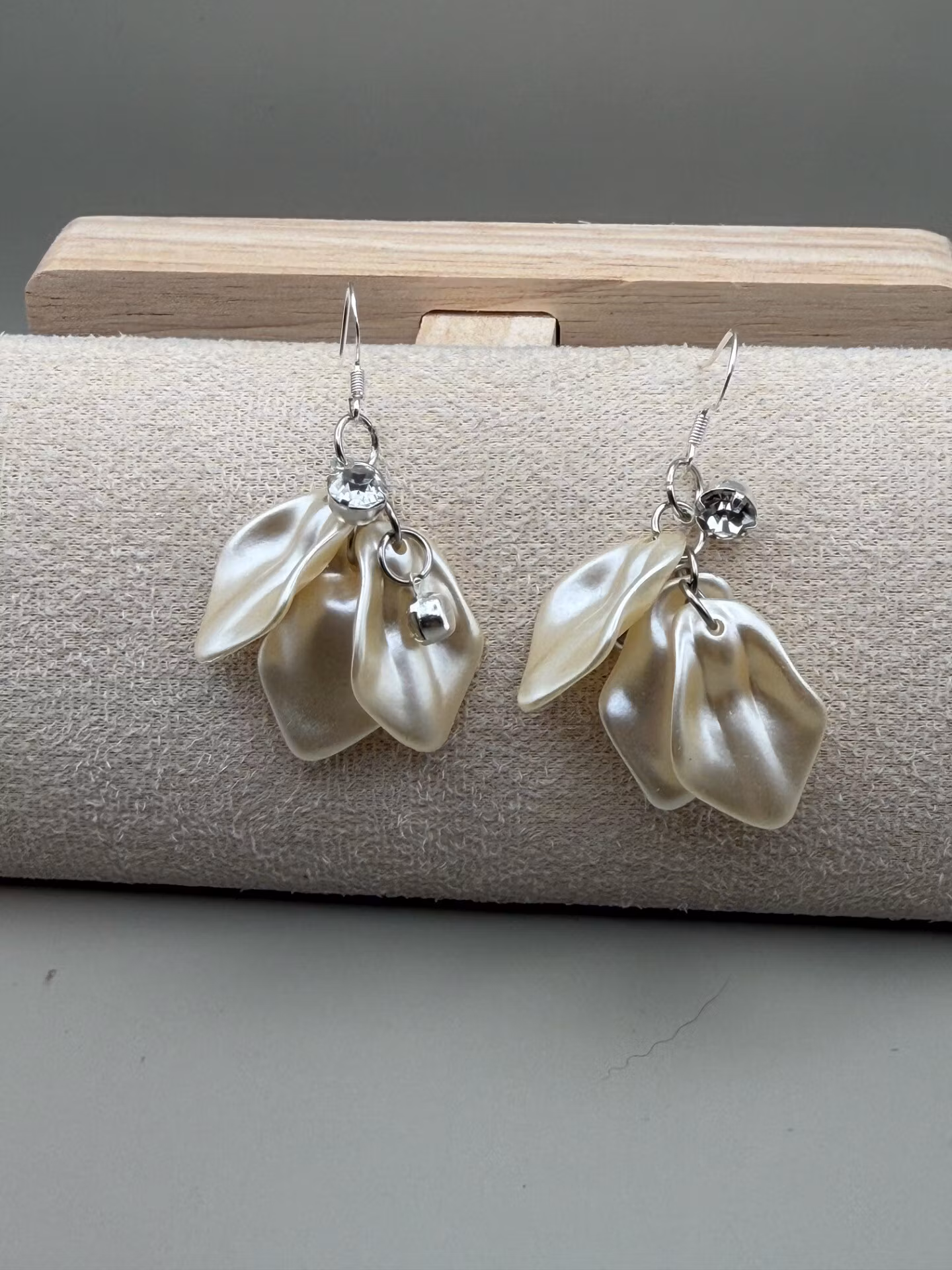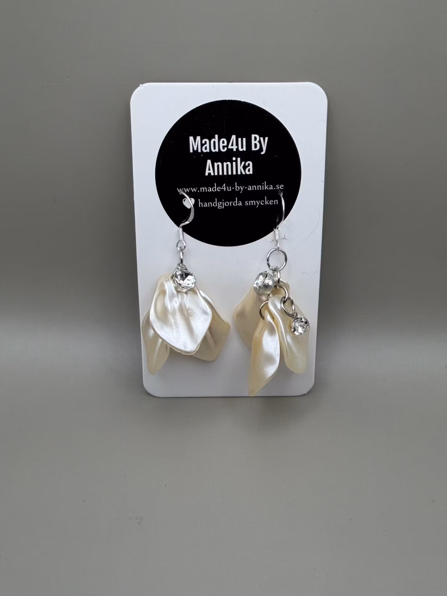 Vackra dinglande örhängen med tre hängande elfenbensvita löv och två cubic zirconia stenar.