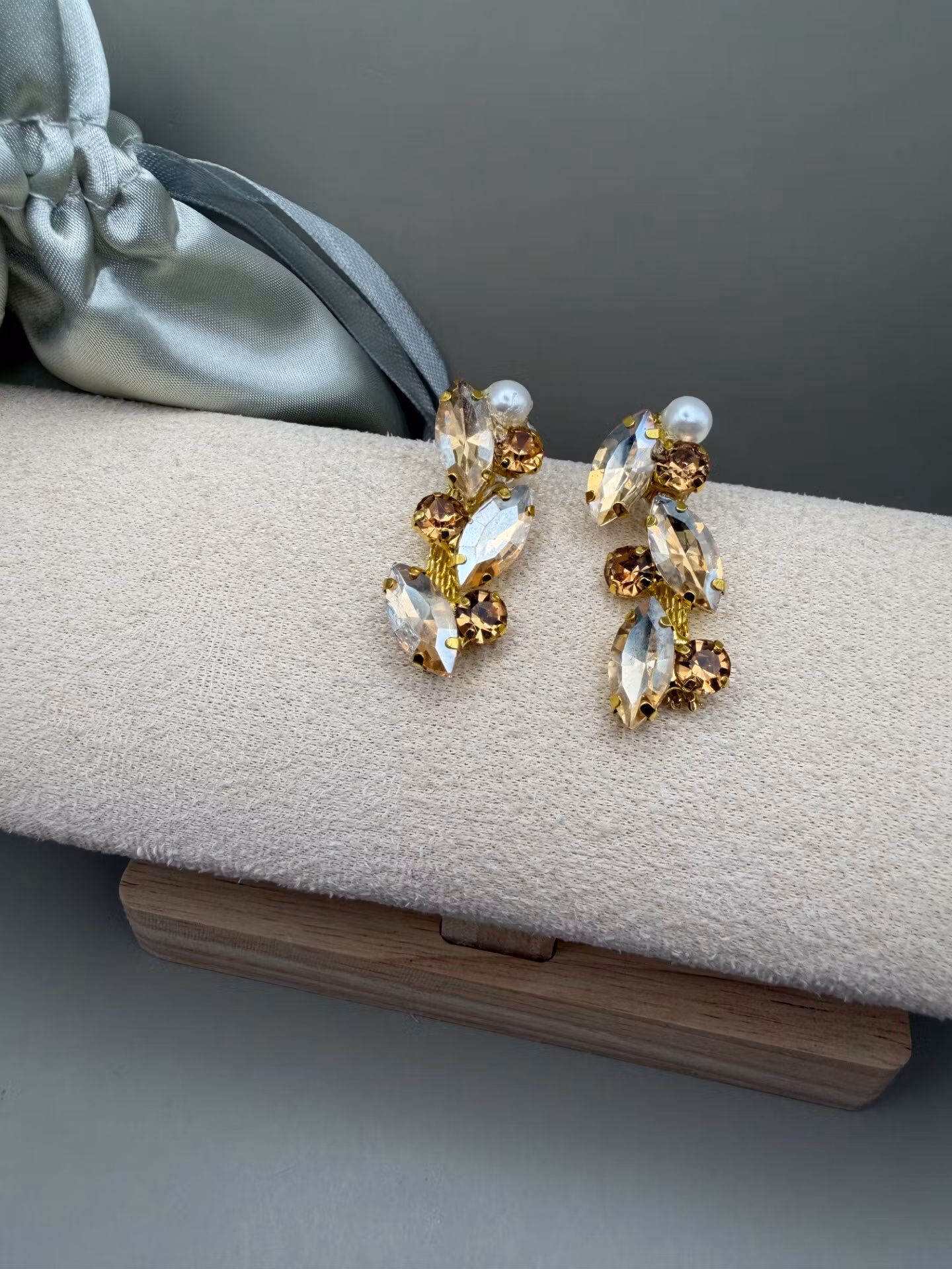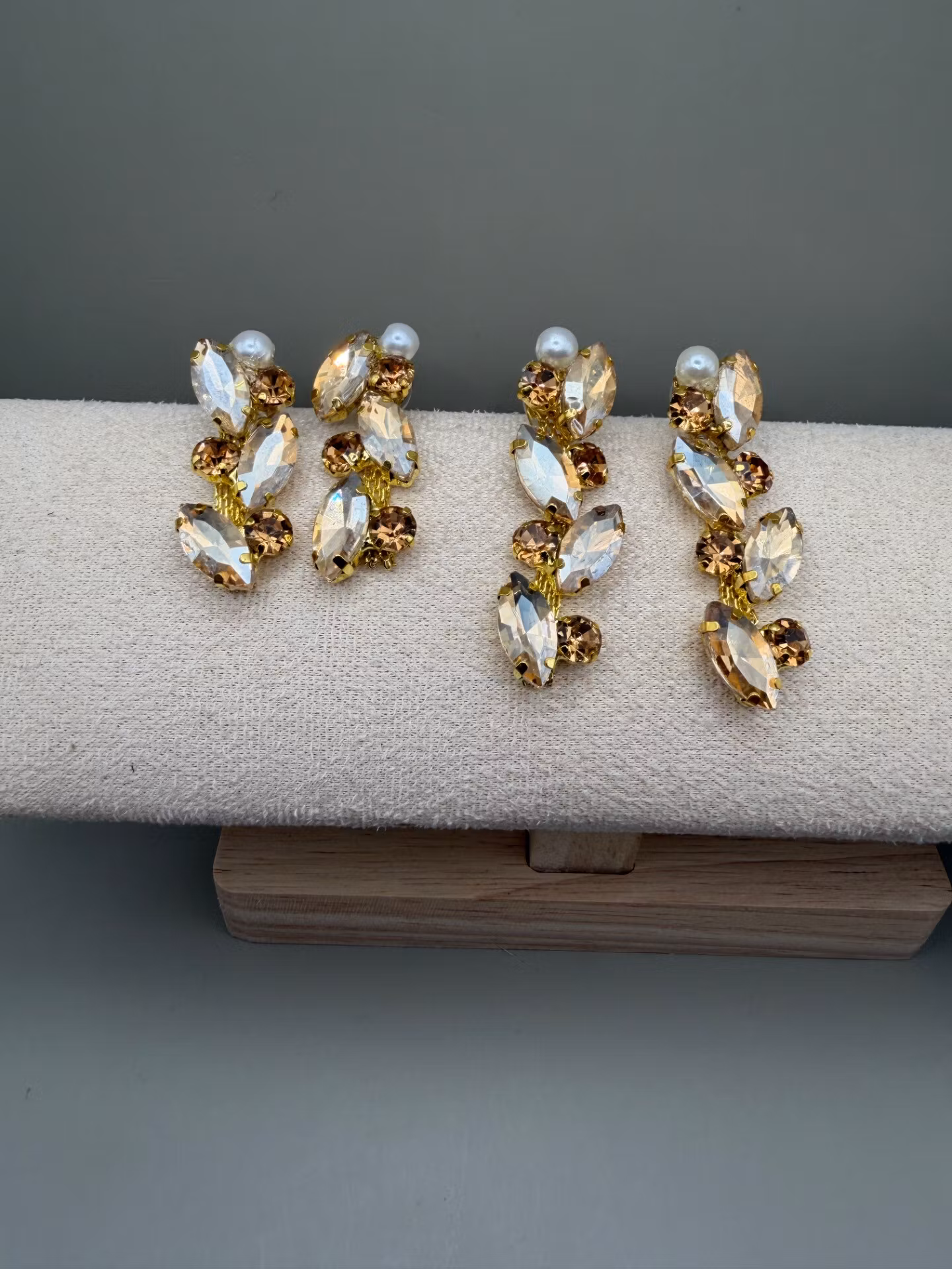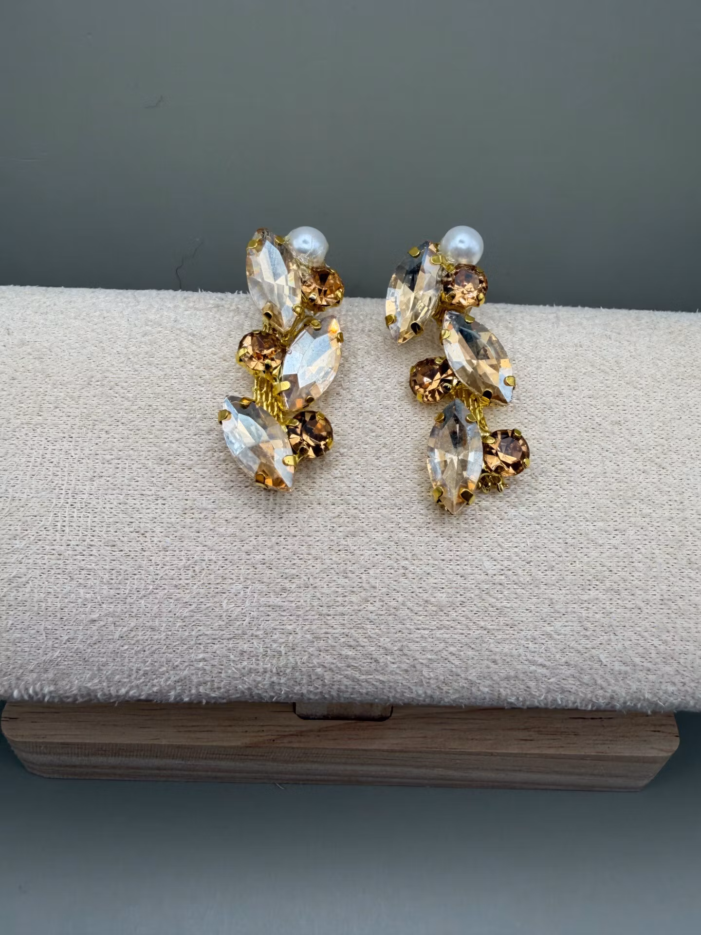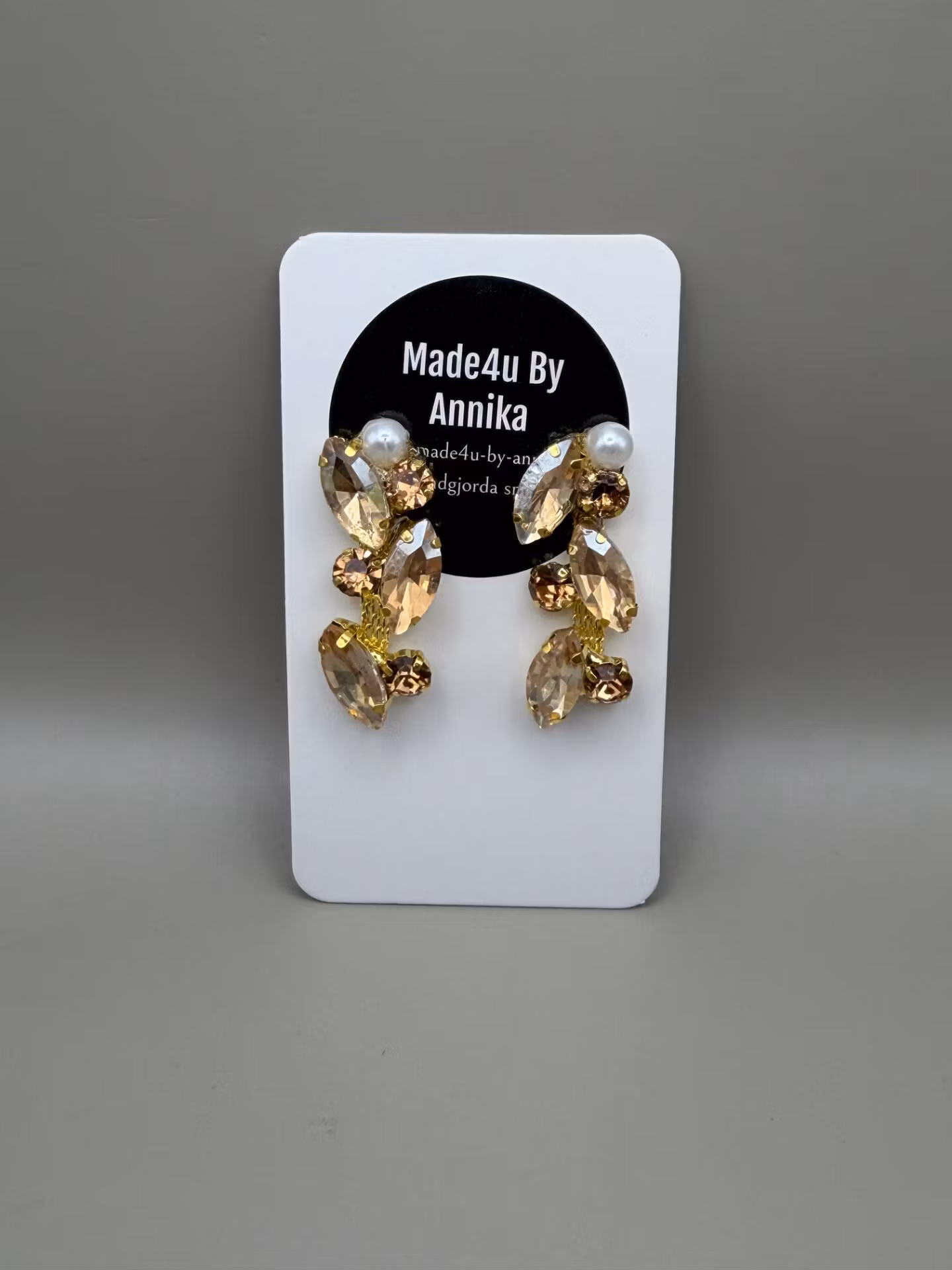 Vackra, långa örhängen med ett elegant mönster av beige- och champagnefärgade strassstenar, toppade med en enkel benvit pärla.