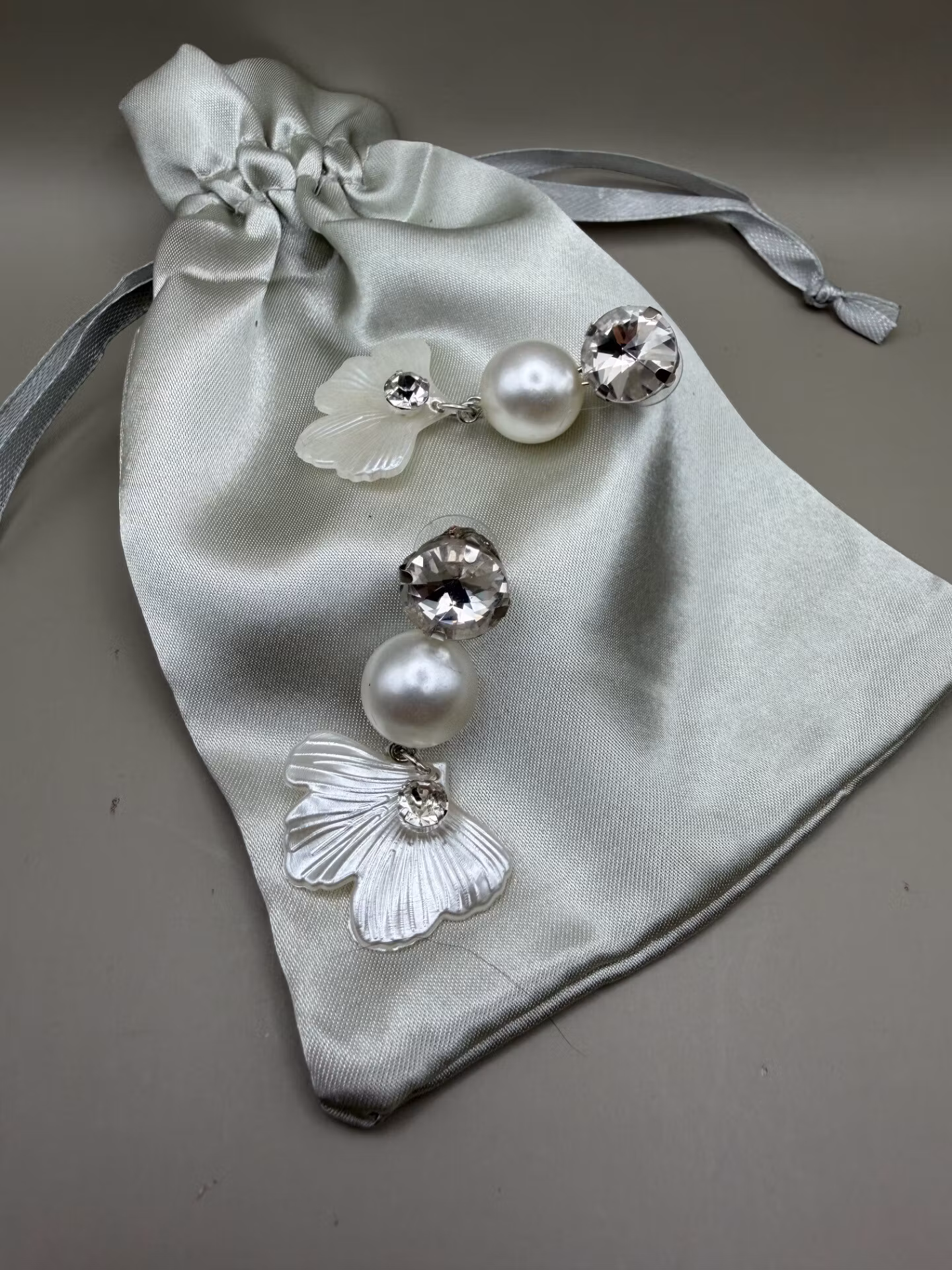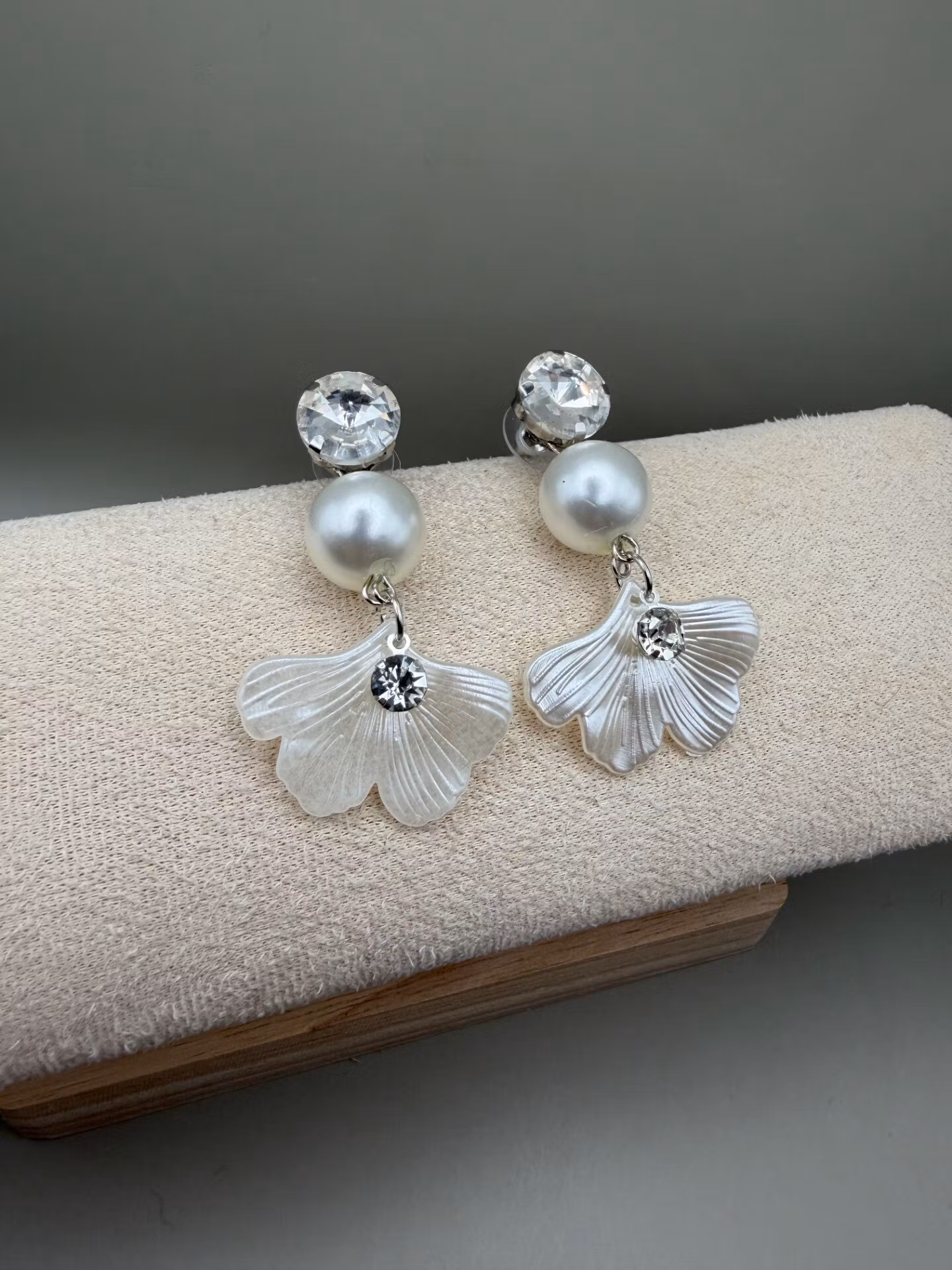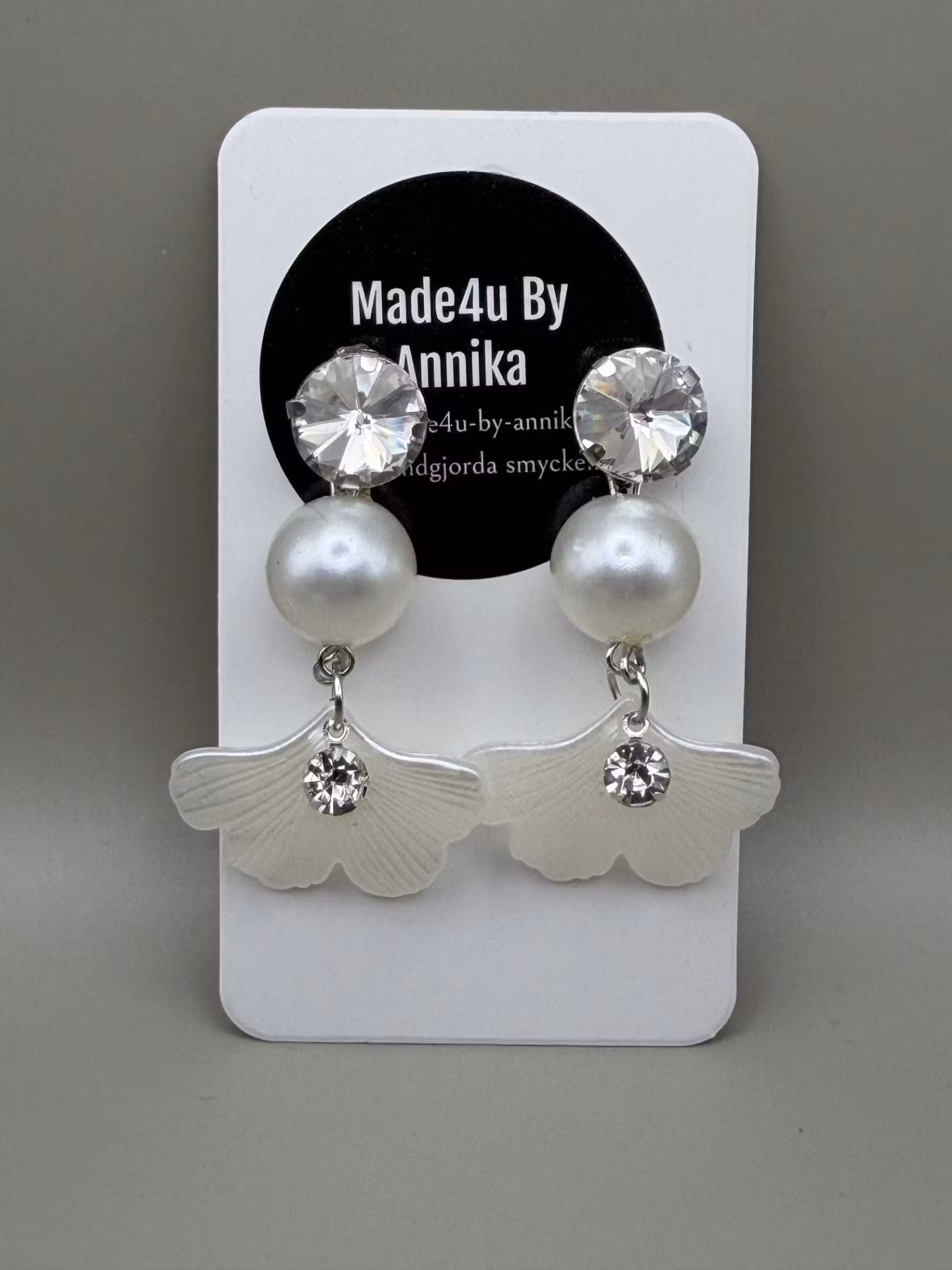 Vackra stora och långa örhängen med en elegant sammansättning av stor strass, stor vit högblank pärla och ett dinglande vitt mönstrat blad med en cubic zirconia sten