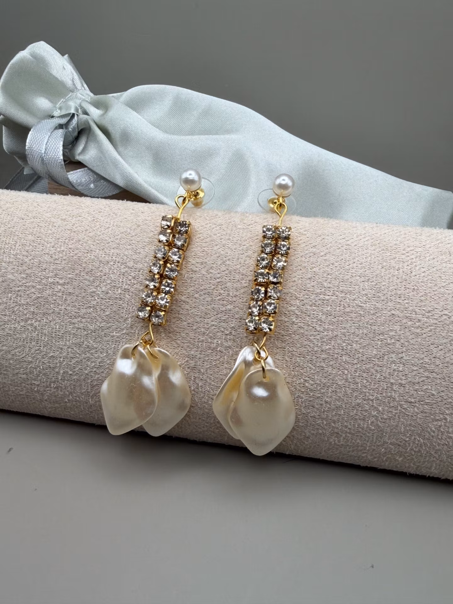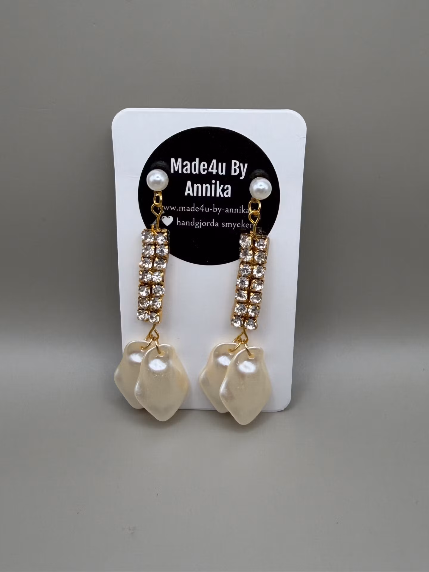 Vackra dinglande örhängen med två hängande elfenbensvita löv, kristallstrass och pärla.