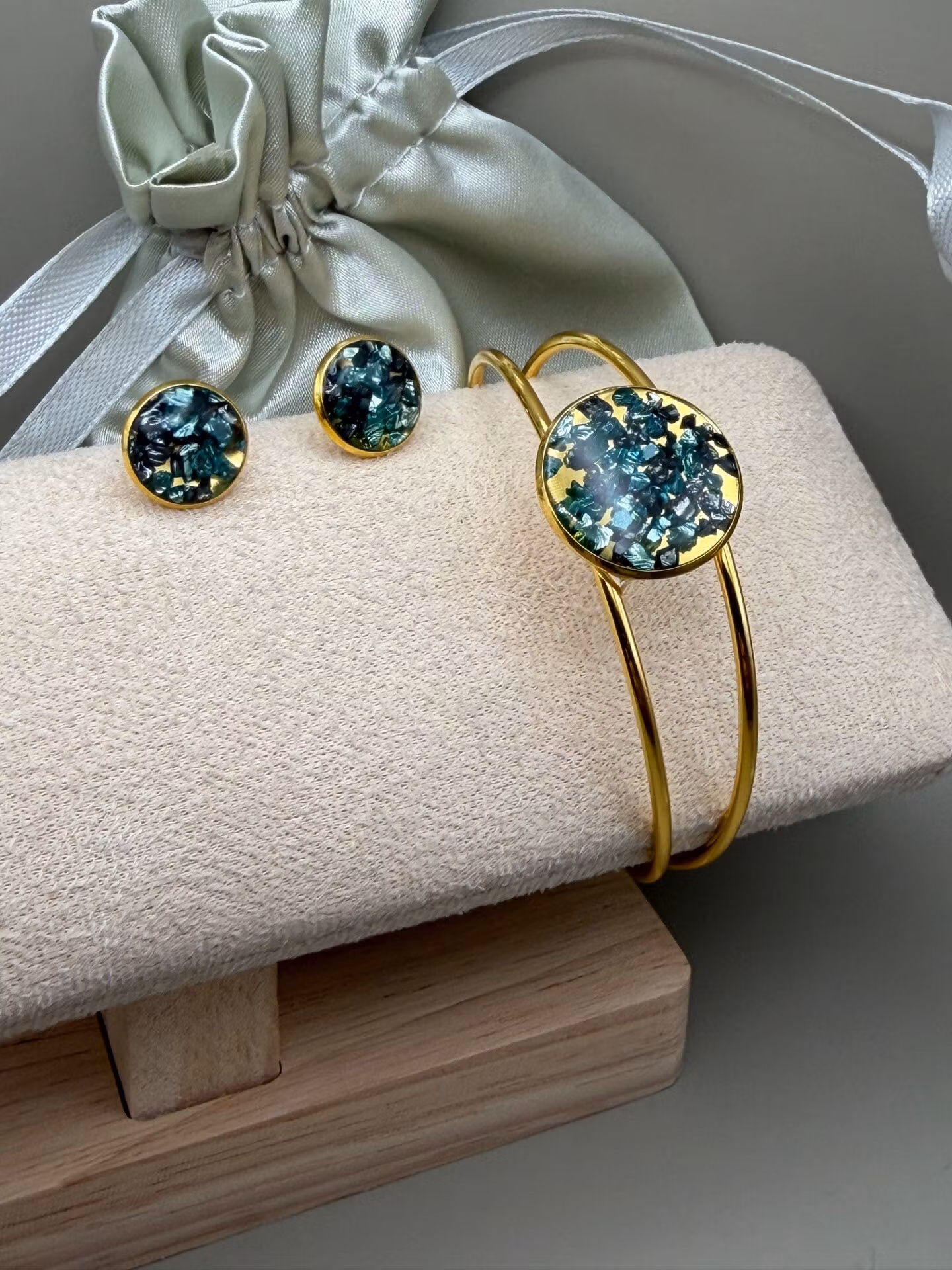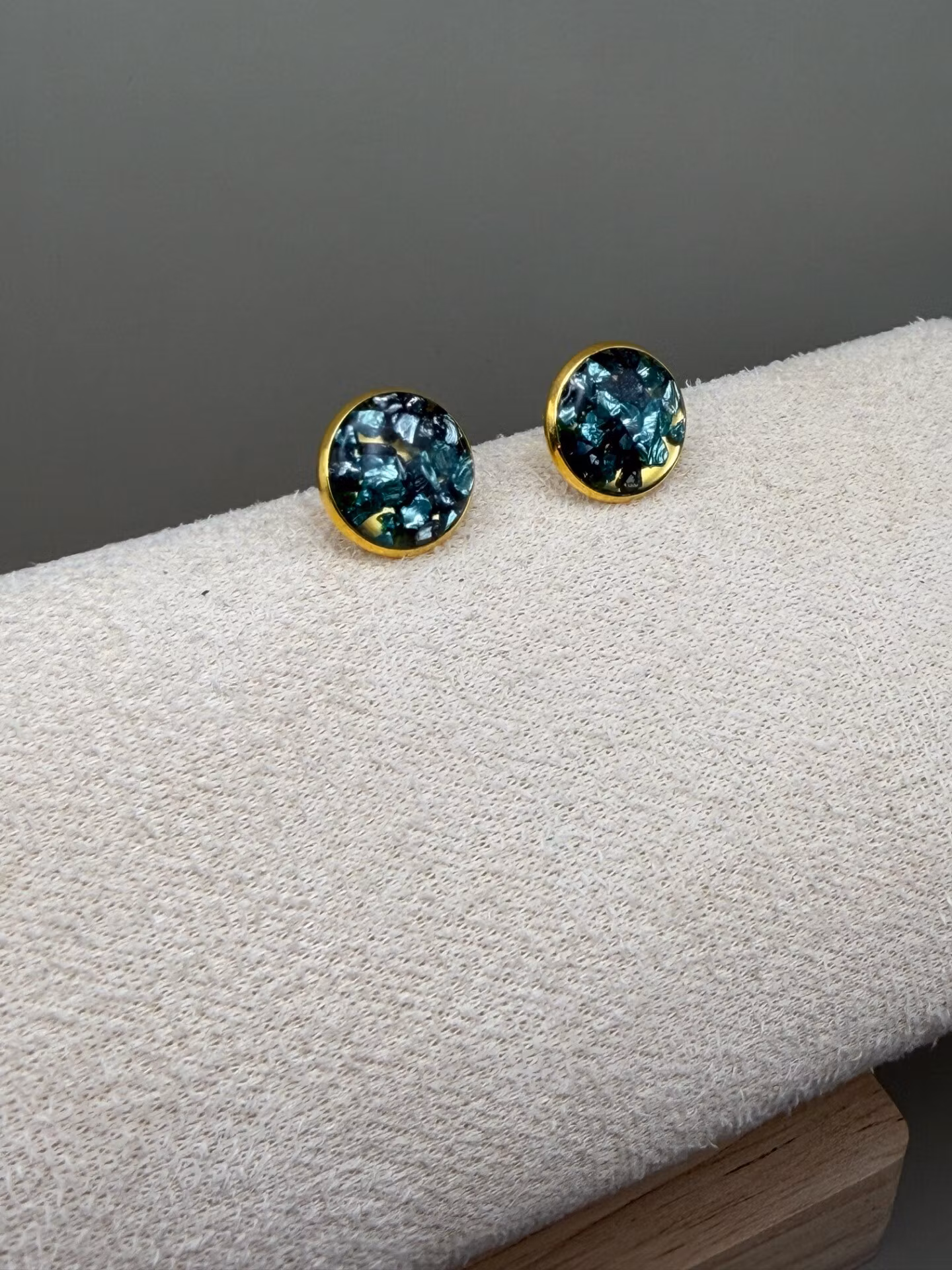 Vackra runda guldfärgade stiftörhängen i nyanser av turkost och grågrönt glaskross, lagd i kristallklar resin, gjuten för hand för att ge en unik och exklusiv finish.