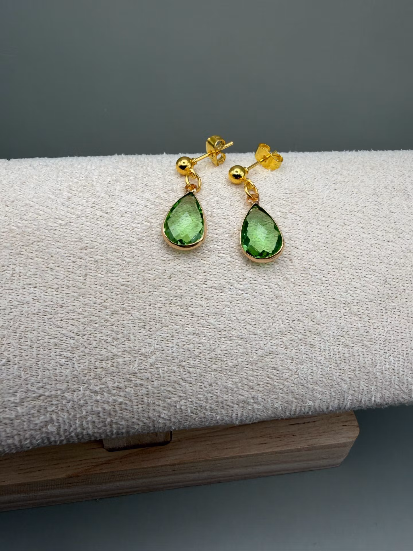 Vackra, nätta guldörhängen med vacker grön droppformad berlock i glas.