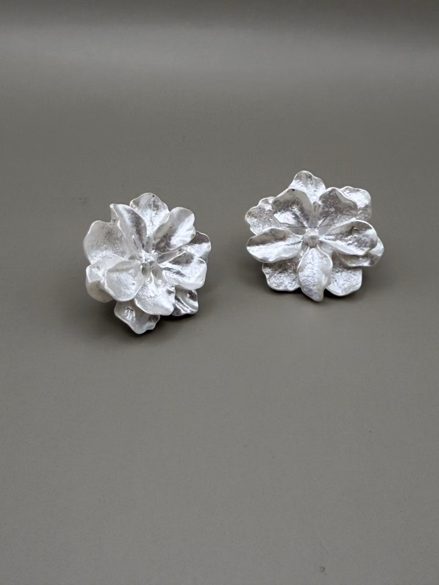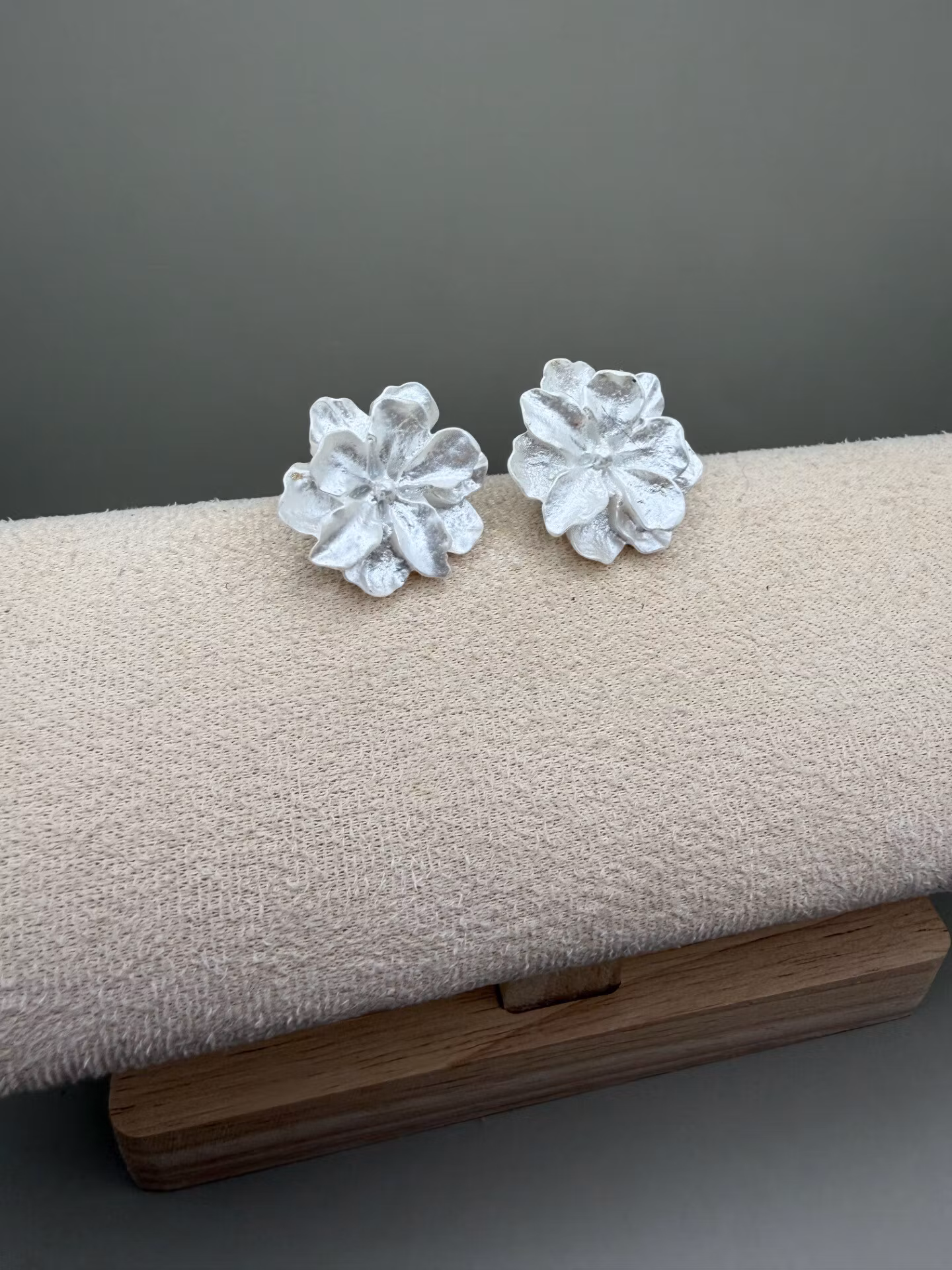 Stora statement-örhängen i form av en skimrande, vackert kritvit blomma som fångar ljuset.