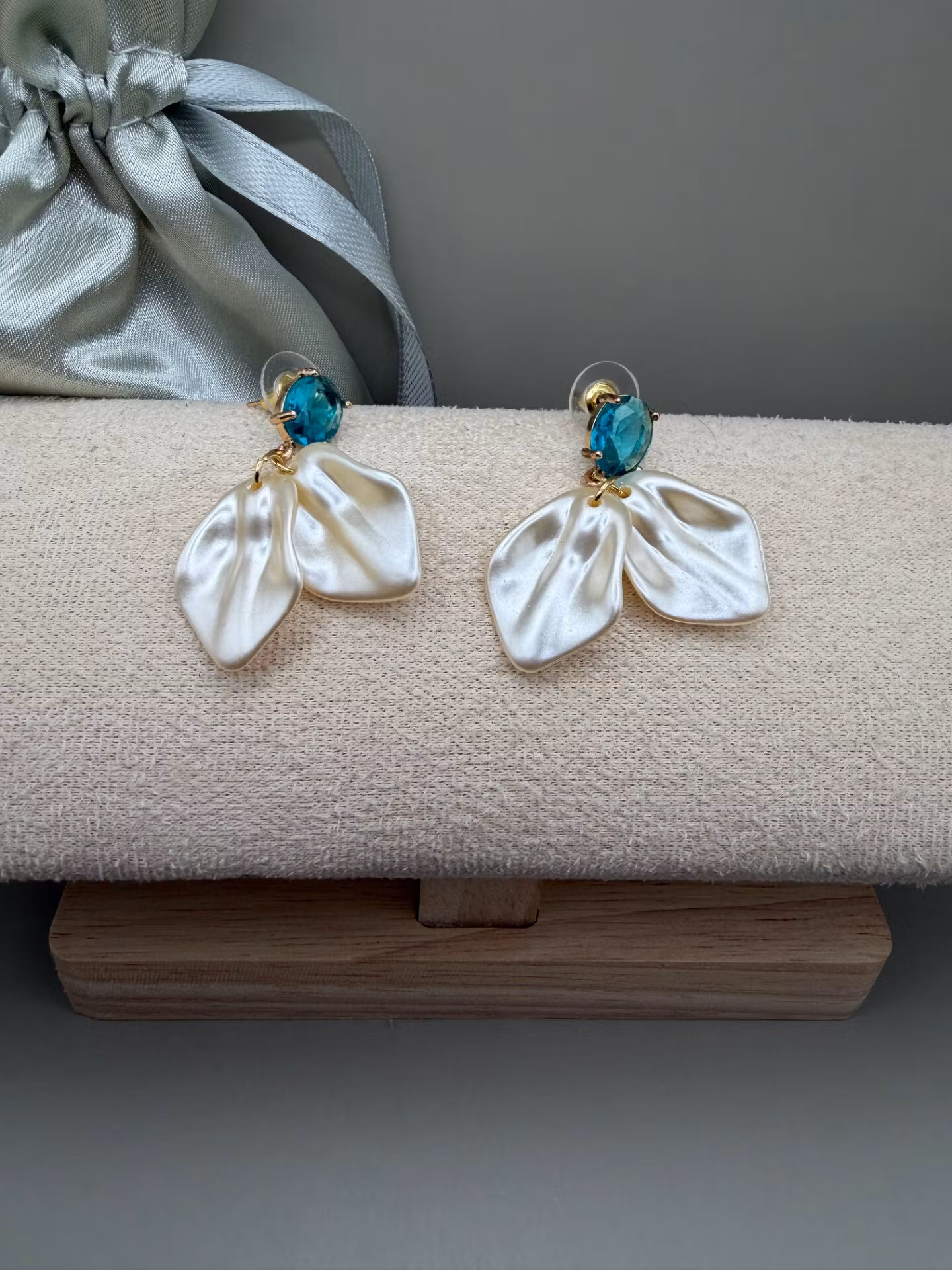Eleganta örhängen med turkosfärgad vattendropformat kristallglasdekorativt hänge av benvita blad.