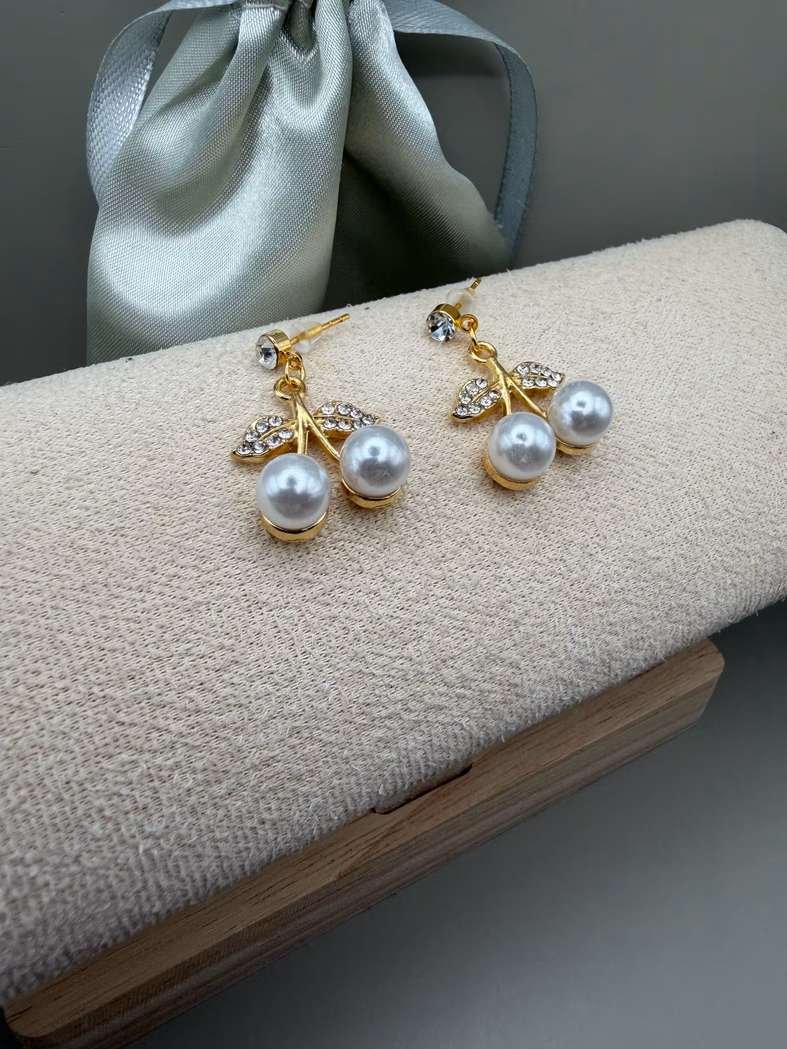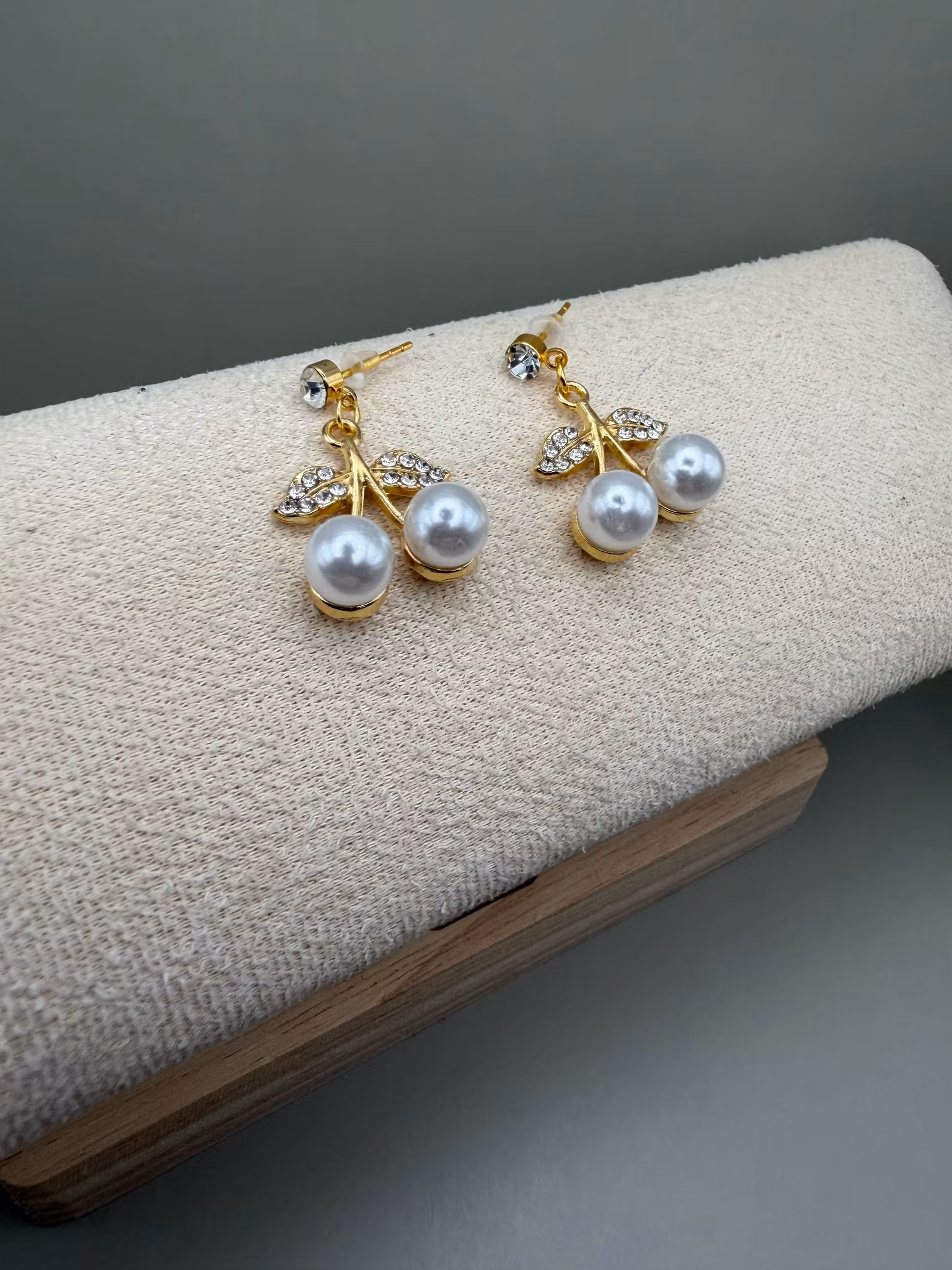 Eleganta och festliga guldfärgade pärlörhängen i stiftmodell, prydda med gnistrande cubic zirconia. De avslutas med en hängande körsbärsberlock dekorerad med vita pärlor och skimrande strass, vilket ger ett lekfullt men sofistikerat uttryck.
