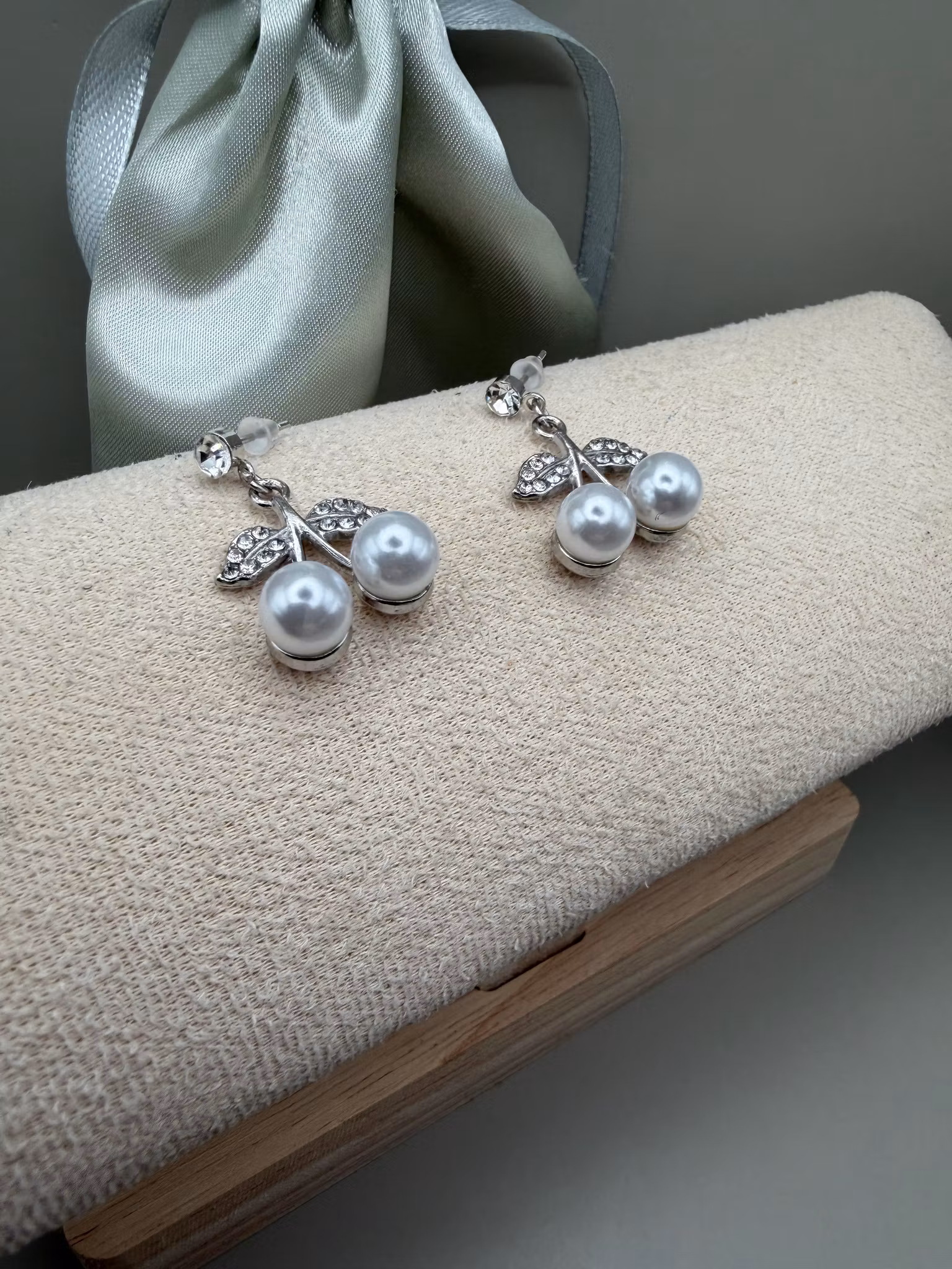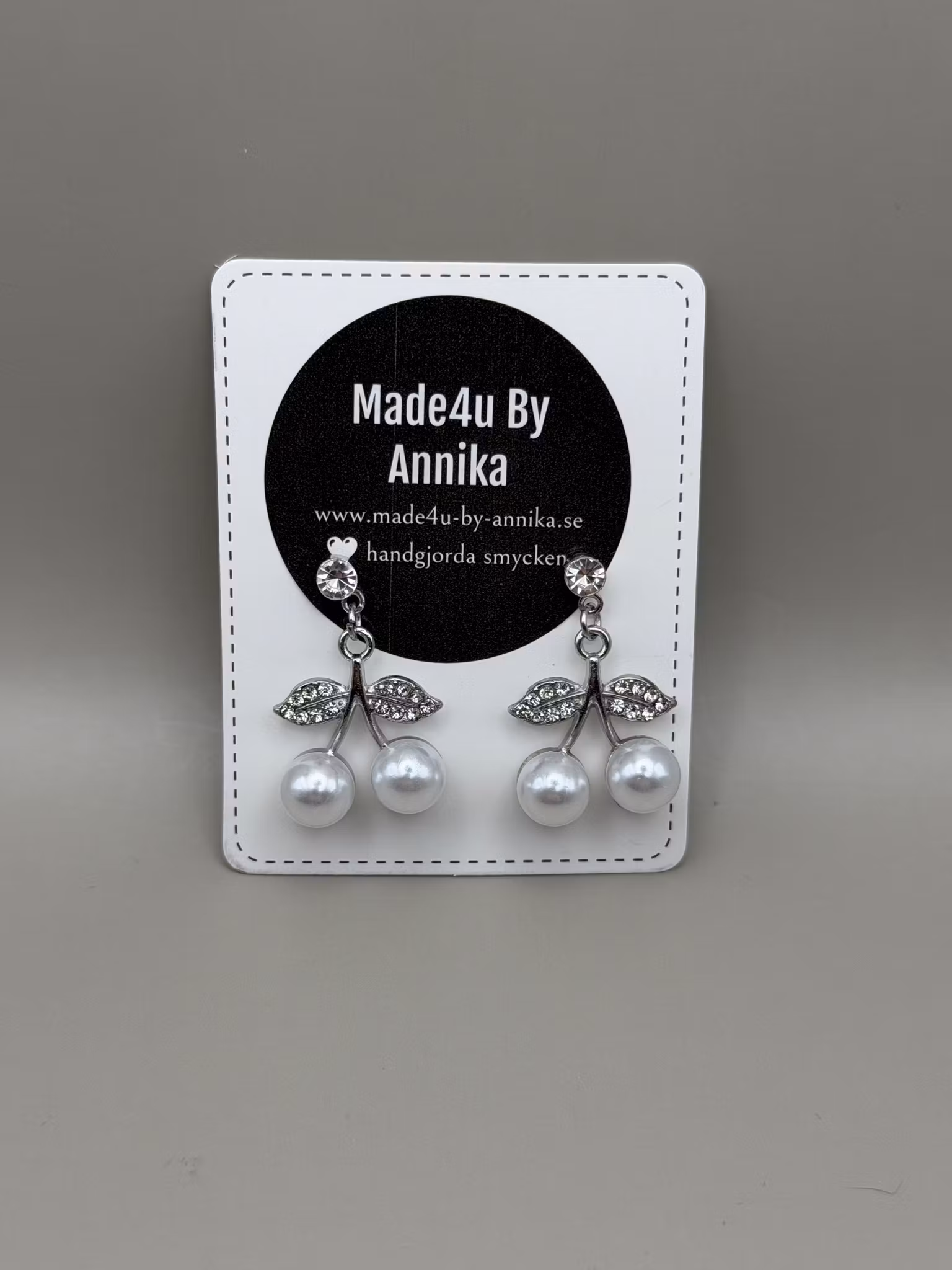 Eleganta och festliga silverfärgade pärlörhängen i stiftmodell, prydda med gnistrande cubic zirconia. De avslutas med en hängande körsbärsberlock dekorerad med vita pärlor och skimrande strass, vilket ger ett lekfullt men sofistikerat uttryck.