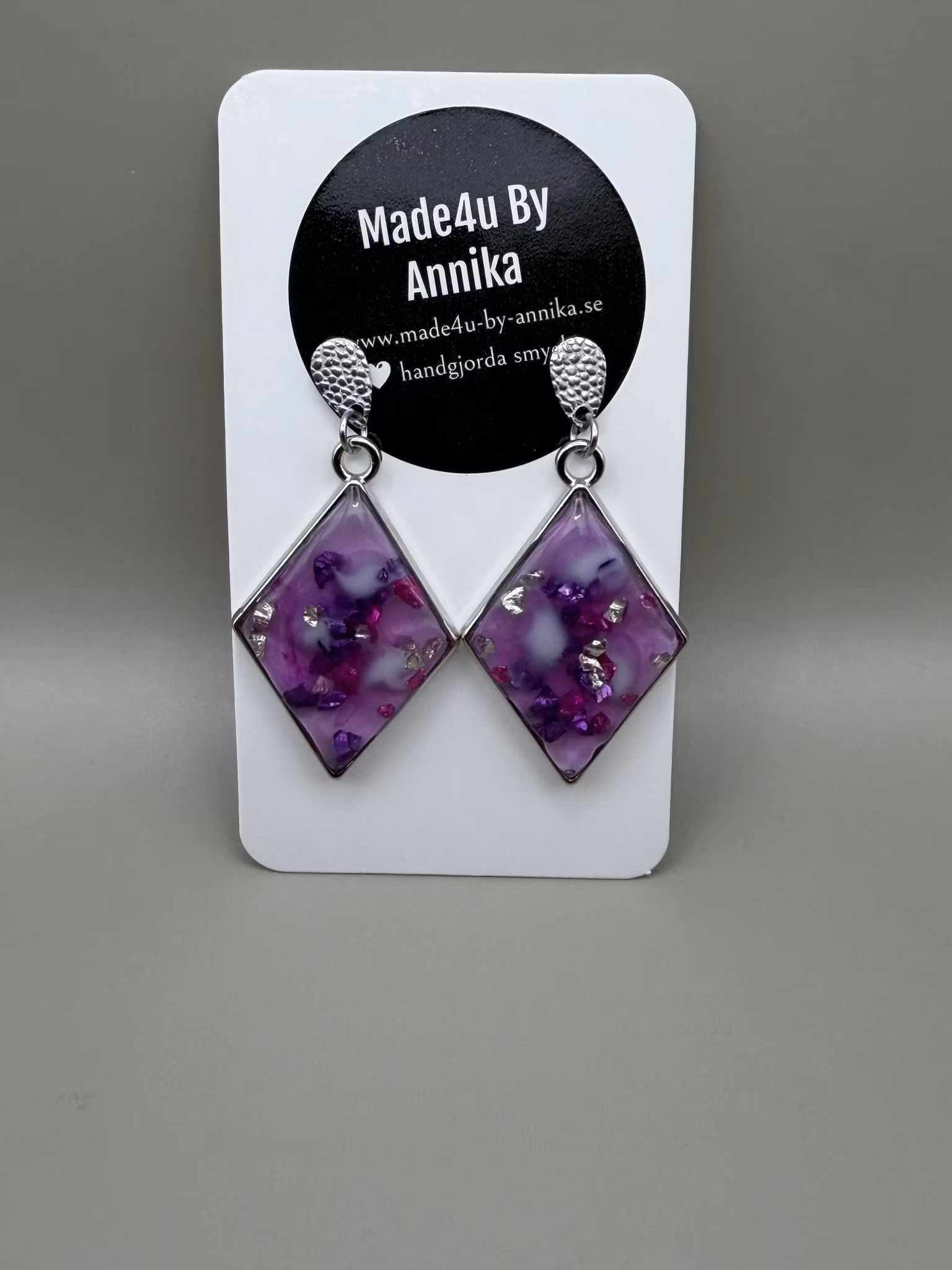 Örhängen i mjuka ljuslila toner med rosa och lila skimrande glaskross som ger ett levande och ljusreflekterande uttryck.
