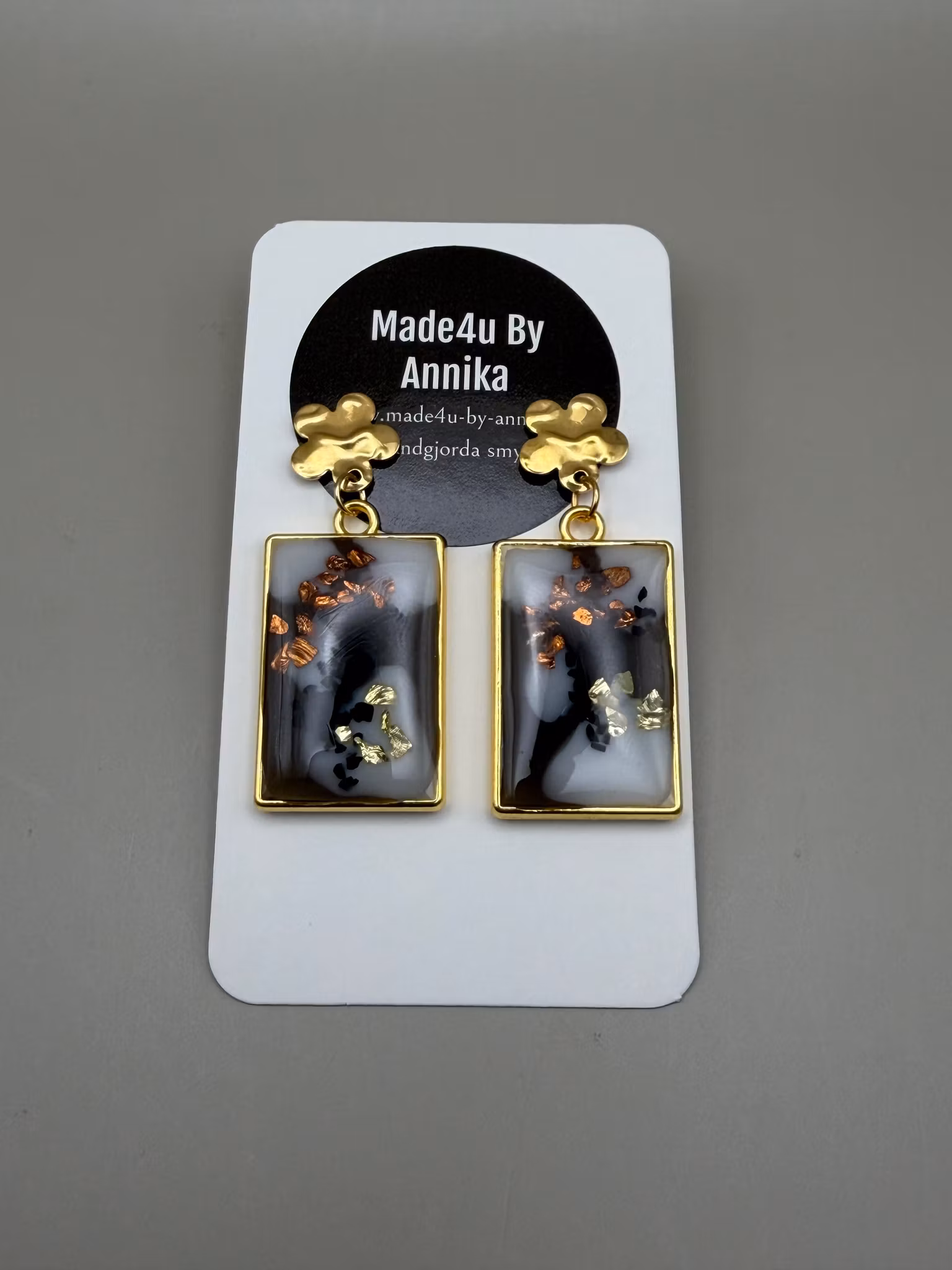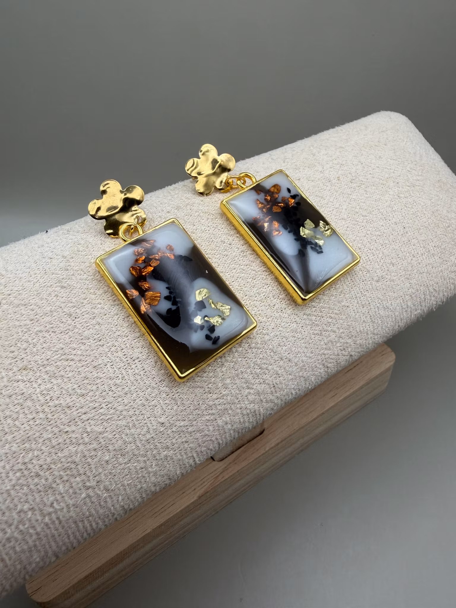 Örhängen i mjuka toner av svart och vitt med en fläckig effekt, kombinerat med rostfärgade, svarta och guldskimrande inslag av glaskross som ger ett levande och ljusreflekterande uttryck.