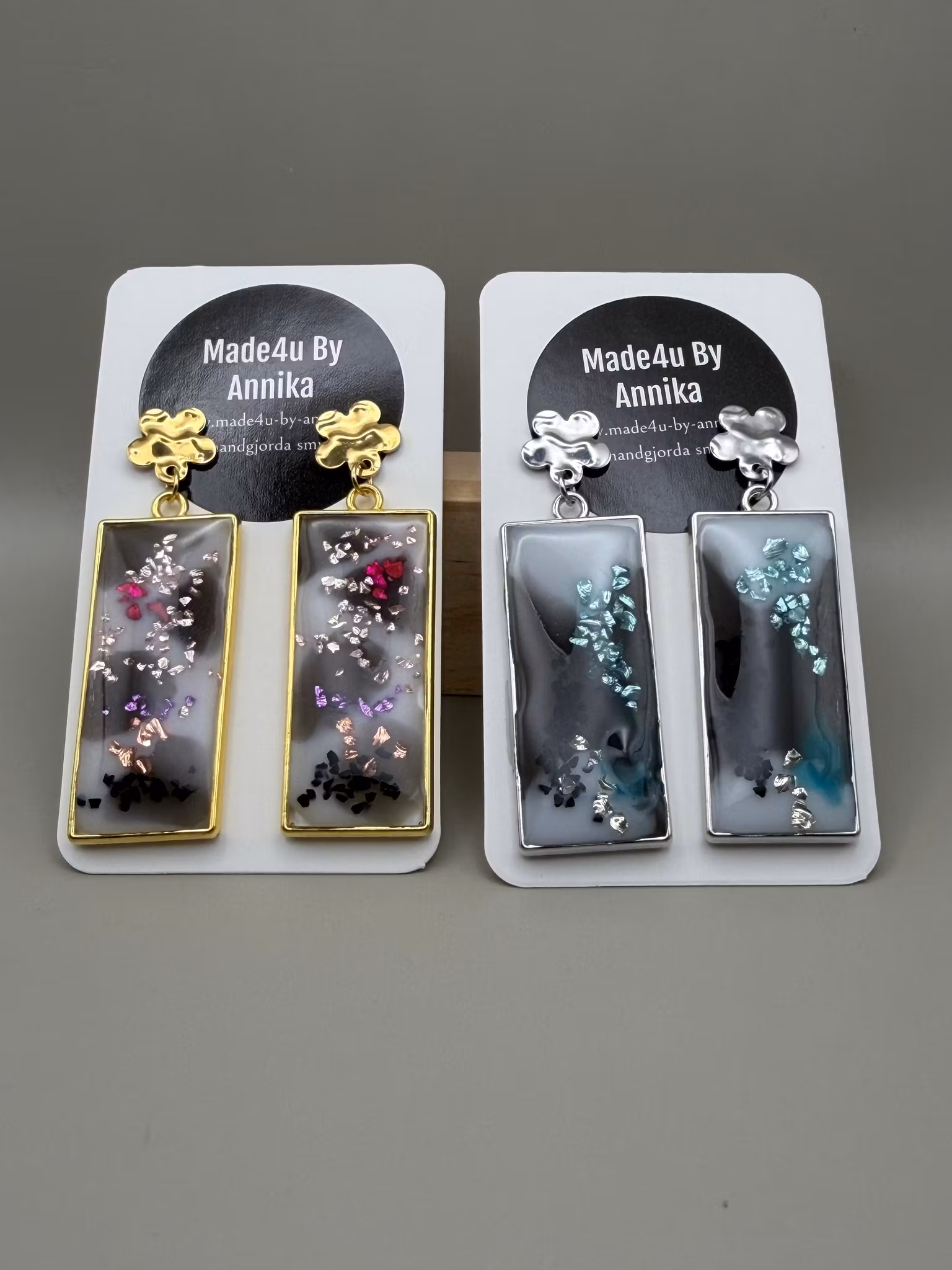 Den klara resinen skapar en glaslik finish med vacker lyster, medan det guldfärgade stiftet i blomform tillför en elegant och unik detalj.