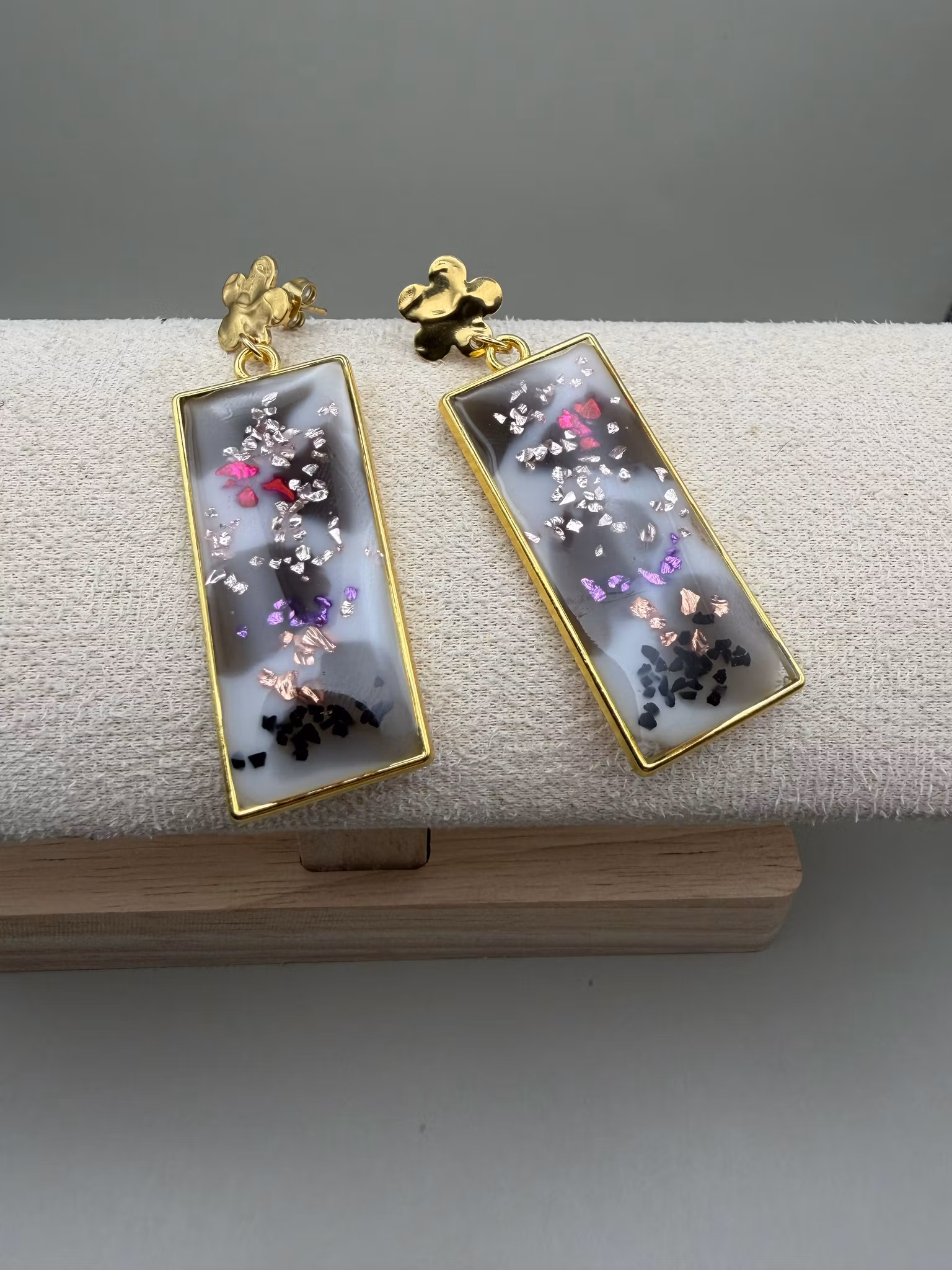 Örhängen i mjuka toner av svart och vitt med en fläckig effekt, kombinerat med rosafärgade, svarta och silver- och guldskimrande inslag av glaskross som ger ett levande och ljusreflekterande uttryck.