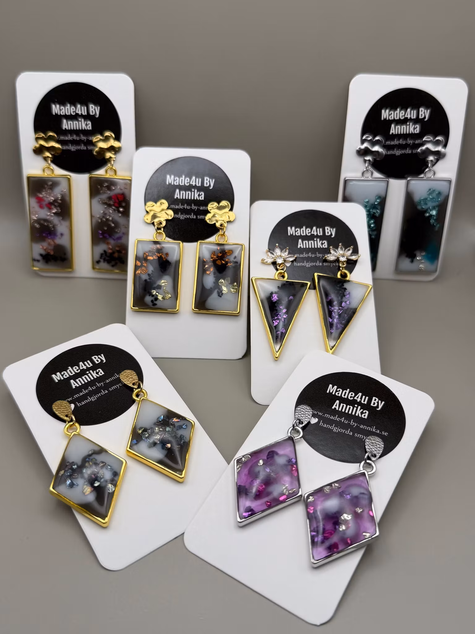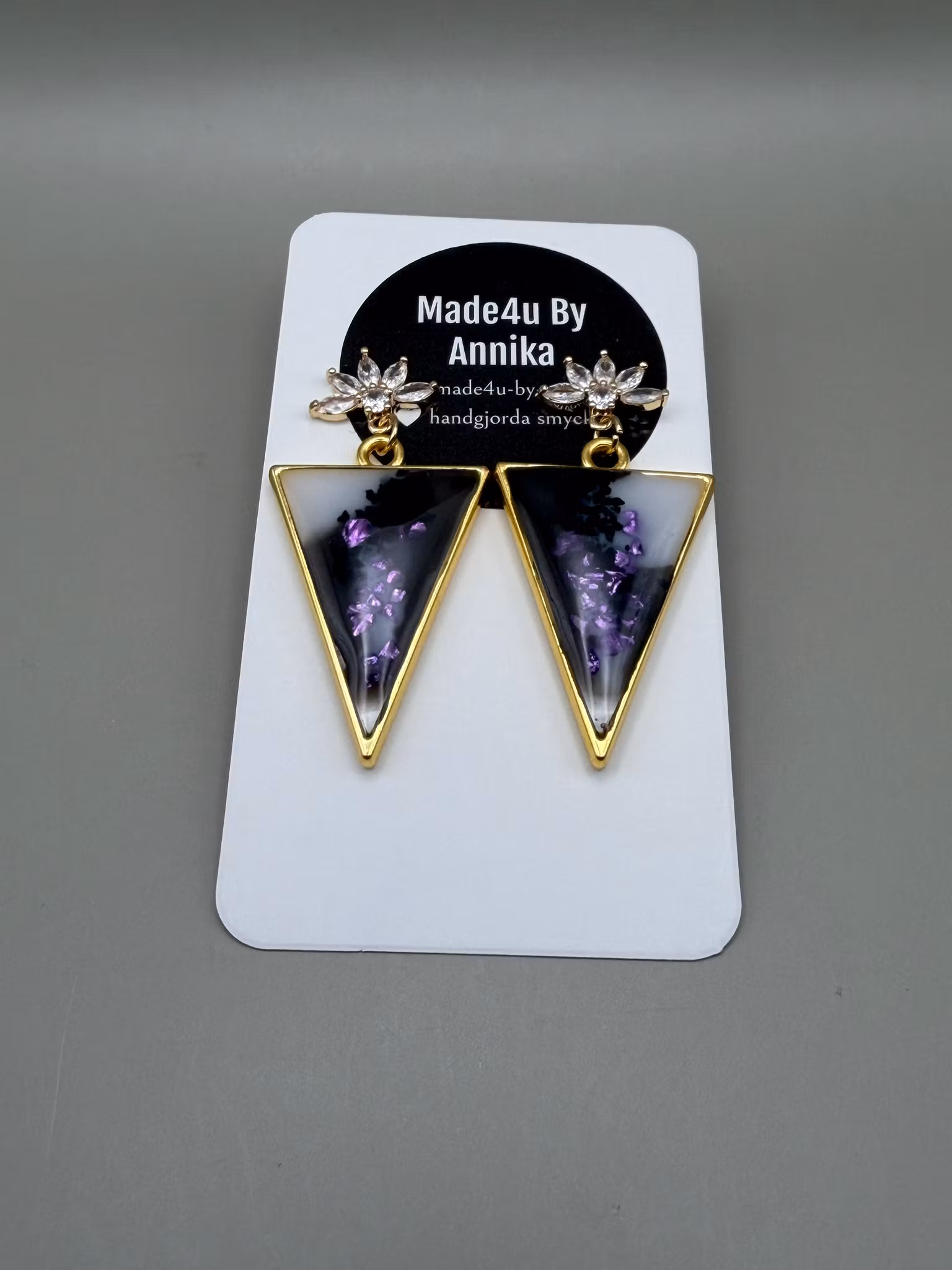 Örhängen i mjuka toner av svart och vitt med en fläckig effekt, kombinerat med lilafärgat och svartskimrande inslag av glaskross som ger ett levande och ljusref