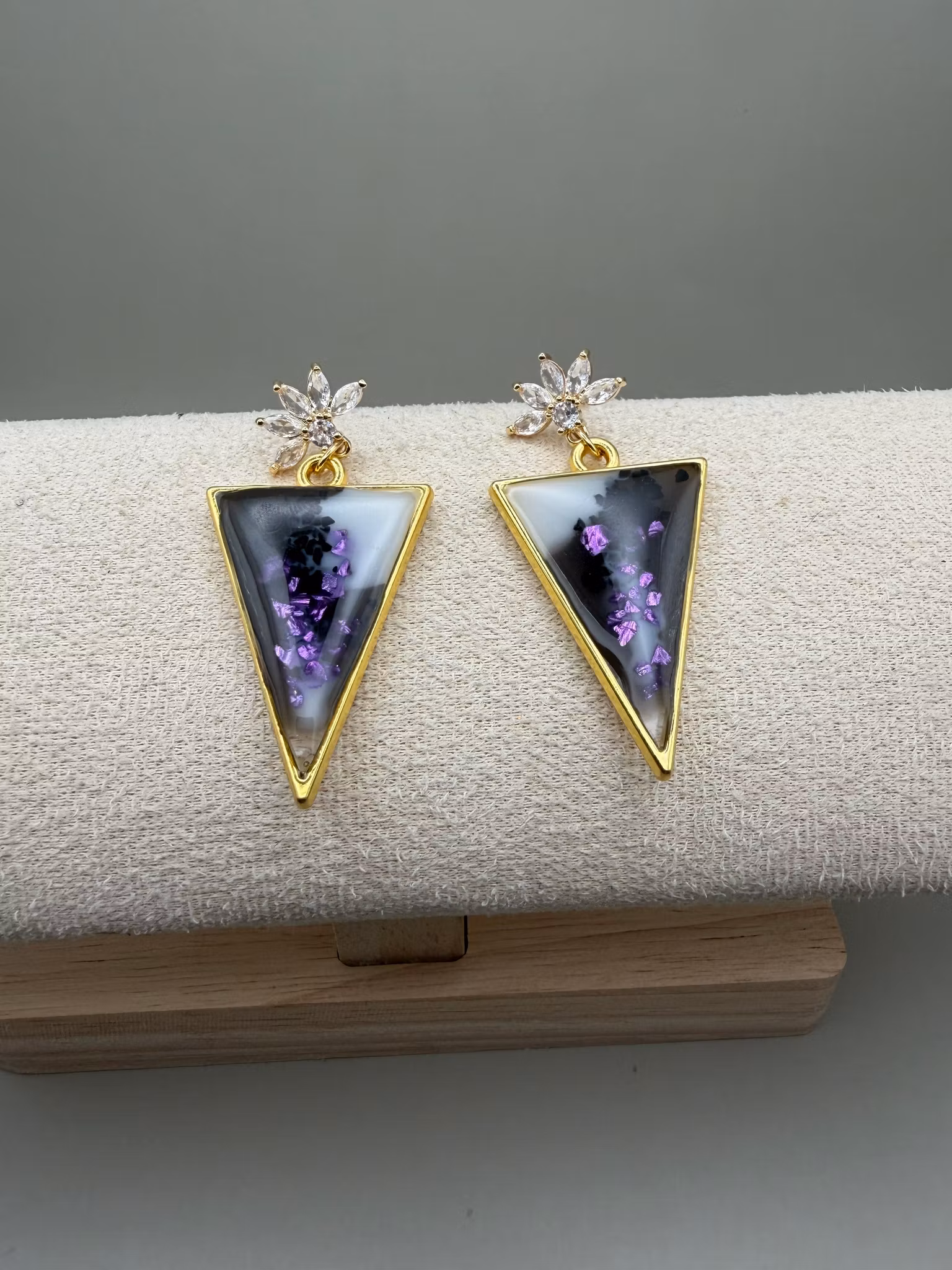 Örhängen i mjuka toner av svart och vitt med en fläckig effekt, kombinerat med lilafärgat och svartskimrande inslag av glaskross som ger ett levande och ljusreflekterande uttryck.