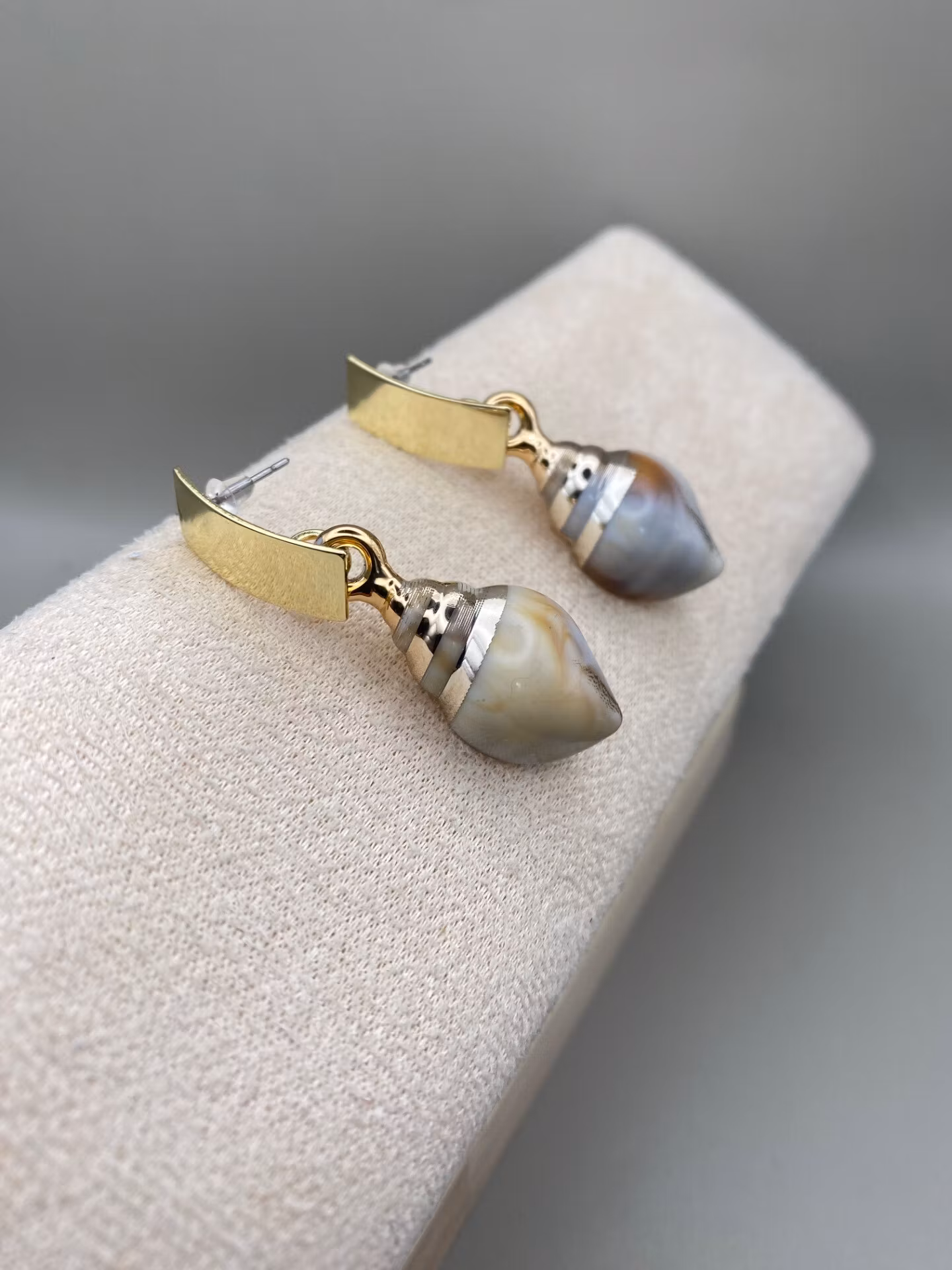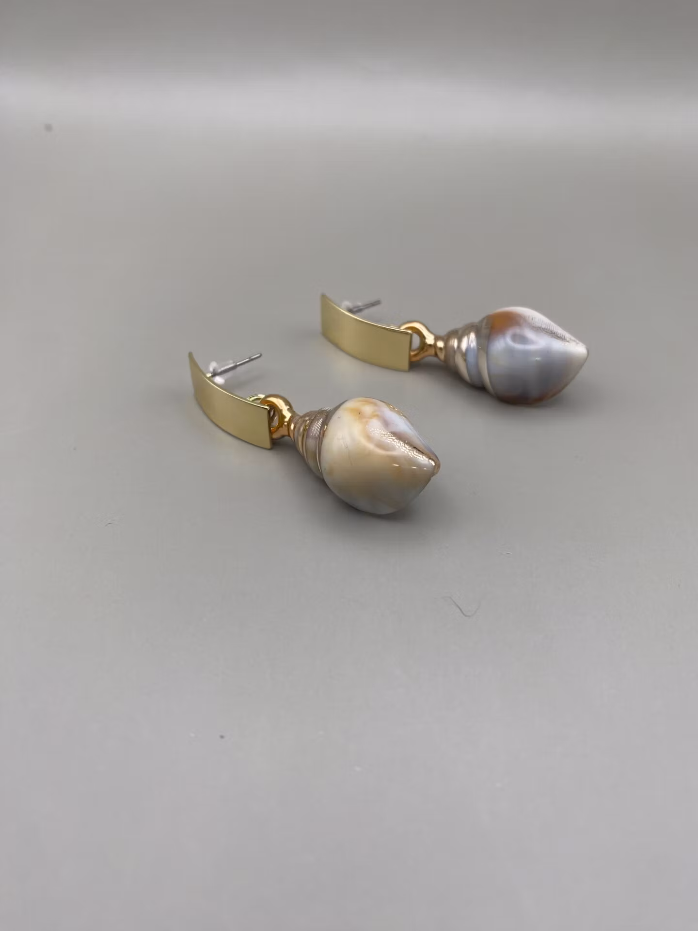 Vackra dekorativa örhängen i guldfärgade toner och beigt, stora guldfärgade lätt böjda brickor med hängande berlock i form av en snäcka.
