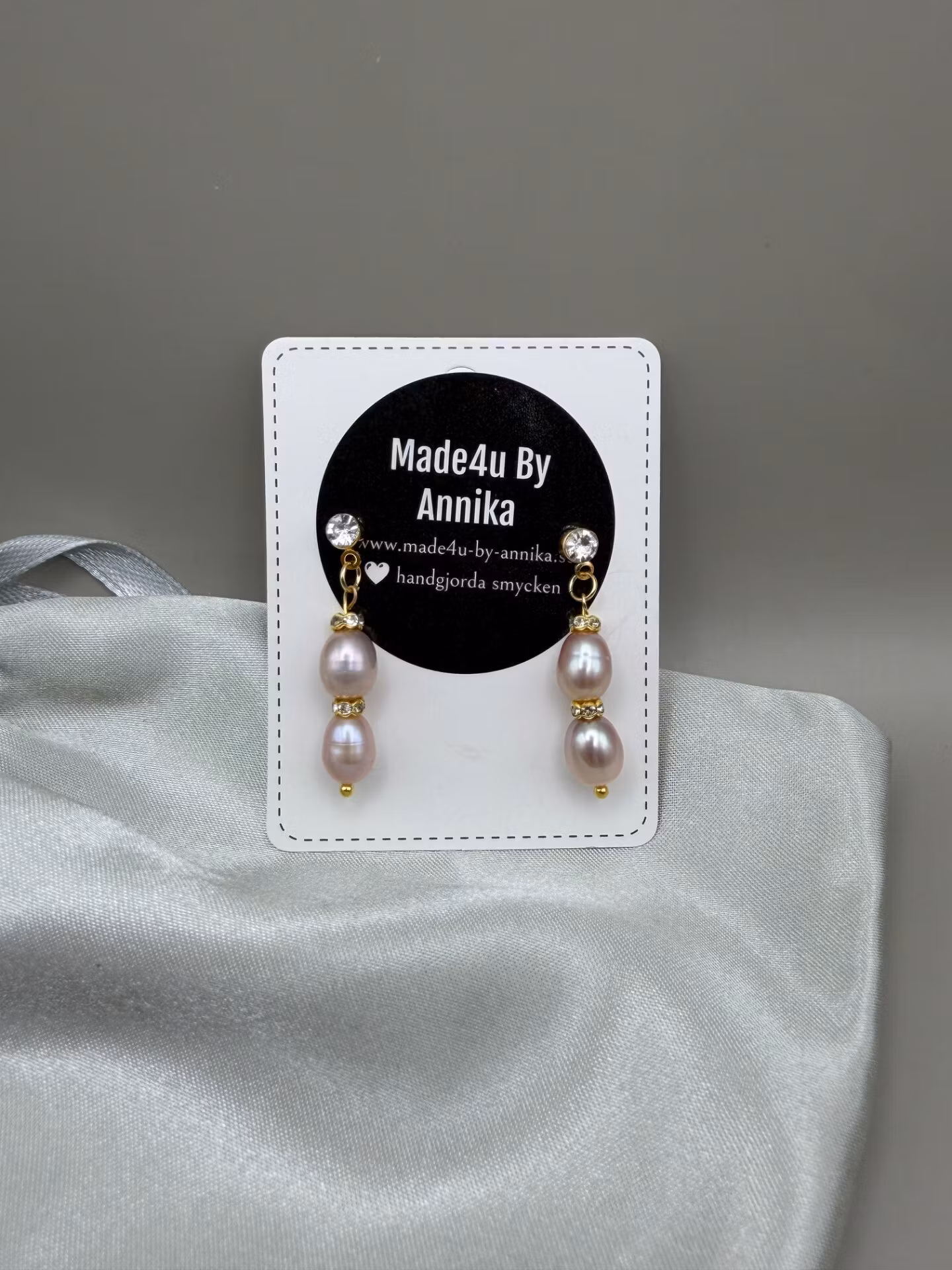 Guldfärgade örhängen som kombinerar gnistrande rhinestones med två vackra ljuslila sötvattenpärlor av hög kvalitet.