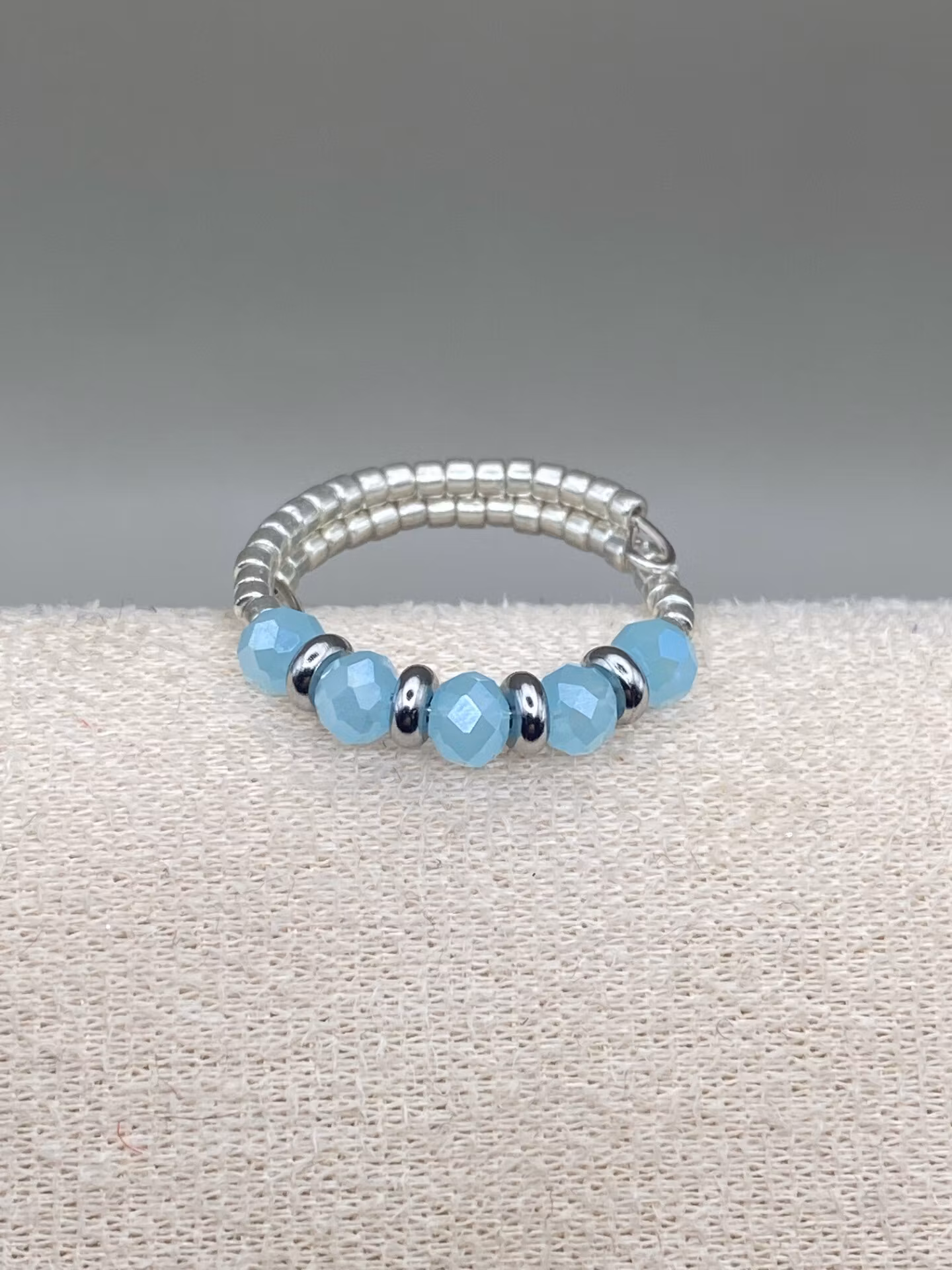 Vacker spiralring i enkelradigt mönster av små glaspärlor runt om, släta eller facetterade pärlor i blickfånget och med små detaljer som gör det lilla extra. Skriv dina önskemål i meddelandefältet vid beställningen.