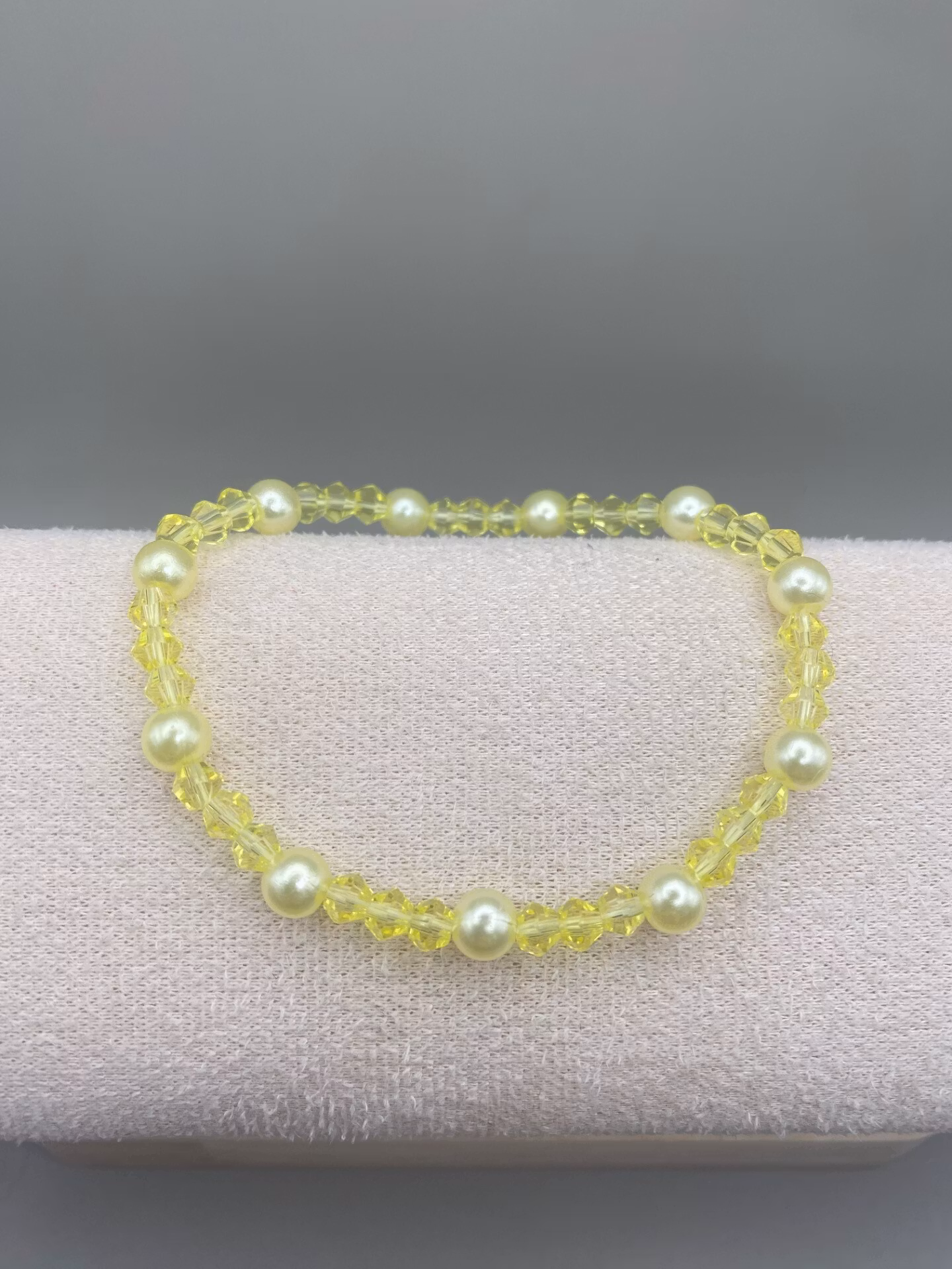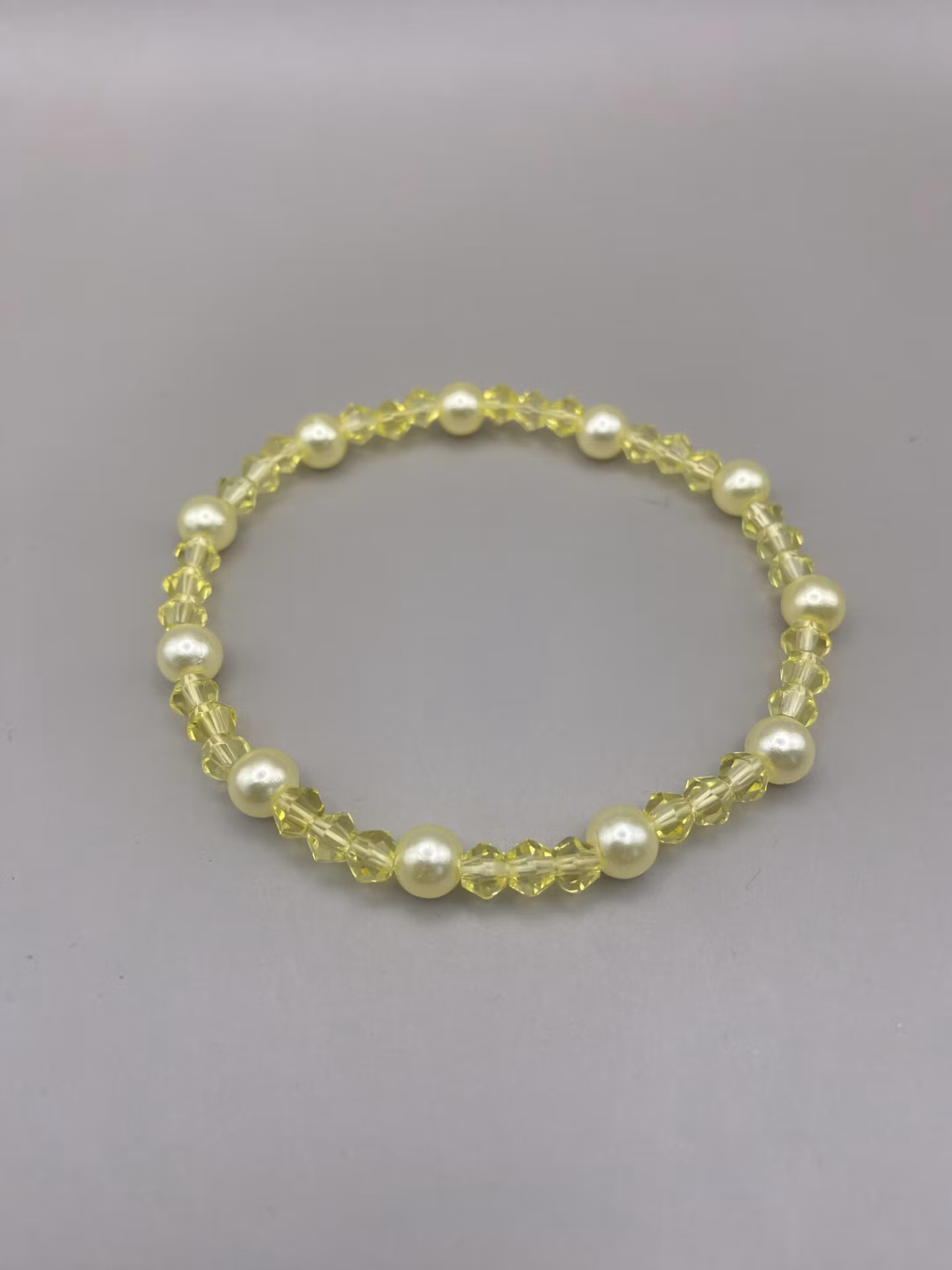 Härligt lekfullt armband i gula facetterade glaskristallpärlor i varvat fint mönster med kritvita högblanka pärlor.