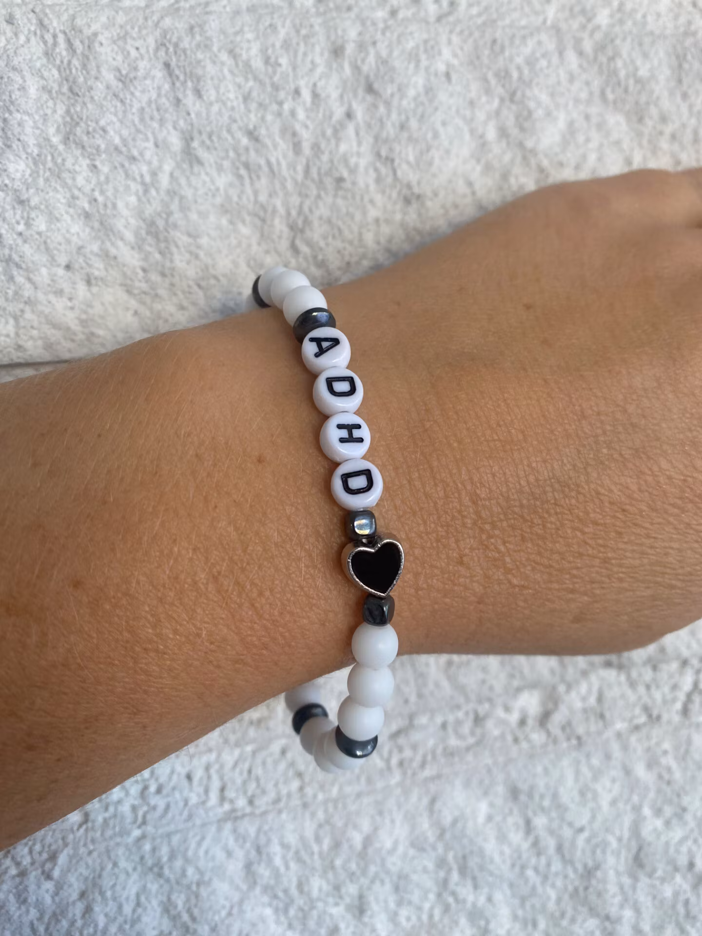 Stiligt armband med budskap. ADHD. Vita pärlor med lite tyngd varvat med mörkt stålgrå hematitpärloroch ett hjärta. Passar både män och kvinnor.