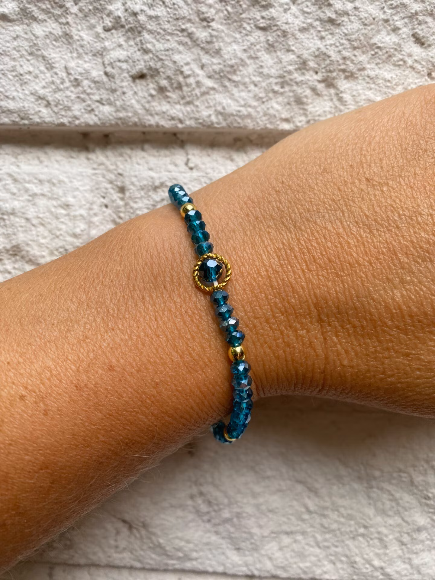 Härligt lekfullt armband i varvat fint mönster av små turkosa glaskristallpärlor och små guldfärgade pärlor, guldfärgad inramning av större turkos pärla i blickfånget.