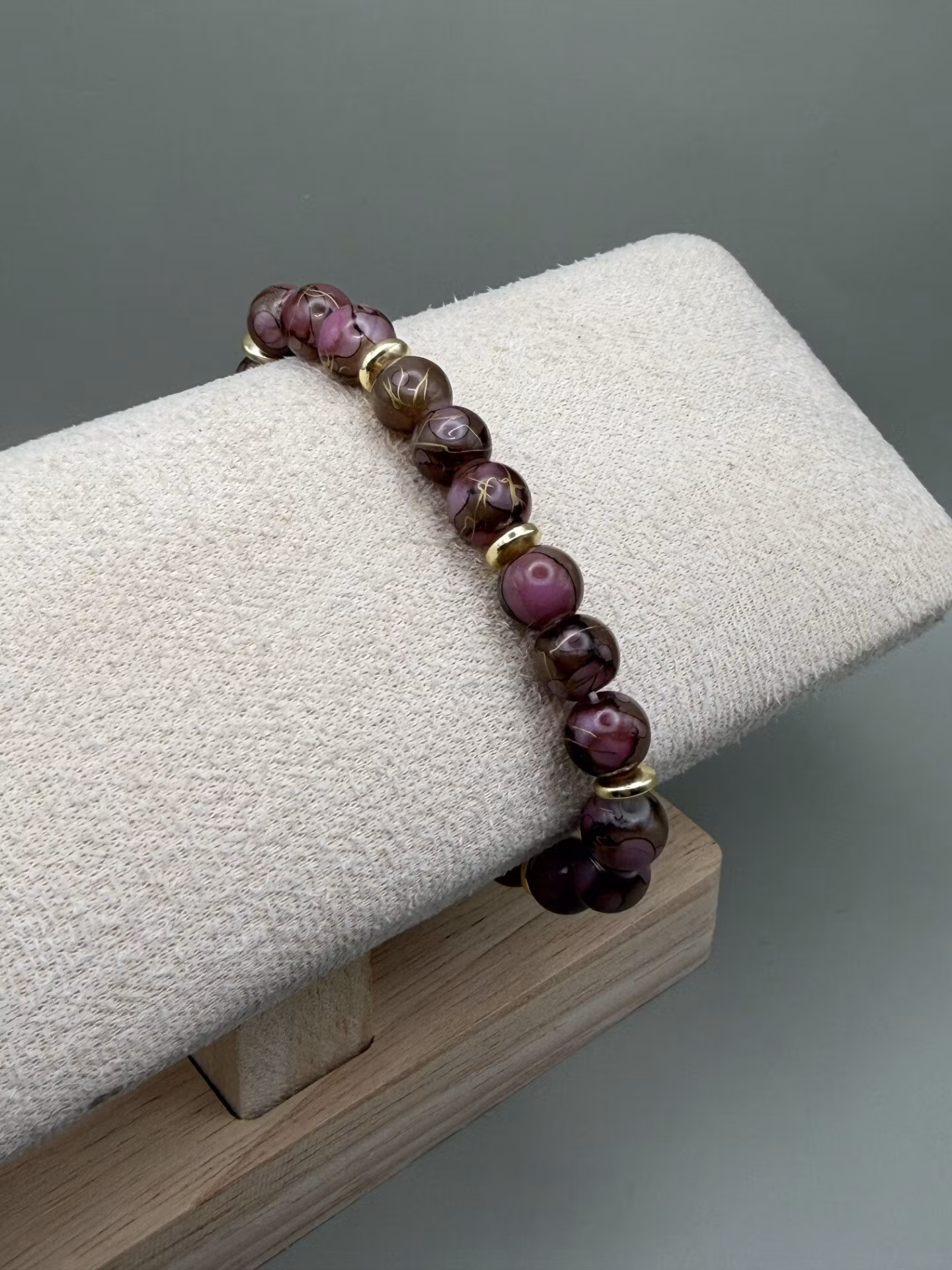 Ett handgjort armband med lila-rosa mellerade stenar som känns tyngdfulla och lyxiga mot handleden. De 18K guldpläterade hematitpärlorna ger en elegant och glit