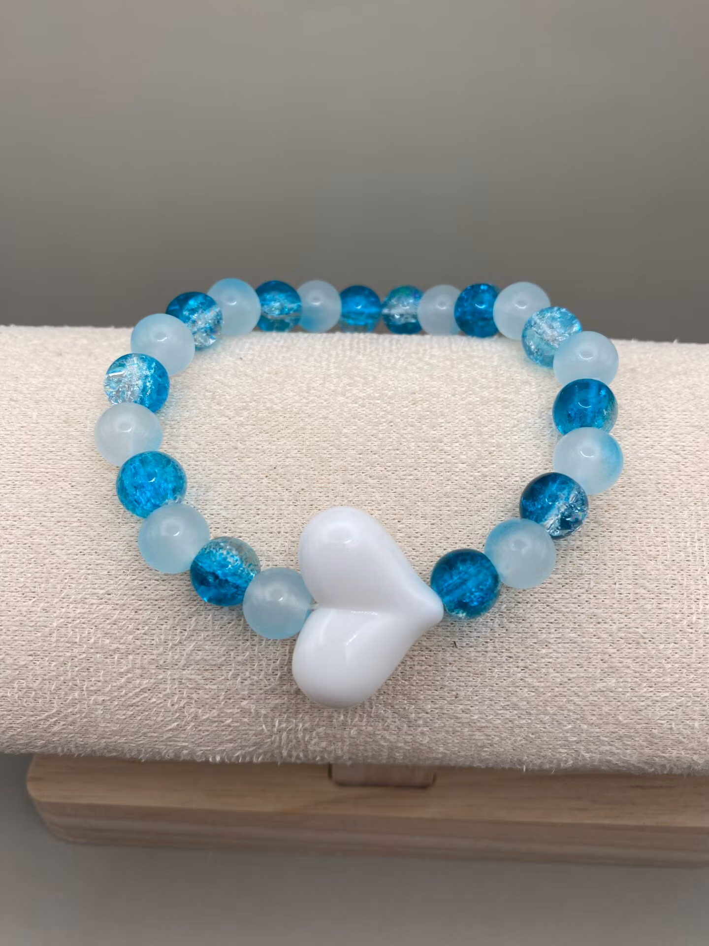 Härligt lekfullt armband i vackra turkosmellerade glaspärlor varvat med ljusblå lite dimmiga glaspärlor och stort dekorativt vitt hjärta i blickfånget.Pärlor: 8