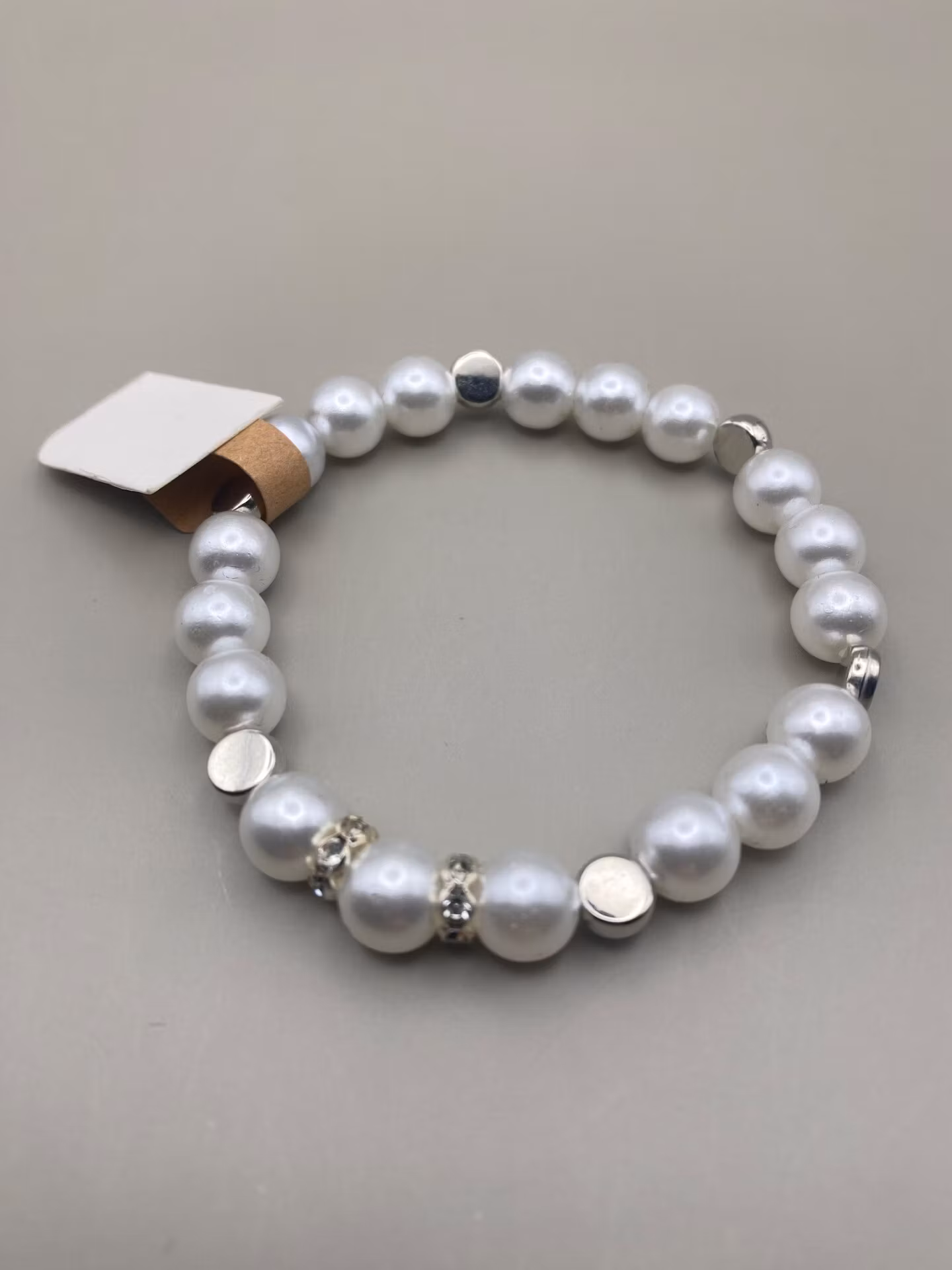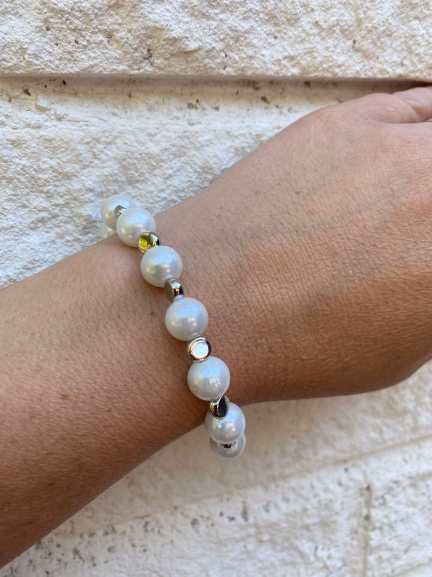 Armband av vita pärlor varvat med silverfärgade platta pärlor