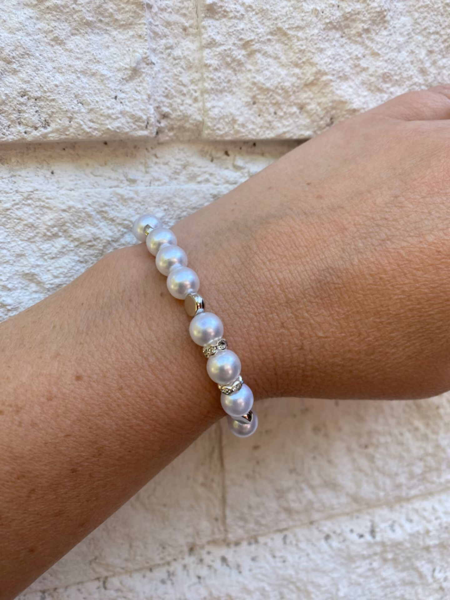 Armband av kritvita pärlor varvat med silverfärgade platta pärlor och strass