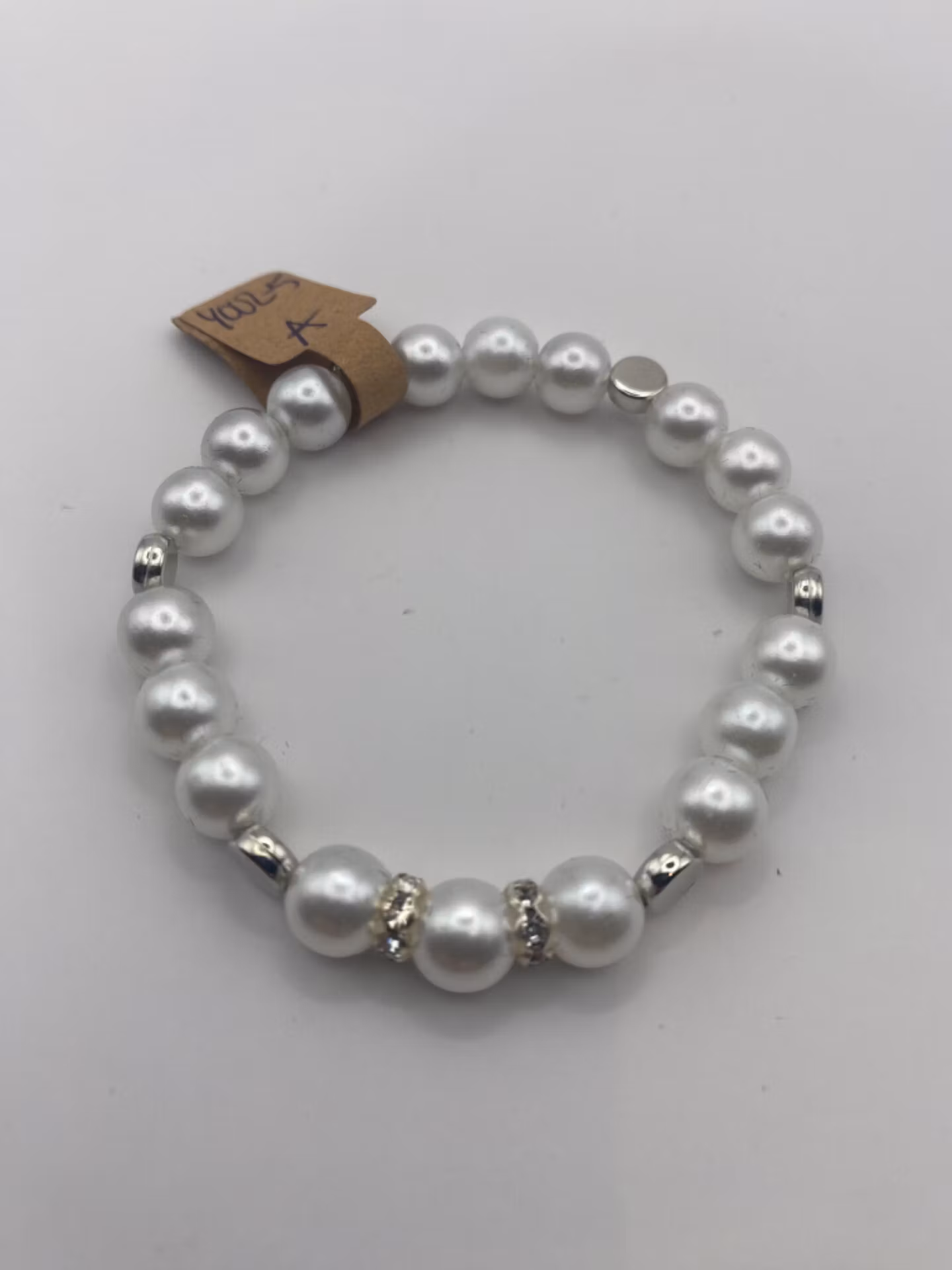 Armband av kritvita pärlor varvat med silverfärgade platta pärlor och strassPärlor 8mmVisas produkten "Tillfälligt slut" efter att du lagt den i din kundkorg, b